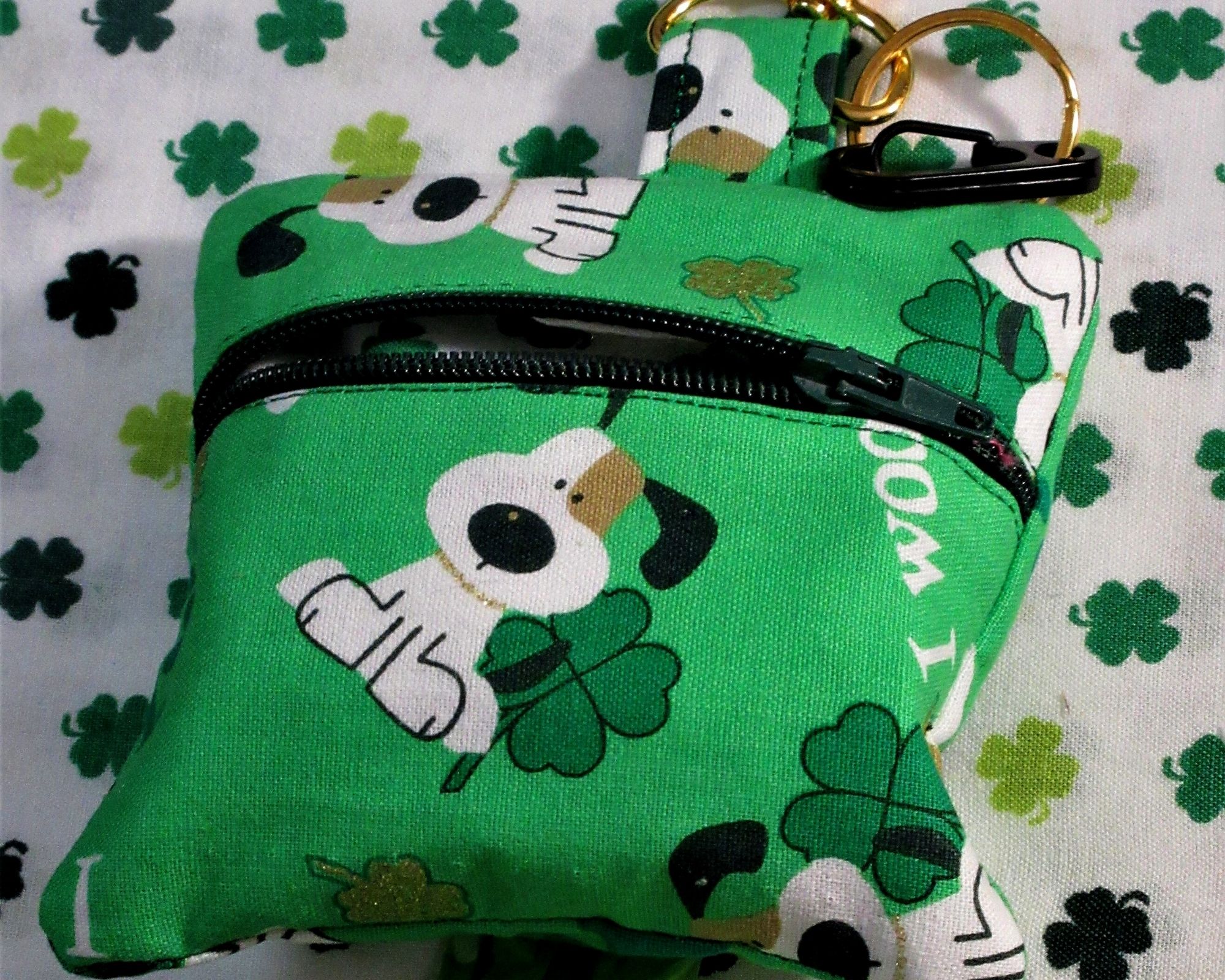 We found the I woof you fabric with pretty shamrocks - added green shamrock fabric and made these bags. We decided to do both sizes in this pattern as the bone shape would be fun. Of course, we used gold tone hardware to help reach the pot of gold!