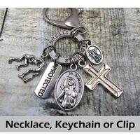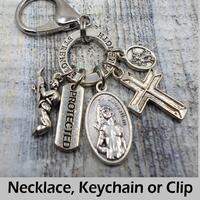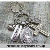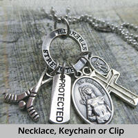 St. Sebastian, Patron Saint of Baseball, Strength based Lucky Charm Amulet Keychain, Purse Clip or Necklace. Dangling from a "Strength" ring is a finely detailed Italian made medal, Recessed Cross, Protected Charm, Baseball Bat Charm and Mini Archangel Michael Charm. Available as a Necklace, Keychain or Backpack-Purse Clip. We offer high quality stainless steel Link Chain Necklaces with Lobster Clasp or Stainless Steel Ball Chain Style Necklaces with many lengths to choose from. Optional Add-On Initial Charm and Swarovski Crystal Birthstone Drop are available for purchase.