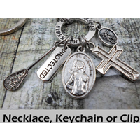 Materials: Italian Pewter: Saint Medal (1" tall). Silver Plate: Purse-Backpack Clip and Keychain, Message Ring (3/4" Diameter) Cross and Charms. (zinc metal alloy, lead and nickel free). Stainless Steel: Link Chain Necklace, Ball Chain Necklace, Clasps and Rings. Thoughtfully packaged and "Handmade with Love". Thank You For Stopping by Elation by Steffany.