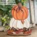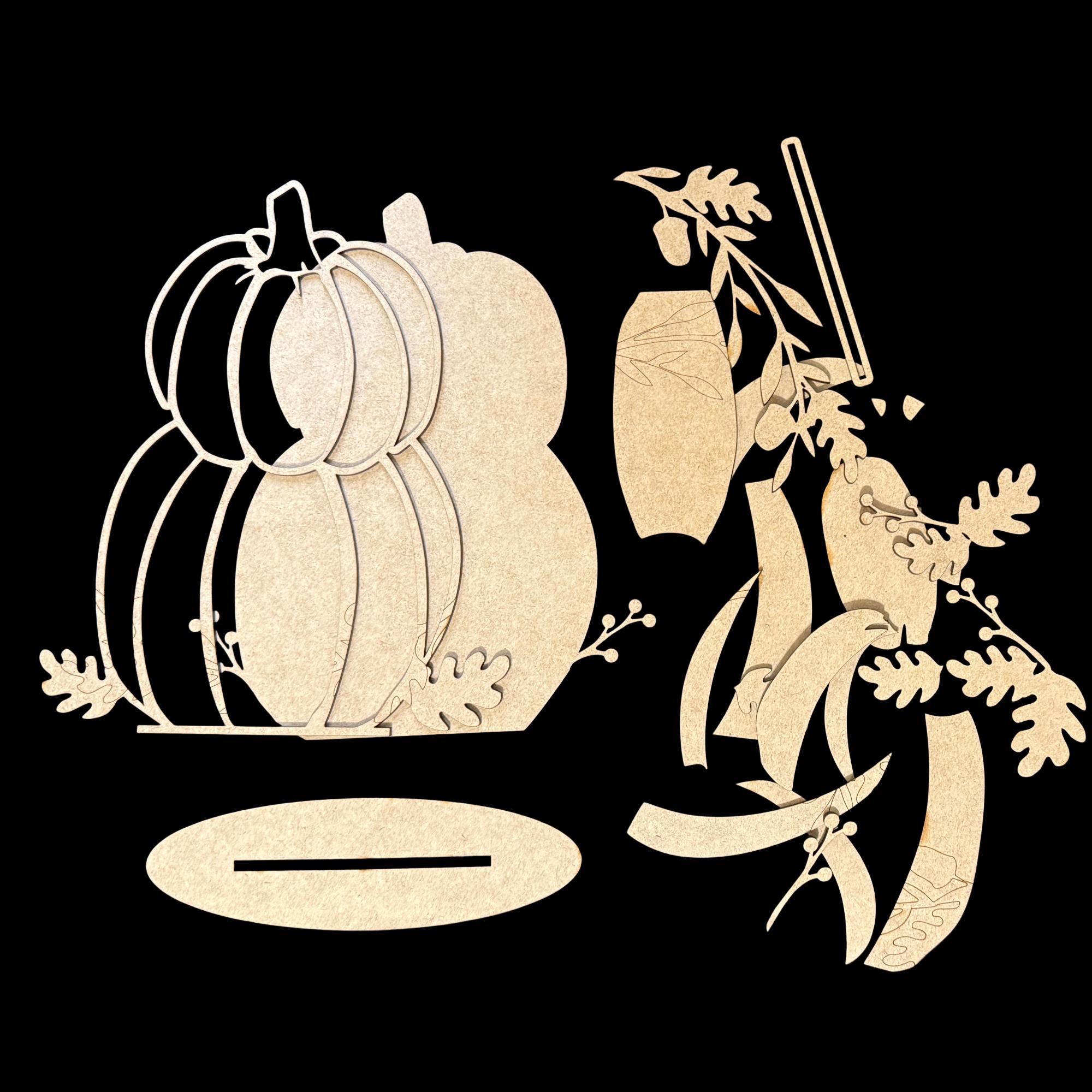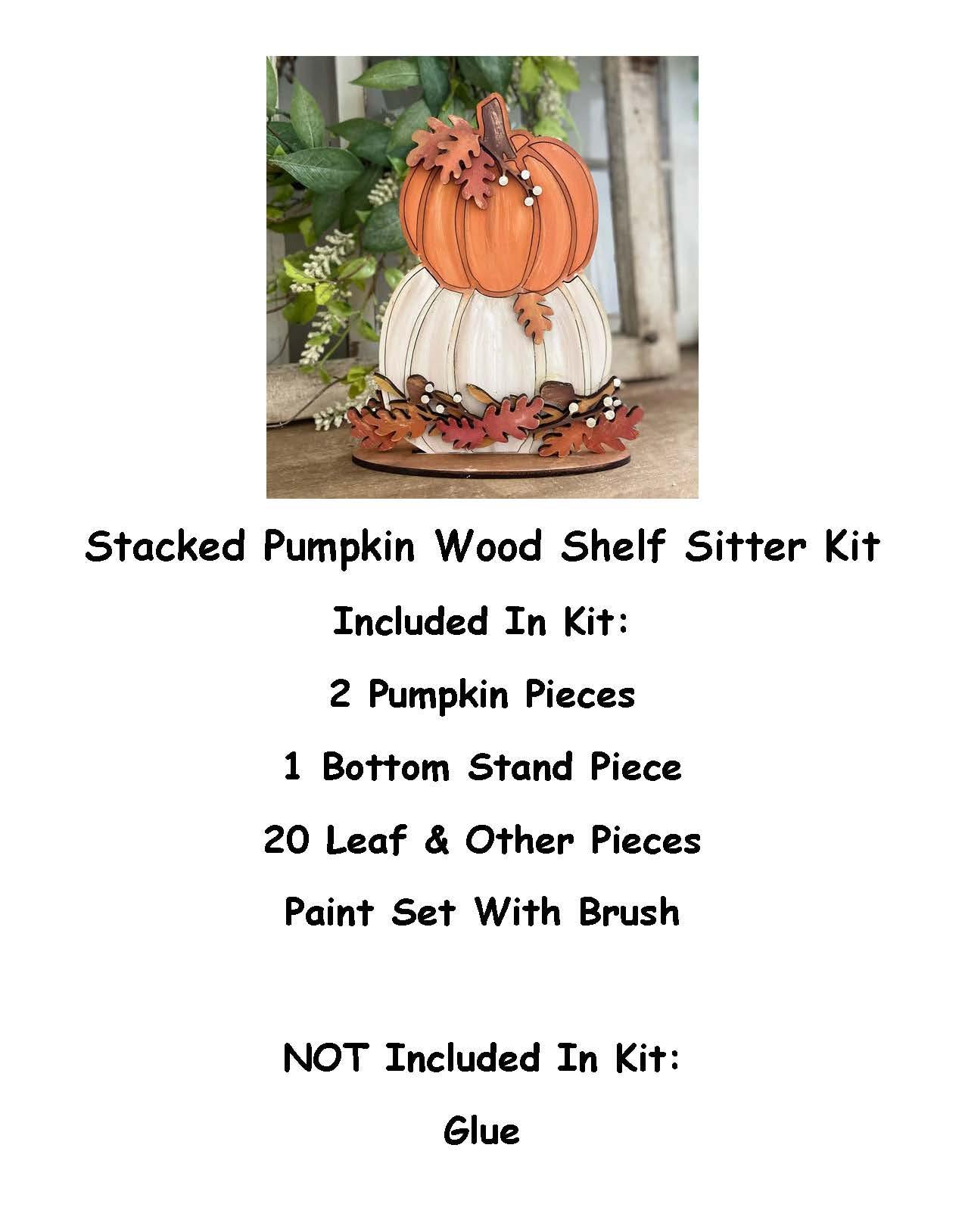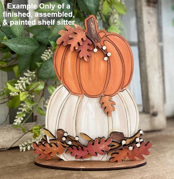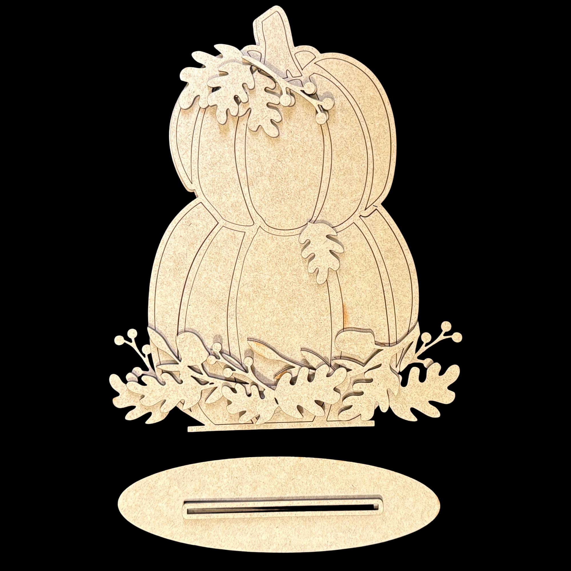 This is a stacked pumpkin DIY (Do It Yourself) wood shelf sitter craft paint kit. The pieces are laser cut on 1/8" inch thick draftboard. It DOES stand up on its own. Glue NOT included. This is NOT a finished and completed shelf sitter. You assemble it, glue it together, and paint it yourself.