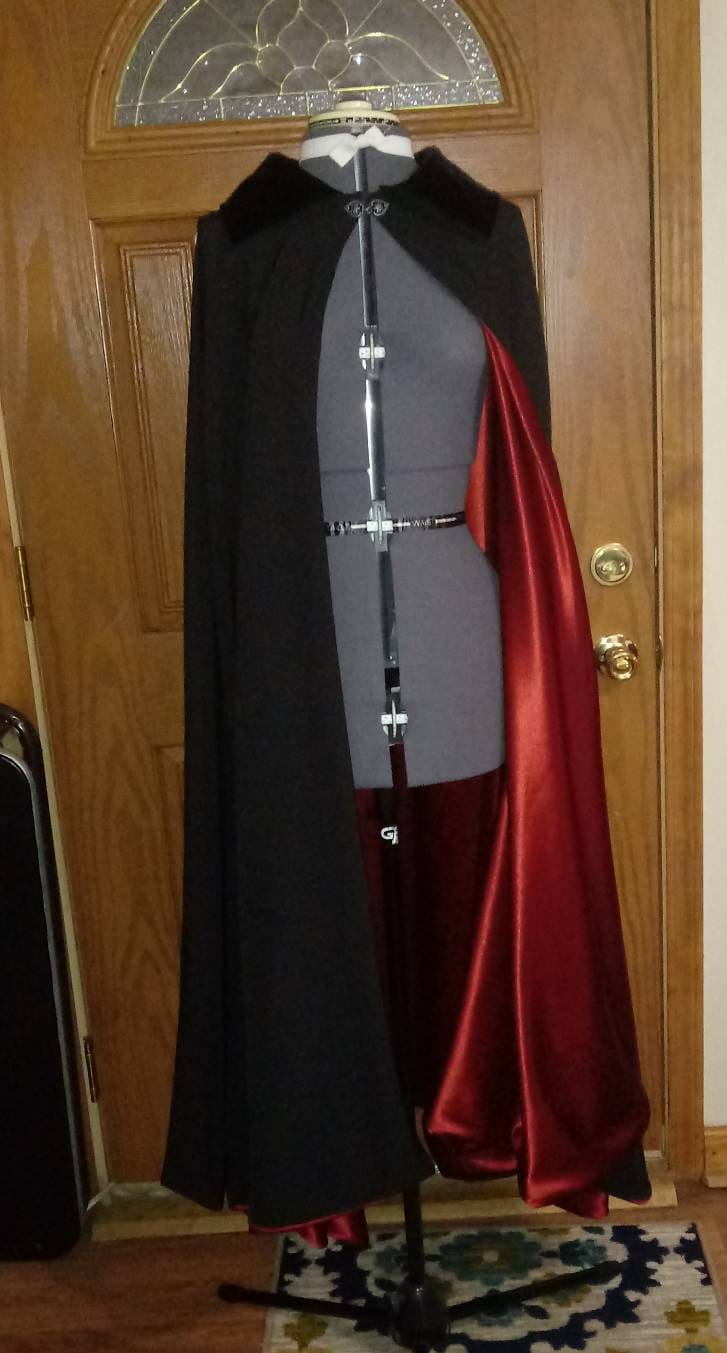 Made from a high quality black suiting fabric and lined with quality satin, the weight of this cloak is amazing! It has a velvet collar. (can be made out of same fabric as the cloak). *If wanted as a Dracula cloak - with a stand up collar, please put that in the notes when ordering.