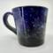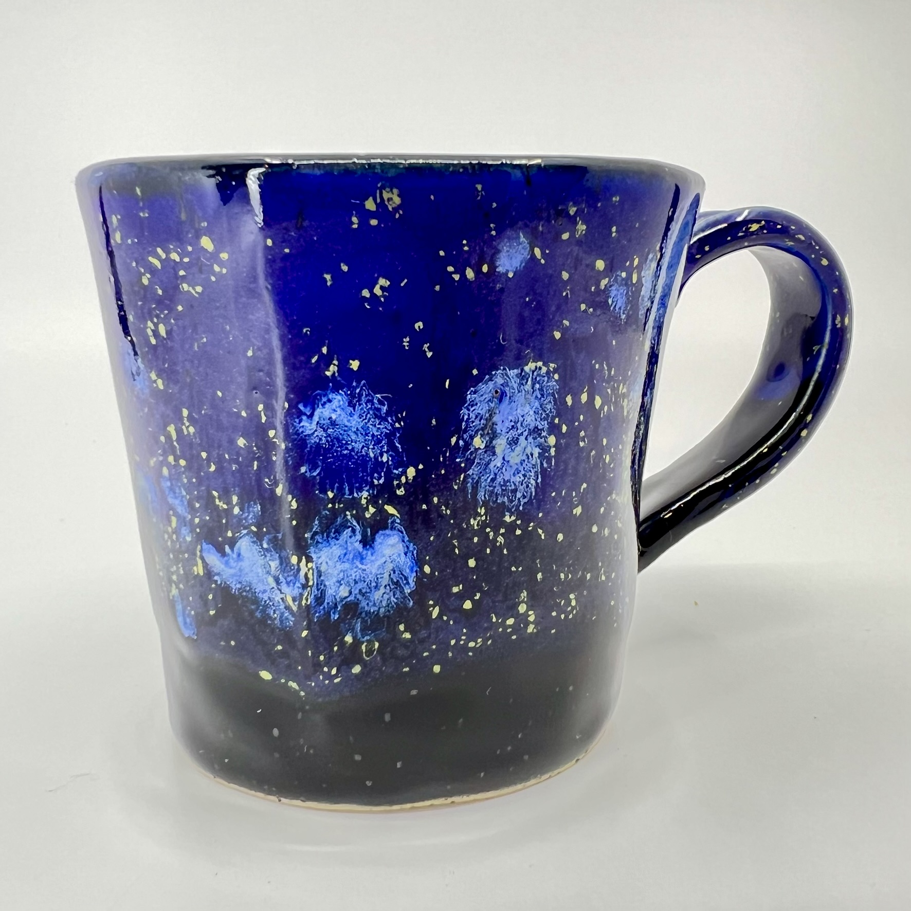 This mug begins as a slab of speckled white clay, hand-built and shaped on a wooden form. After bisque firing, black glaze is brushed over the entire mug. Layers of dark blue glaze are added on top, followed by a crystal glaze that melts in the kiln to create small bursts of yellow and light blue across the surface. As the glazes flow together during firing, they settle into a night-sky pattern that is unique to each piece.