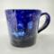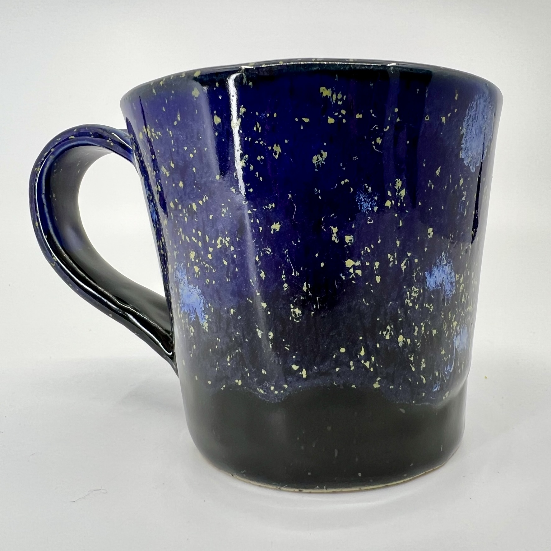 Dark blue glaze flows over this hand-built mug, melting into a black base that gives the surface a deep, night-sky feel. Light blue and yellow crystals scatter across the top like drifting stars and distant nebulae, creating a soft, celestial shimmer as they melt into the darker layers below. The interior is finished in solid black with the speckles of the clay shining through, adding to the rich, moody look. The three-finger handle provides ample support for this hand-built mug.