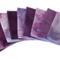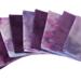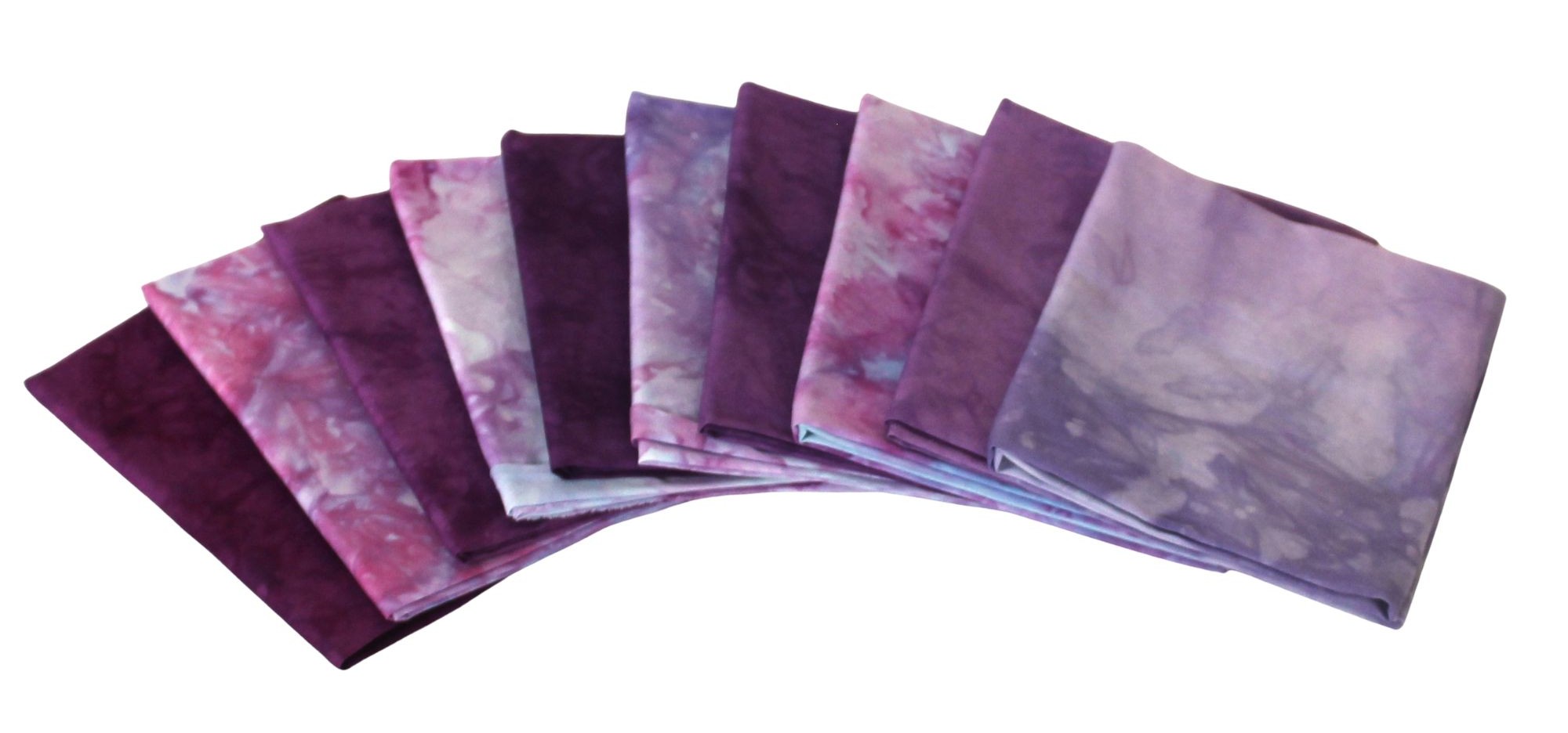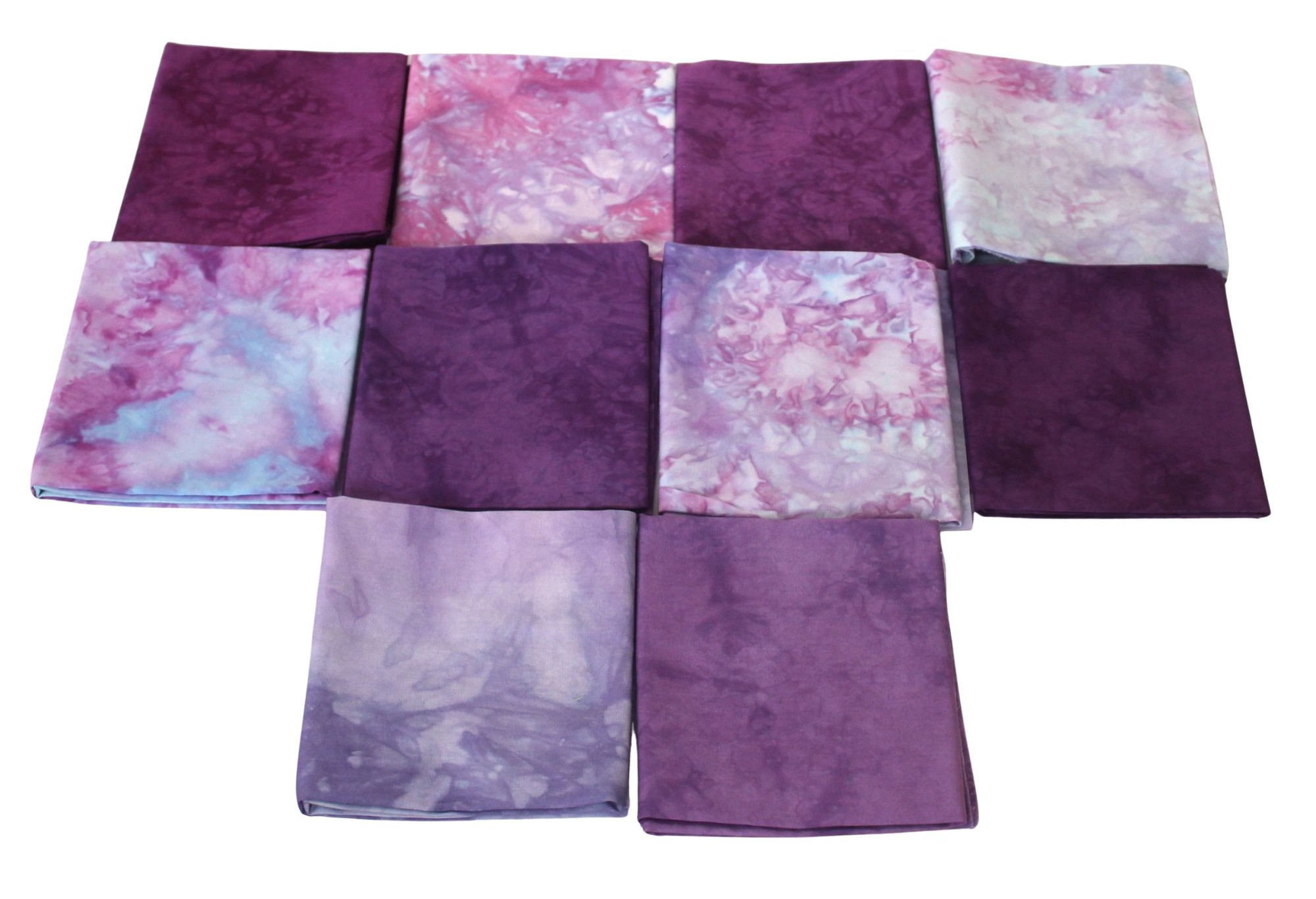Fabric bundle of 10 fat quarters in a coordinating mix of pattern and semi solid fabrics. The patterned fabric is ice dyed, which creates lovely flowing patterns. Colors include a range of pink and purple. Hand dyed quilting cotton sampler pack. There is a range of values to build your stash. These are not a matched gradation, but offer varying shades and textures to add variety to your work. There may be different fabrics in your bundle, but they are all 100% cotton, and a similar weight, so they can be combined in a project if desired. The blended colors and high texture make it suitable for multiple quilting projects, from realistic to abstract. Fabric has a thread count of approximately 76-78 and is suitable for hand embroidery as well as machine quilting. Fabric is fusible ready.