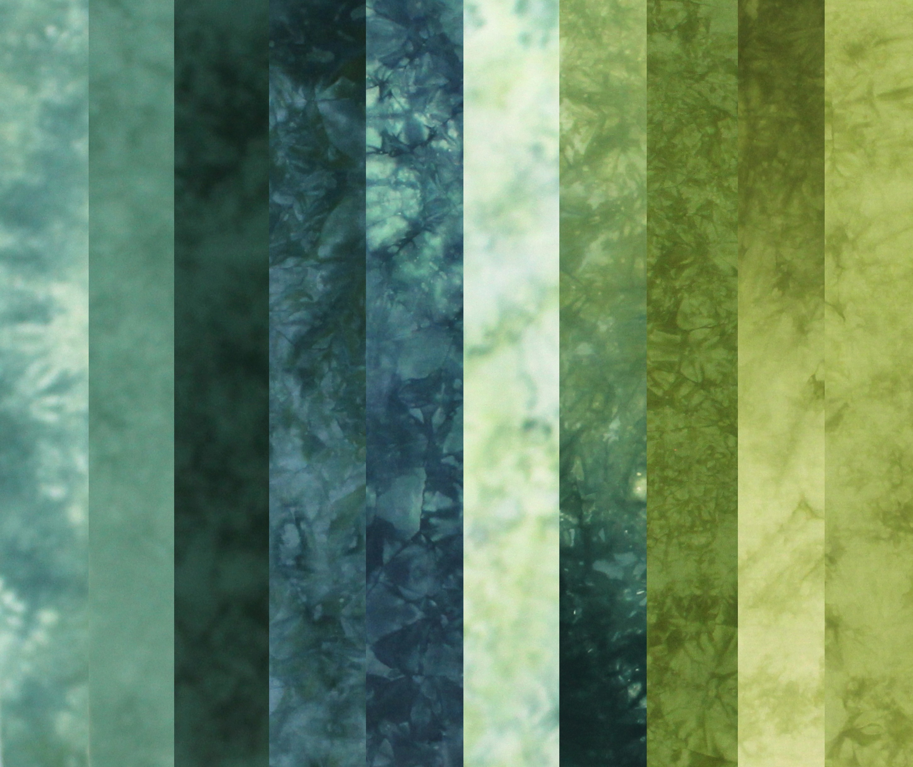 Fabric bundle of 10 fat eighths in varying shades from yellow green through teal. There is a range of values to build your stash. These are not a matched gradation, but offer varying shades and textures to add variety to your work. There may be different fabrics in your bundle, but they are all 100% cotton, and a similar weight, so they can be combined in a project if desired. The blended colors and high texture make it suitable for multiple quilting projects, from realistic to abstract. Fabric has a thread count of approximately 76-78 and is suitable for hand embroidery as well as machine quilting. Fabric is fusible ready.