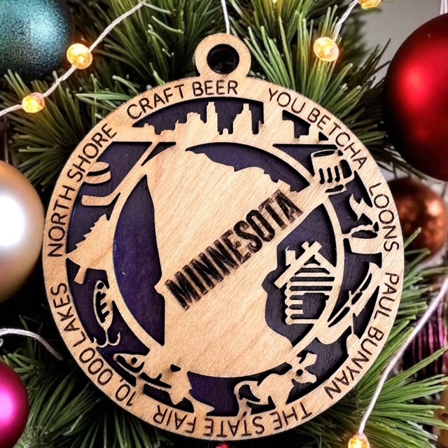 Celebrate the spirit of the season and the beauty of Minnesota with this finely crafted layered wooden Christmas ornament. The design showcases popular state activities through detailed engravings and intricate laser-cut images on the top layer. The top layer is carefully stained to enhance the natural wood grain, while the bottom layer is painted in your choice of color to highlight the cutout design with festive contrast. Each ornament is precision-cut, hand-finished, and full of character—perfect for showcasing state pride or giving as a meaningful holiday gift.