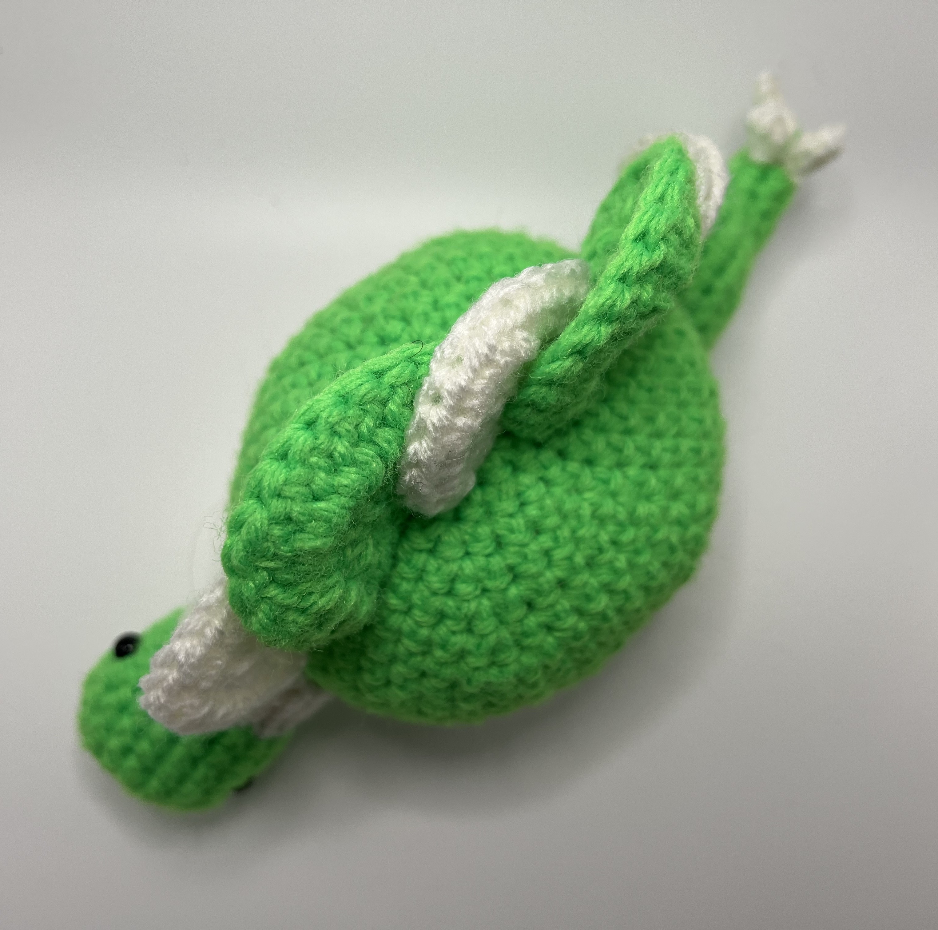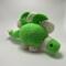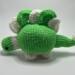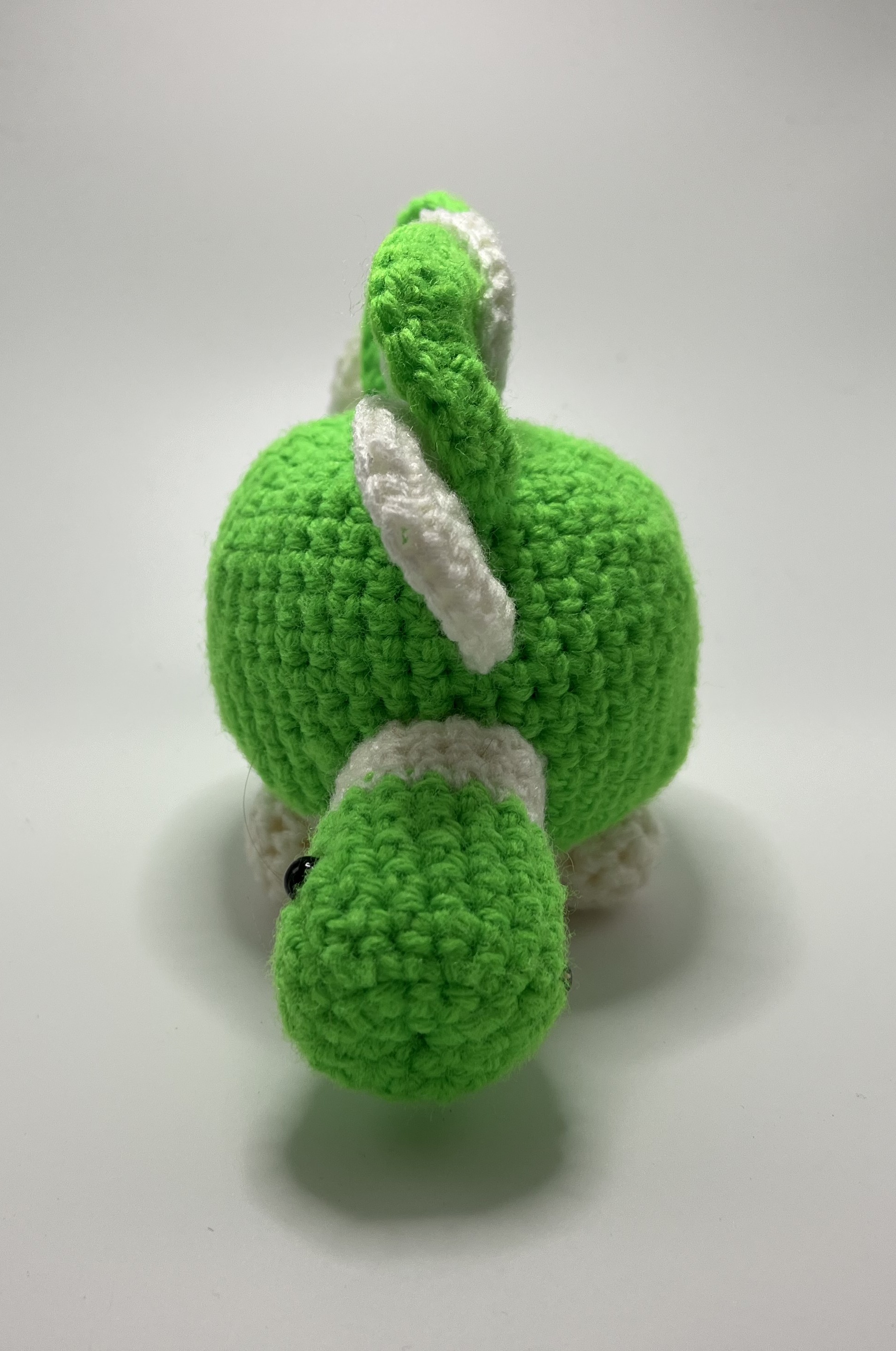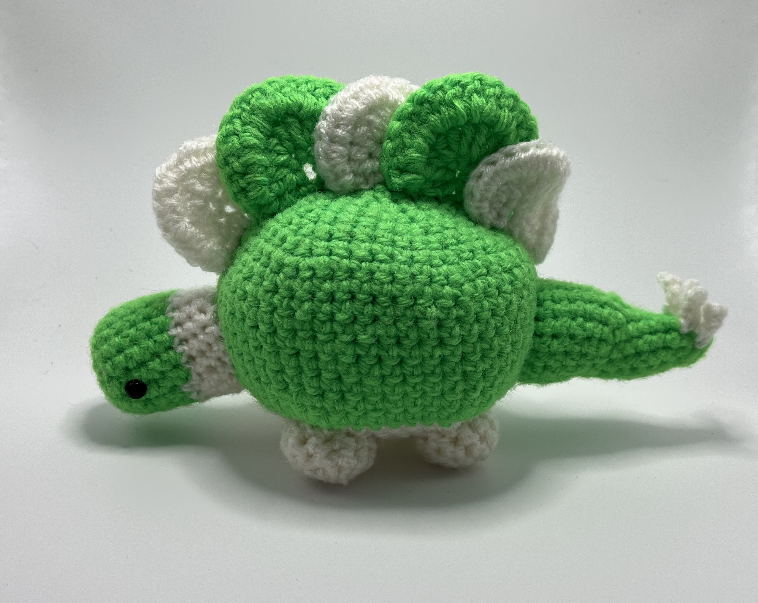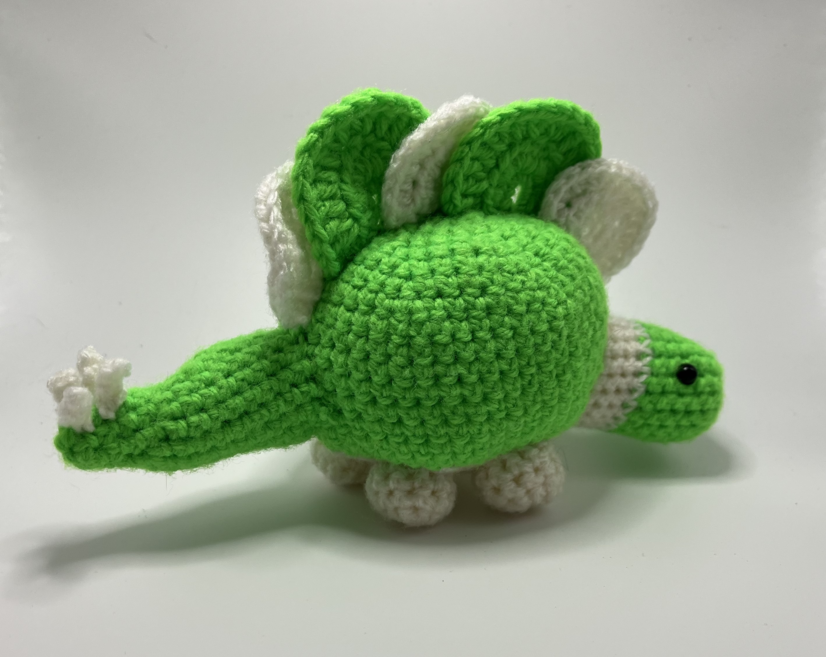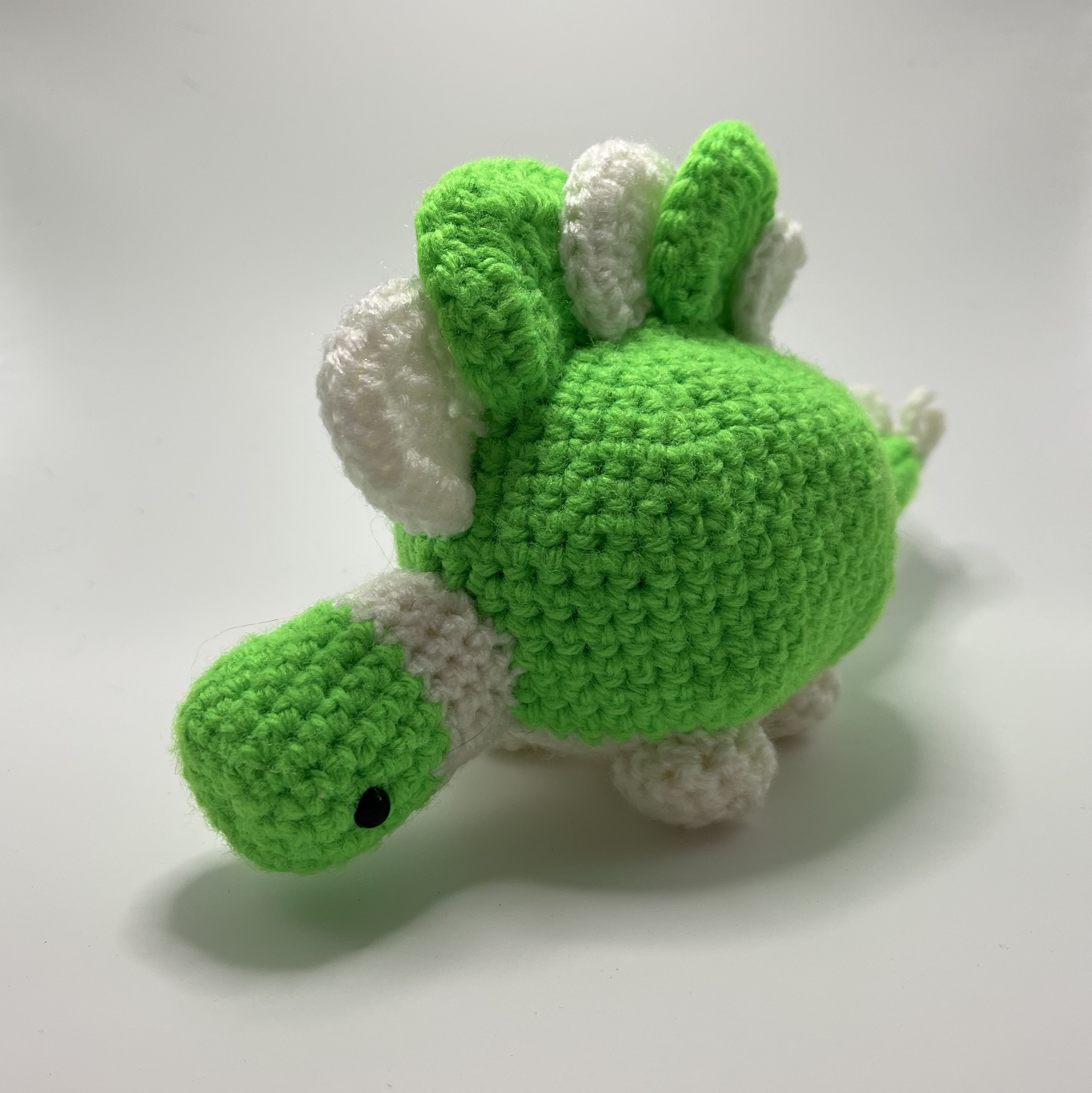 This stegosaurus will brighten your day as it gallantly protects you. Made of acrylic yarn, plastic safety eyes, and stuffed to hold shape it measures about 7.5 inches long, 3 inches wide and stands on his own about 4.5 inches. Color variations available on request!
