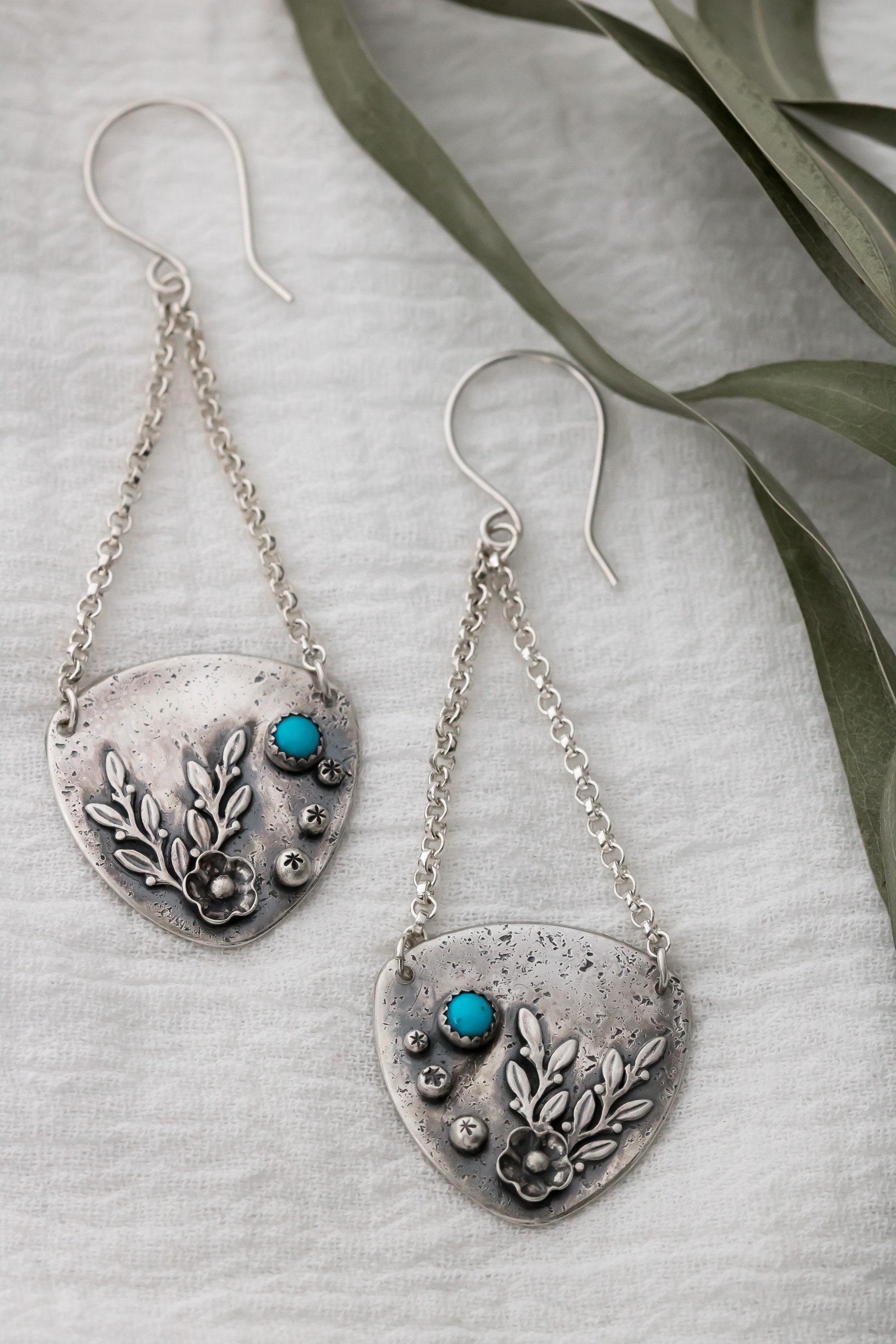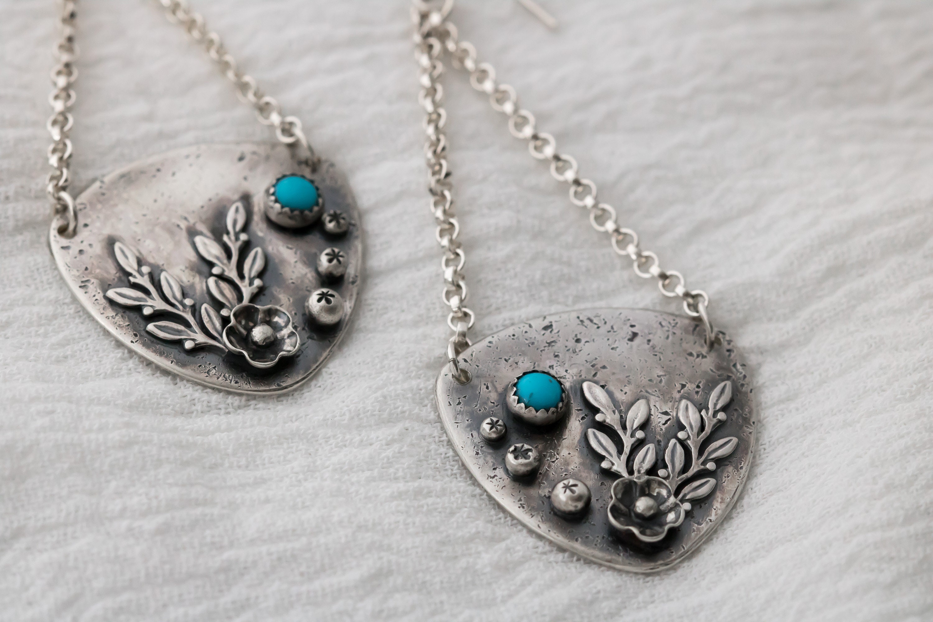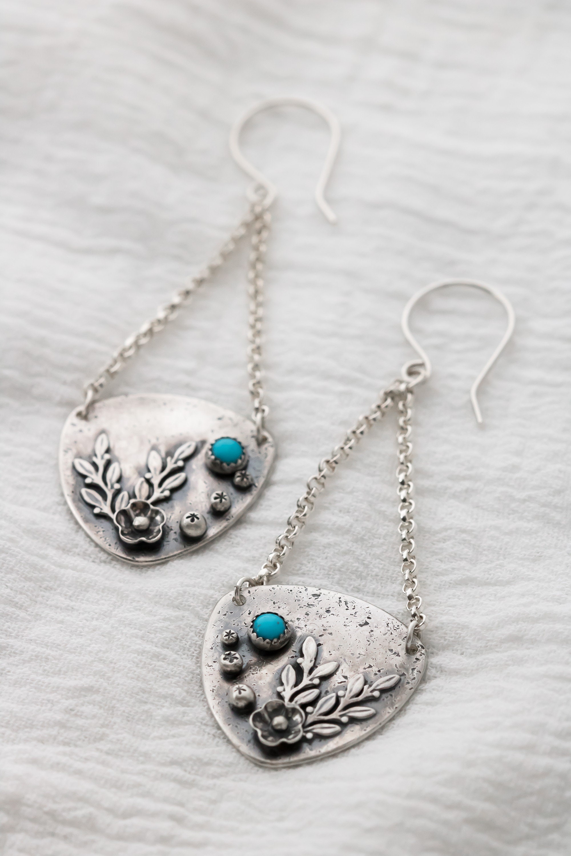 Tiny spring blossoms accented with fresh blue turquoise and leafy sprigs on swinging silver shields. Completely handcrafted in my small Alaskan home studio. Earrings measure approximately 3" for top of ear wire.