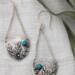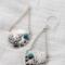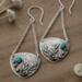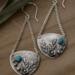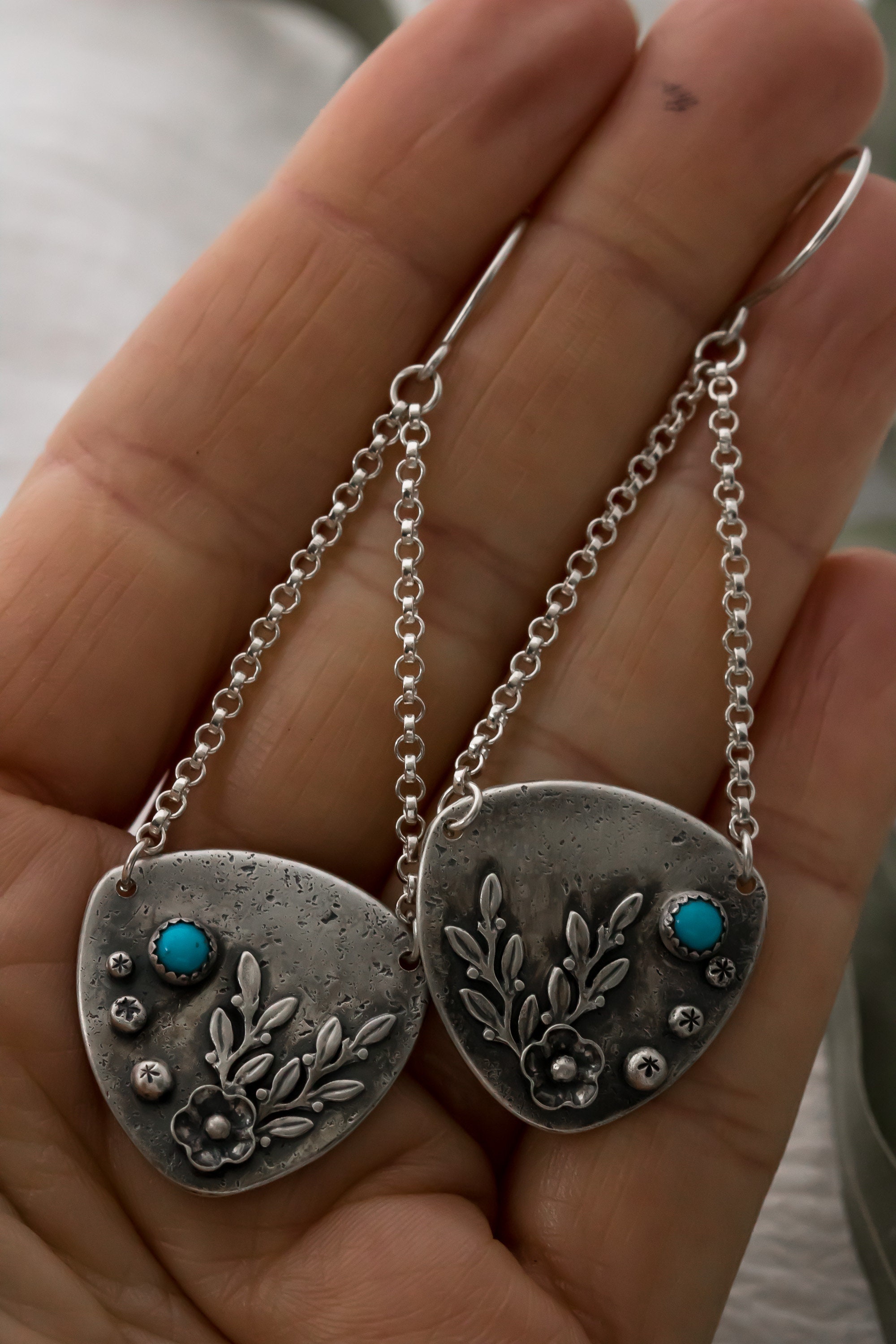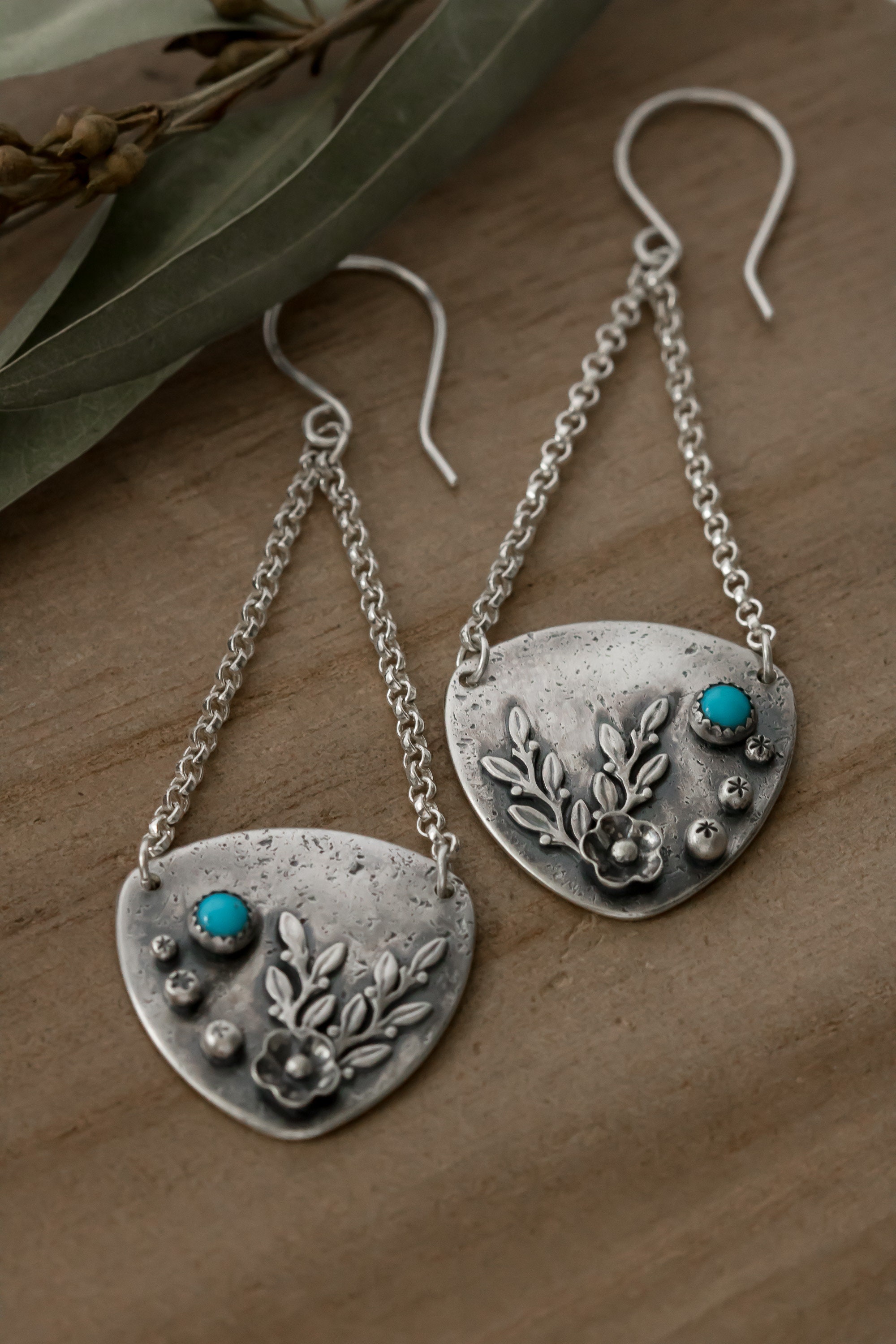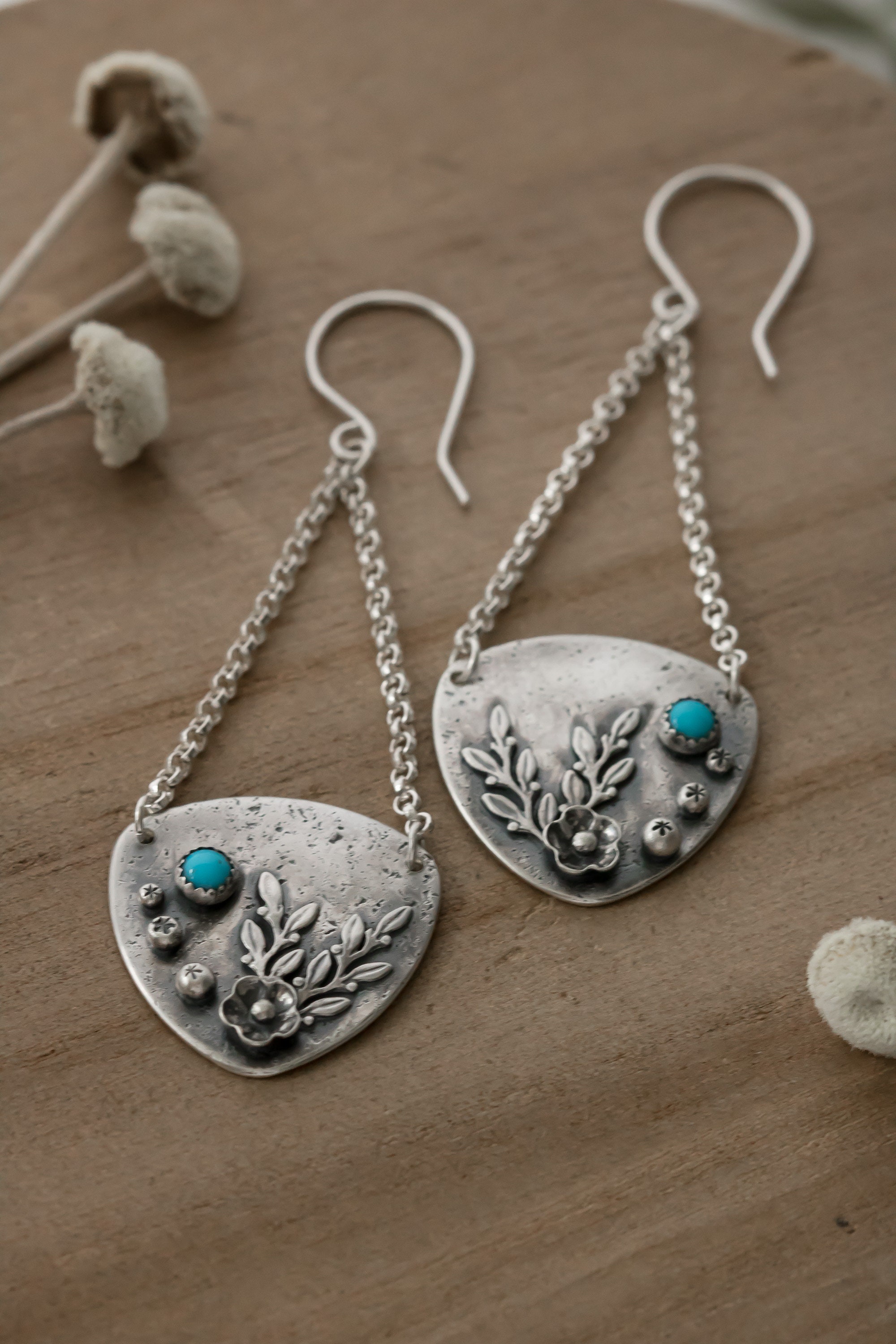 Tiny spring blossoms accented with fresh blue turquoise and leafy sprigs on swinging silver shields. Completely handcrafted in my small Alaskan home studio. Earrings measure approximately 3" for top of ear wire.