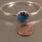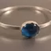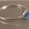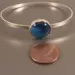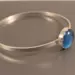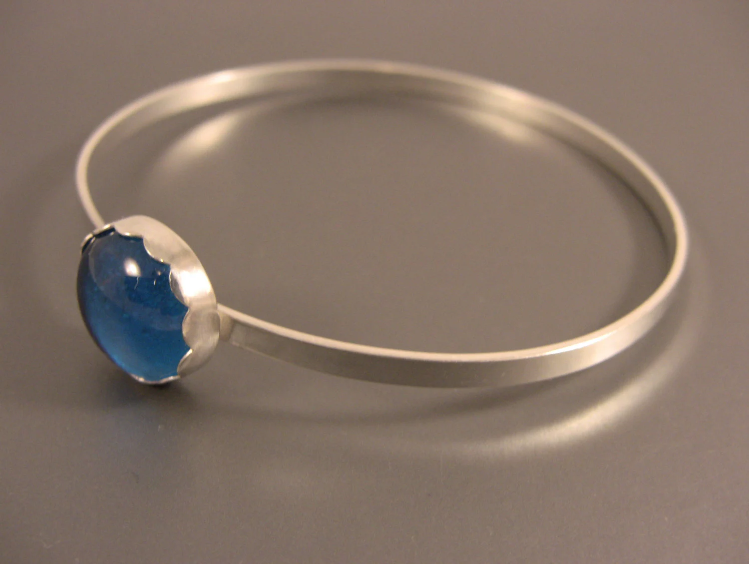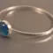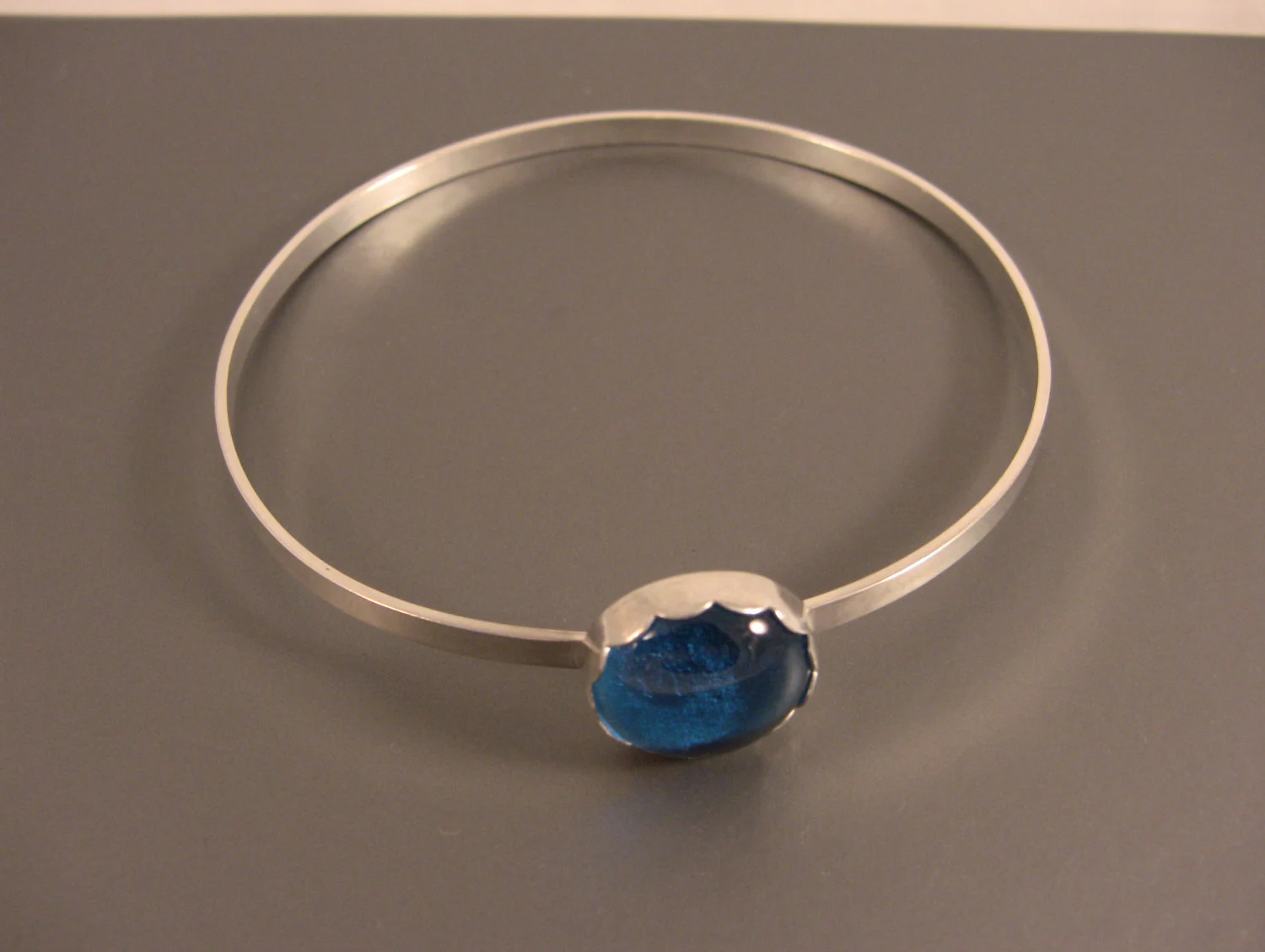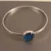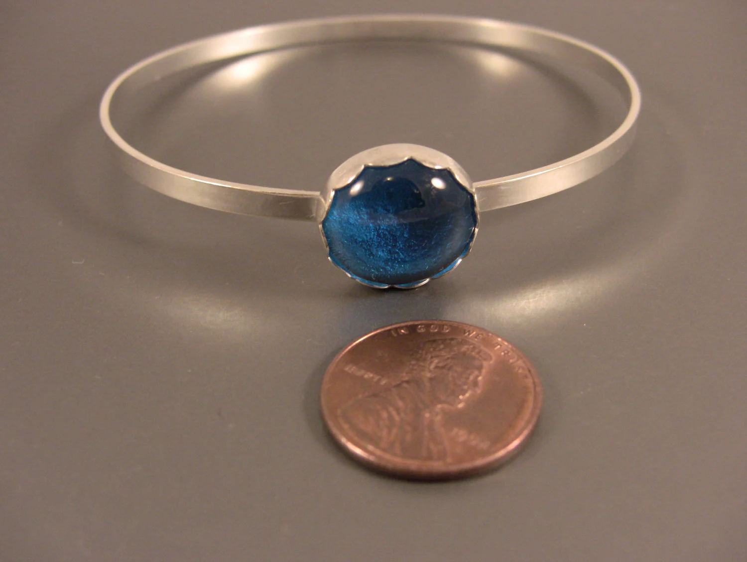 This bracelet is simple, but elegant. I hand forged/hand crafted it using silversmithing techniques such as sawing, filing, and soldering, etc. This bracelet is made from 3 mm wide sterling silver wire with the ends soldered together. Inside the bezel made of sterling silver wire and sheet metal sits a turquoise colored fused glass cab. The bracelet is approx 2-1/2" in diameter and has an approx 7-1/2" circumference. The bracelet has been work-hardened and polished in a tumbler.