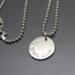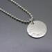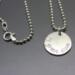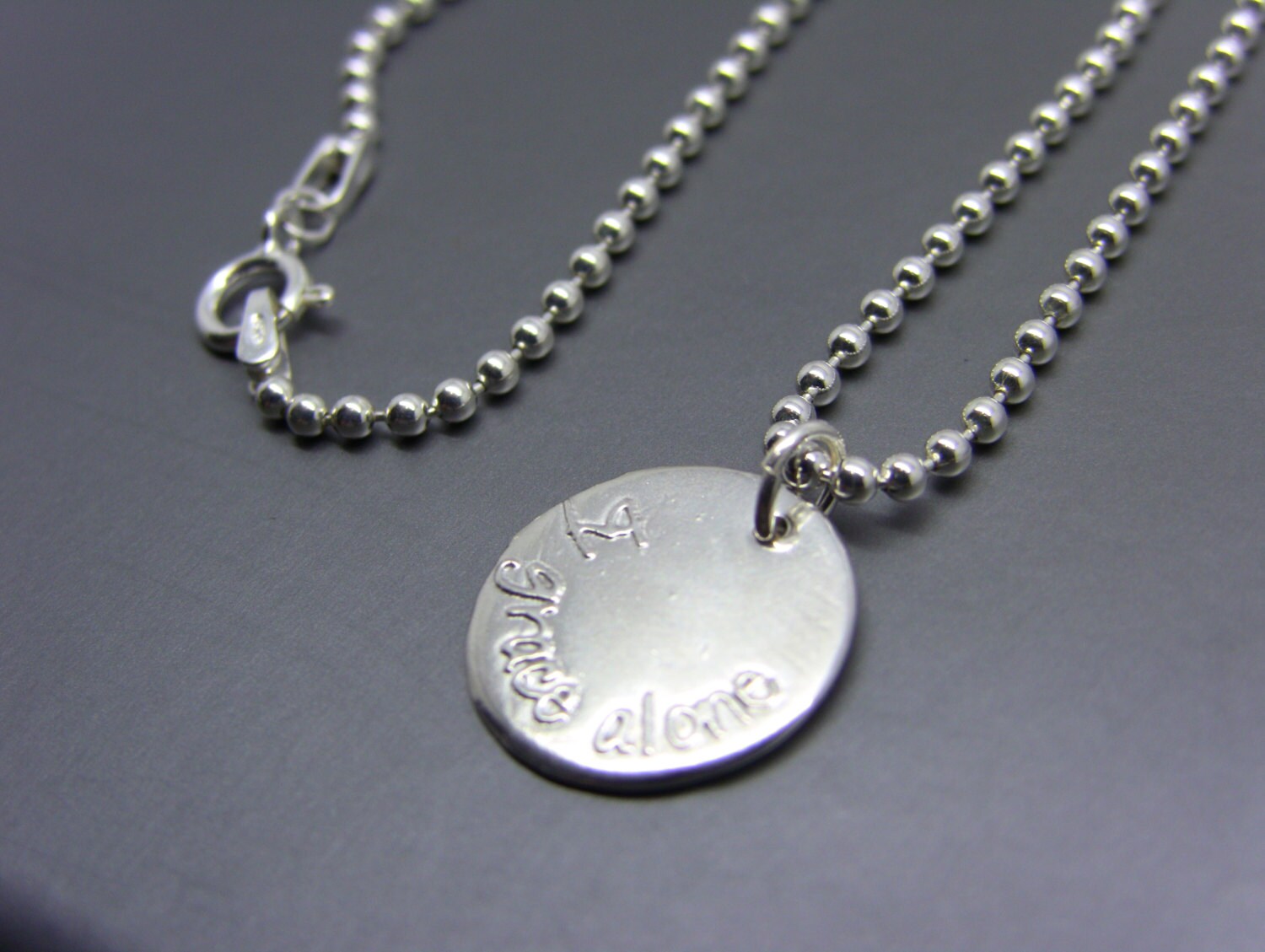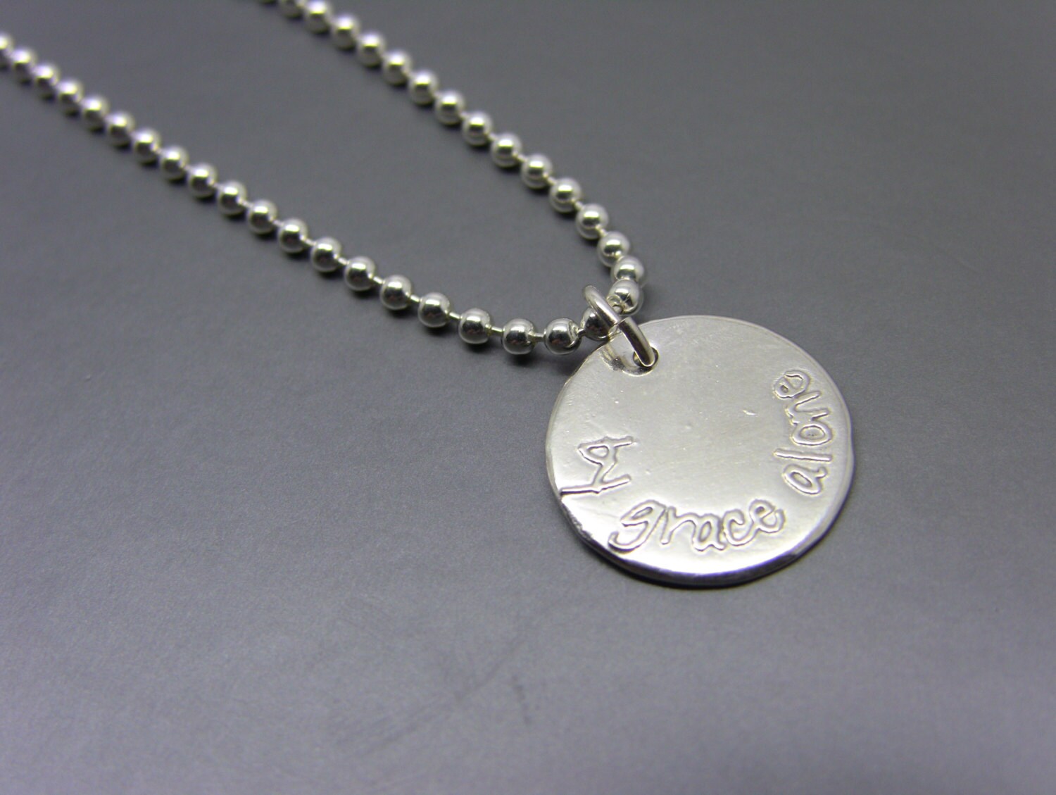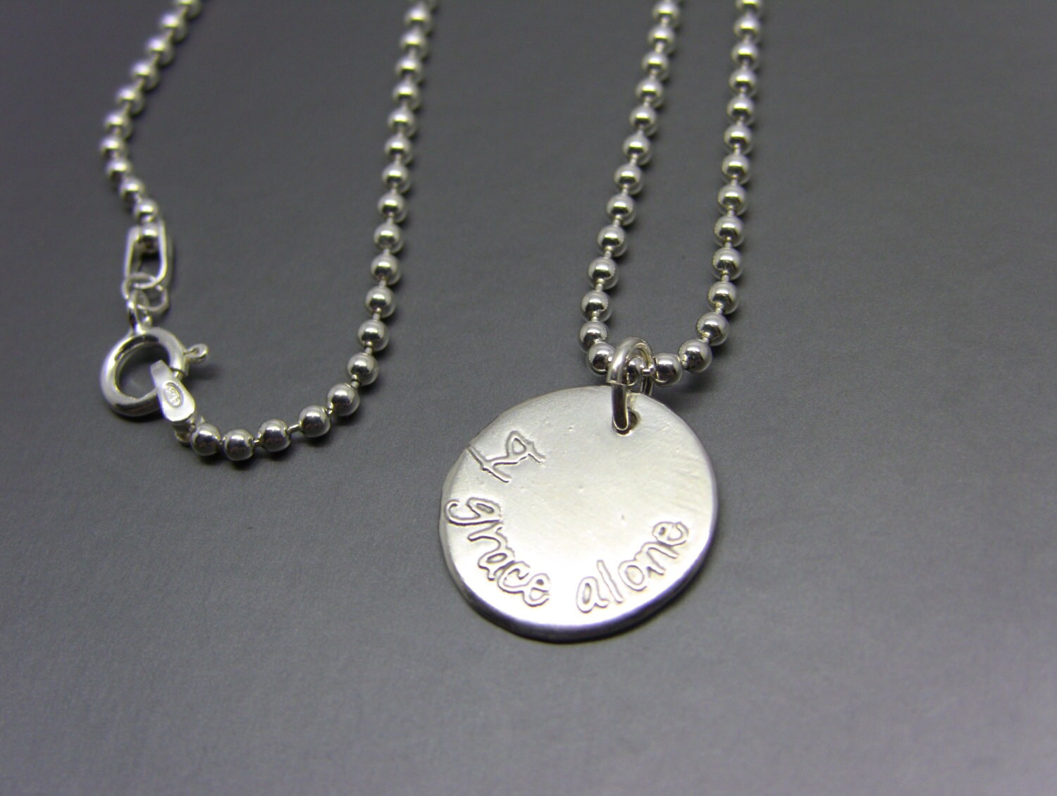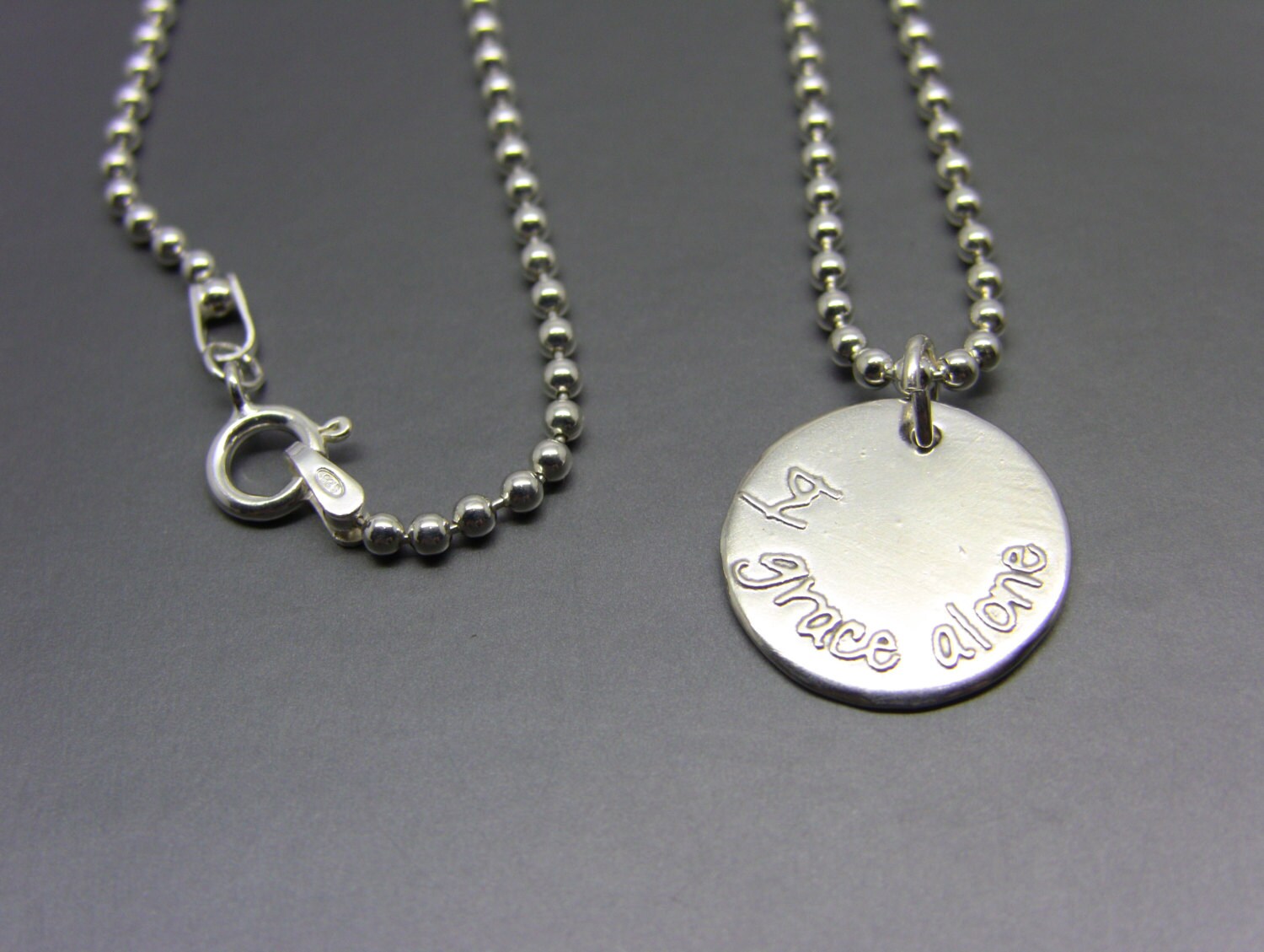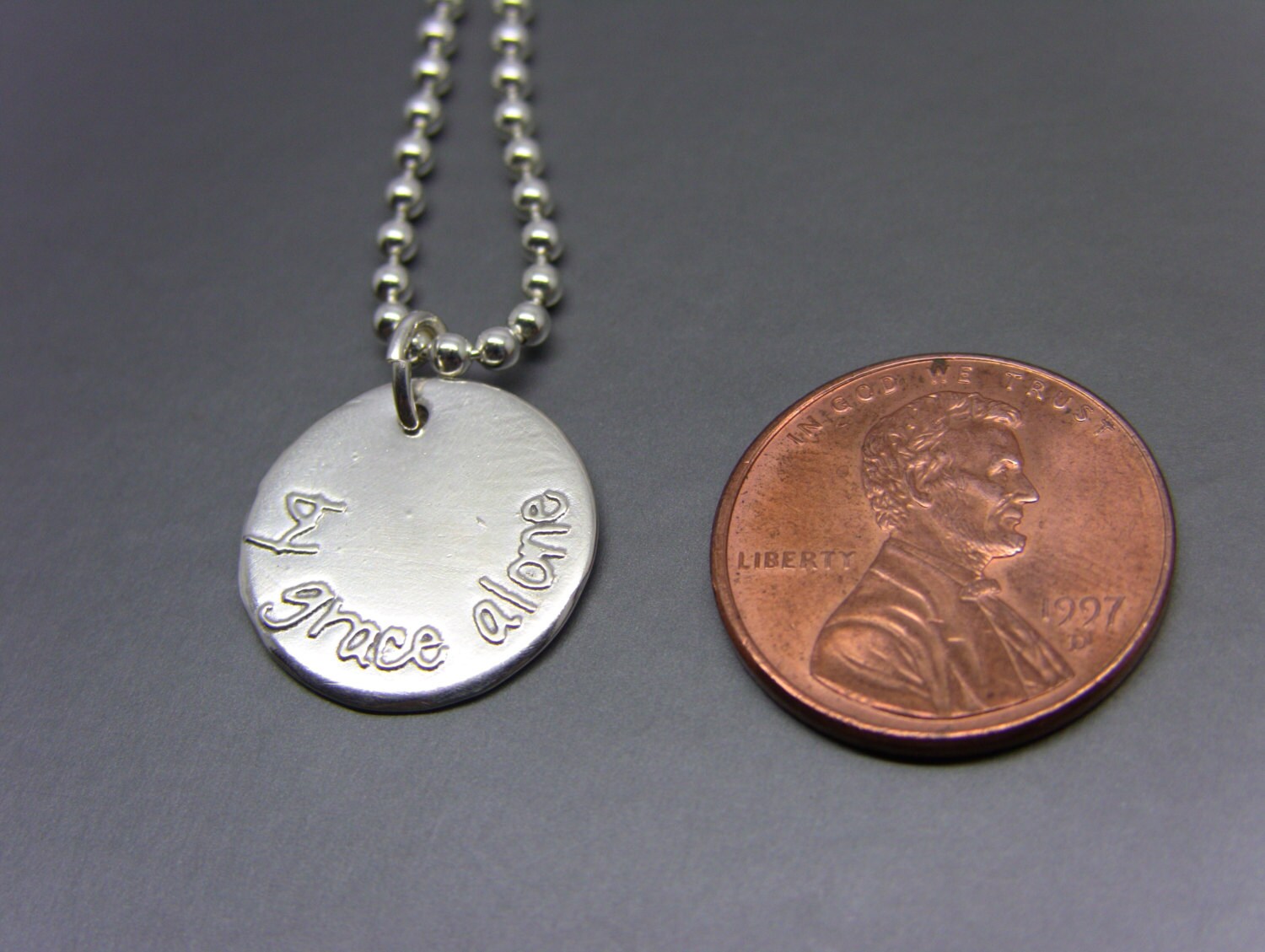 This simple, but fun necklace features a sterling silver disk shaped pendant with the words "By grace alone" etched on it. The letters are raised on this piece. I hand-cut this piece and then etched it using an electrical etching process. The piece was then polished. The silver will develop a patina over time, simply use a polishing cloth or silver cleaner if you would like it to stay shiny. The pendant hangs from a 18" sterling silver bead chain with spring ring clasp. Pendant is 5/8" in diameter.