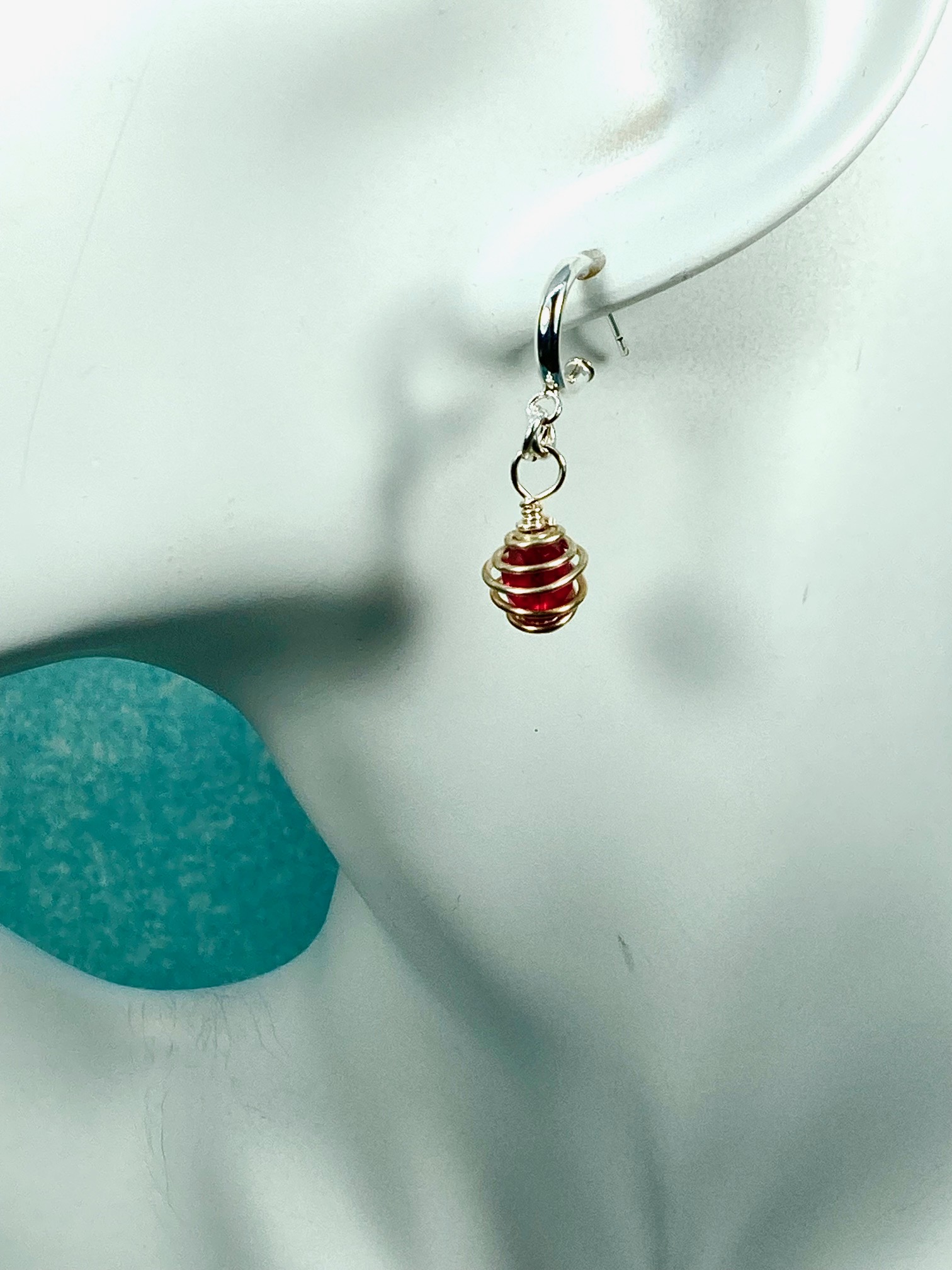 Sterling Silver hoop earrings with wire wrapped Crystal bead in Siam. Sterling Silver wire wrapped cage is made with 20 gauge wire. Posts are Sterting silver hoops.