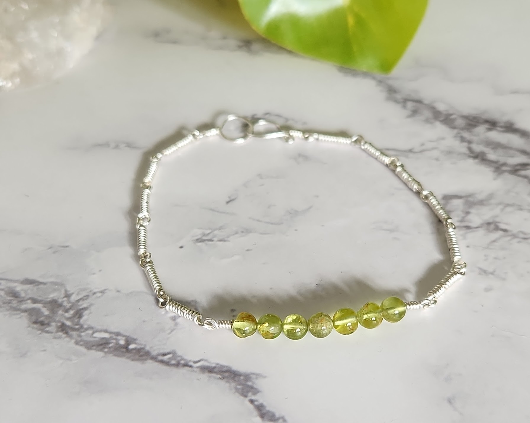 This bracelet is made with Peridot gemstones and Sterling Silver wires.