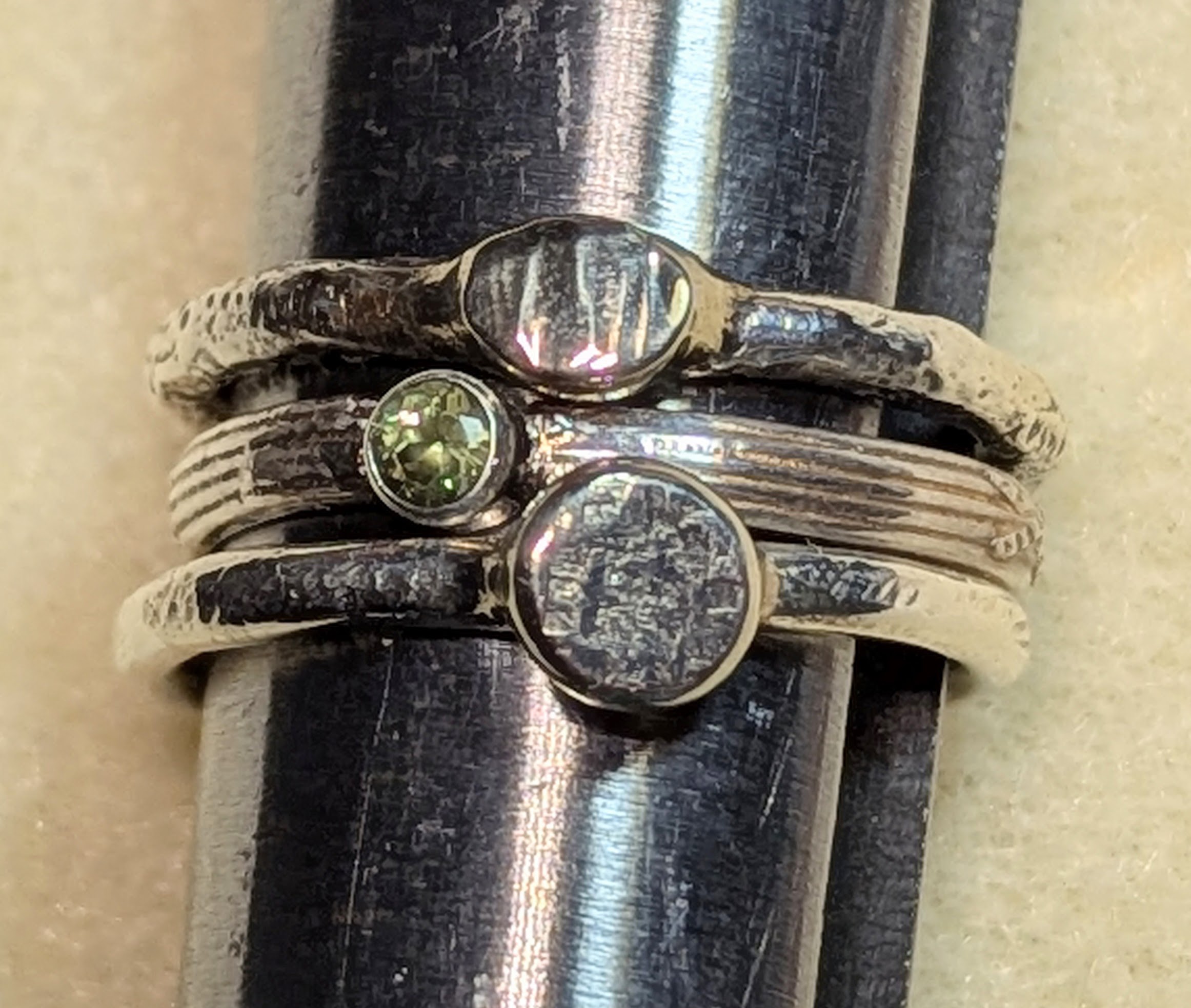 Each of the three rings is made with recycled sterling silver. Two are reticulated, with a lot of interesting texture, while the third features a patterned band and a 3mm Peridot in a tube setting. This is a ONE OF A KIND set of rings and cannot be duplicated.