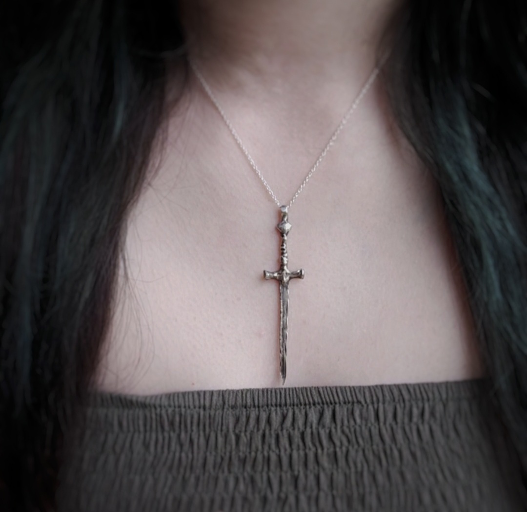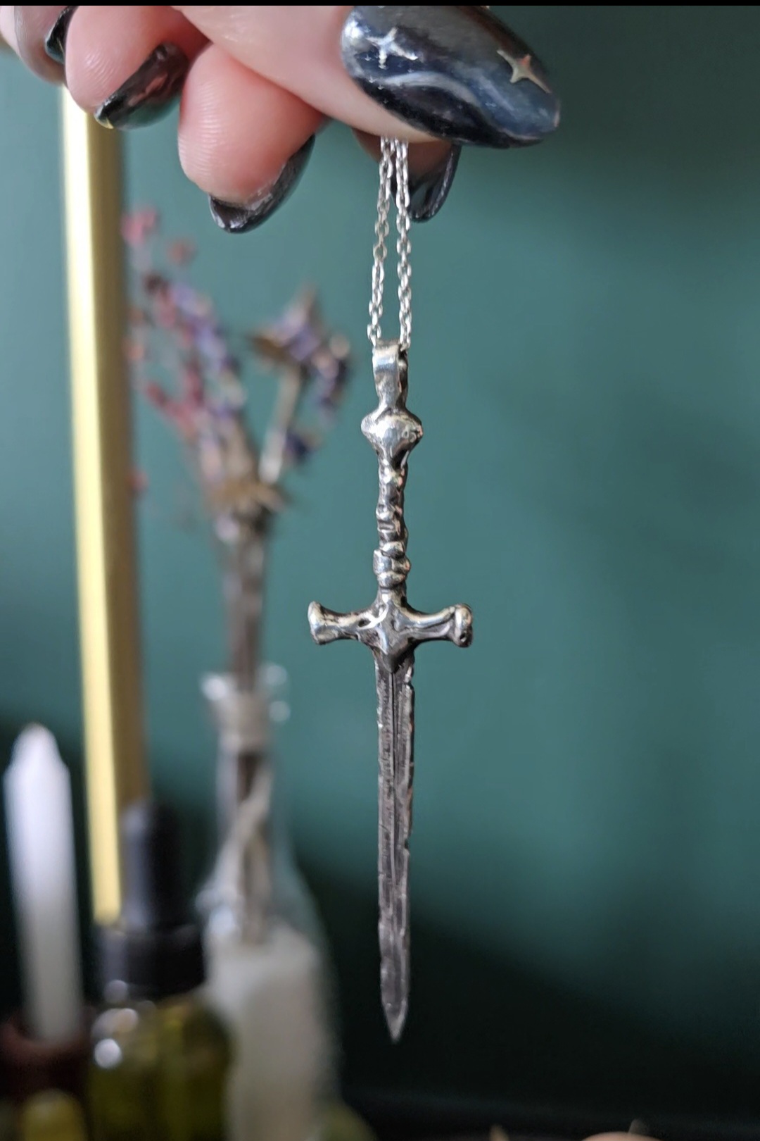 A weathered and battle worn sterling silver sword pendant. Oxidized to give it soul. Ships ready to wear on an18inch sterling silver chain.