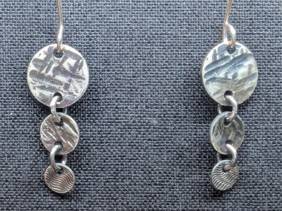 Hammer textured sterling silver dots in decreasing sizes, glitter and shine as they move. Featuring patina and sterling silver ear wires.