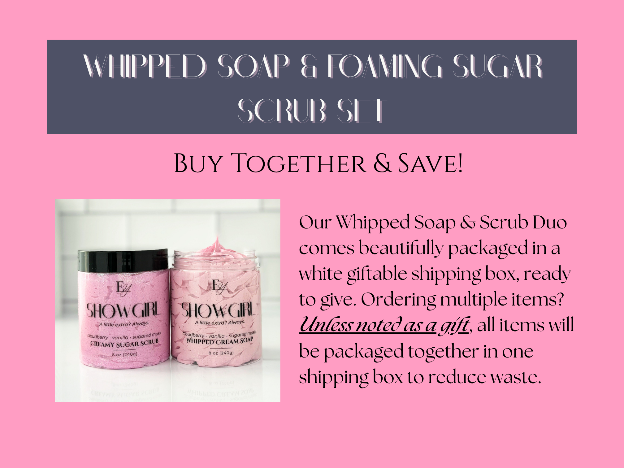 Each Whipped Soap & Scrub Duo is packaged in a white giftable box, perfect for gifting.