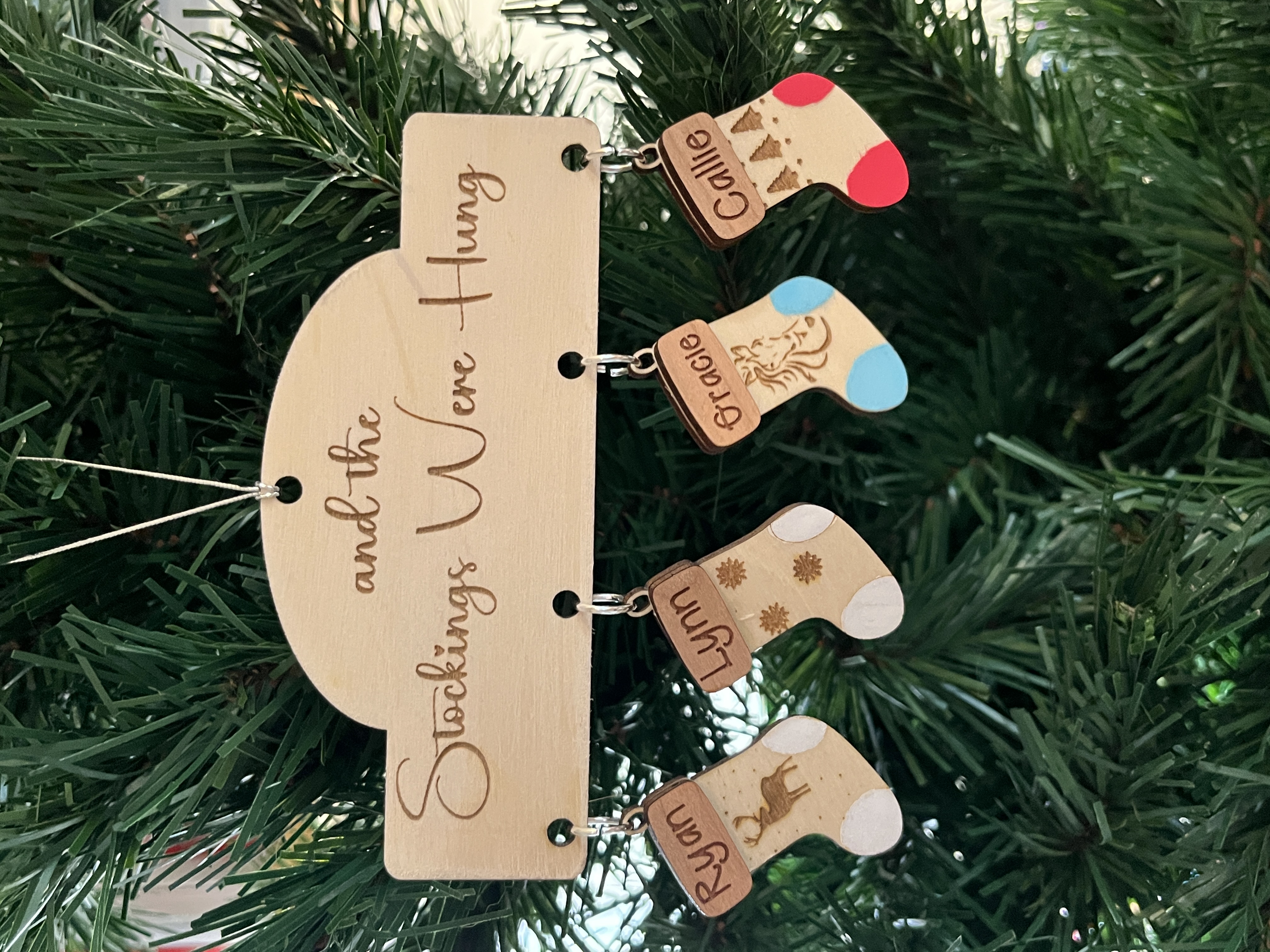 "And the stockings were hung..." Show off you family with this cute stocking ornament. Each stocking is hand - painted and the name is attached to the top of the stocking. This ornament can be made from basswood, maple, cherry or walnut. Shown is maple with cherry names. Stockings are attached to the ornament with silver or gold rings. This ornament can have from 3 - 5 stockings attached.