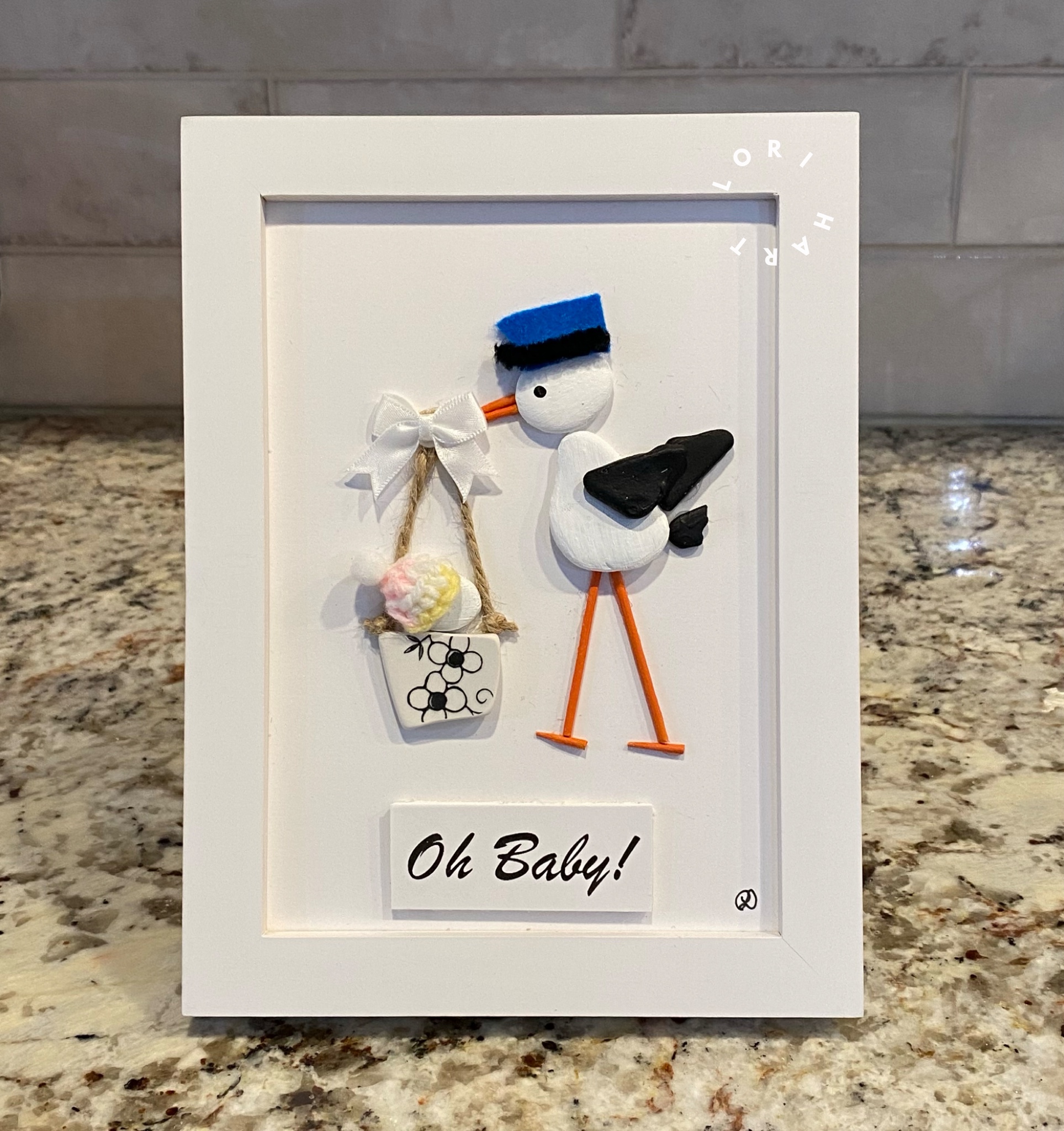 This is a unique gift idea for anyone expecting a baby or for new parents! "Oh Baby" was made using many different materials: genuine sea glass, river rocks, sea pottery, and even a crocheted baby hat! This is a white wooden frame that measures 6"w x 8"h & has an easel back. If you are looking for a one-of-a-kind gift idea, this is it!