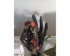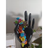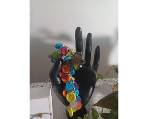 Atleast 1/2 of the buttons are upcycled but to achieve the pattern and colors I wanted so some were purchased new. Chain is an old necklace that has been upcycled made of silver colored metal each button connected with jump rings.
