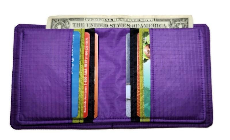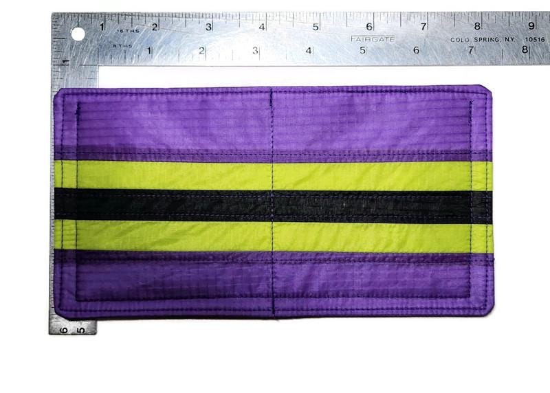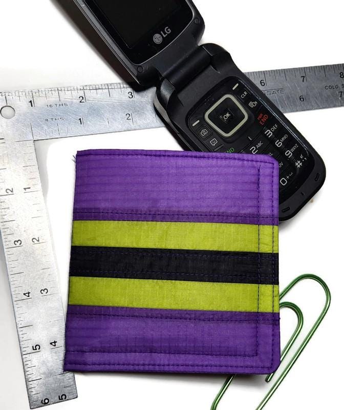 THE THINNESTTHE COOLEST THE LIGHTEST THE ECO-IST This ultralight guys striped bi-fold wallet has been fashioned from a recycled paraglider. Once floating among the clouds the fabric is now working hard as a tough rugged wallet. Folded this eco friendly wallet measures 4 x 4 inches and opened out flat it measures 4 inches x 8 inches and is practically weightless. The purple, black and chartreuse interior echoes the exterior colors. The strong colors make it easy to find on a cluttered table or desk or in a backpack or briefcase. The minimalist wallet has one large pockets for cash and receipts and six credit card pockets for cards and I.D. Inward facing pockets add security. This wallet is so flat you can sit on it comfortably in your back pocket but it will fit even shirt pockets. Incredibly durable ripstop nylon. Washable. A nice gift for your green friends!