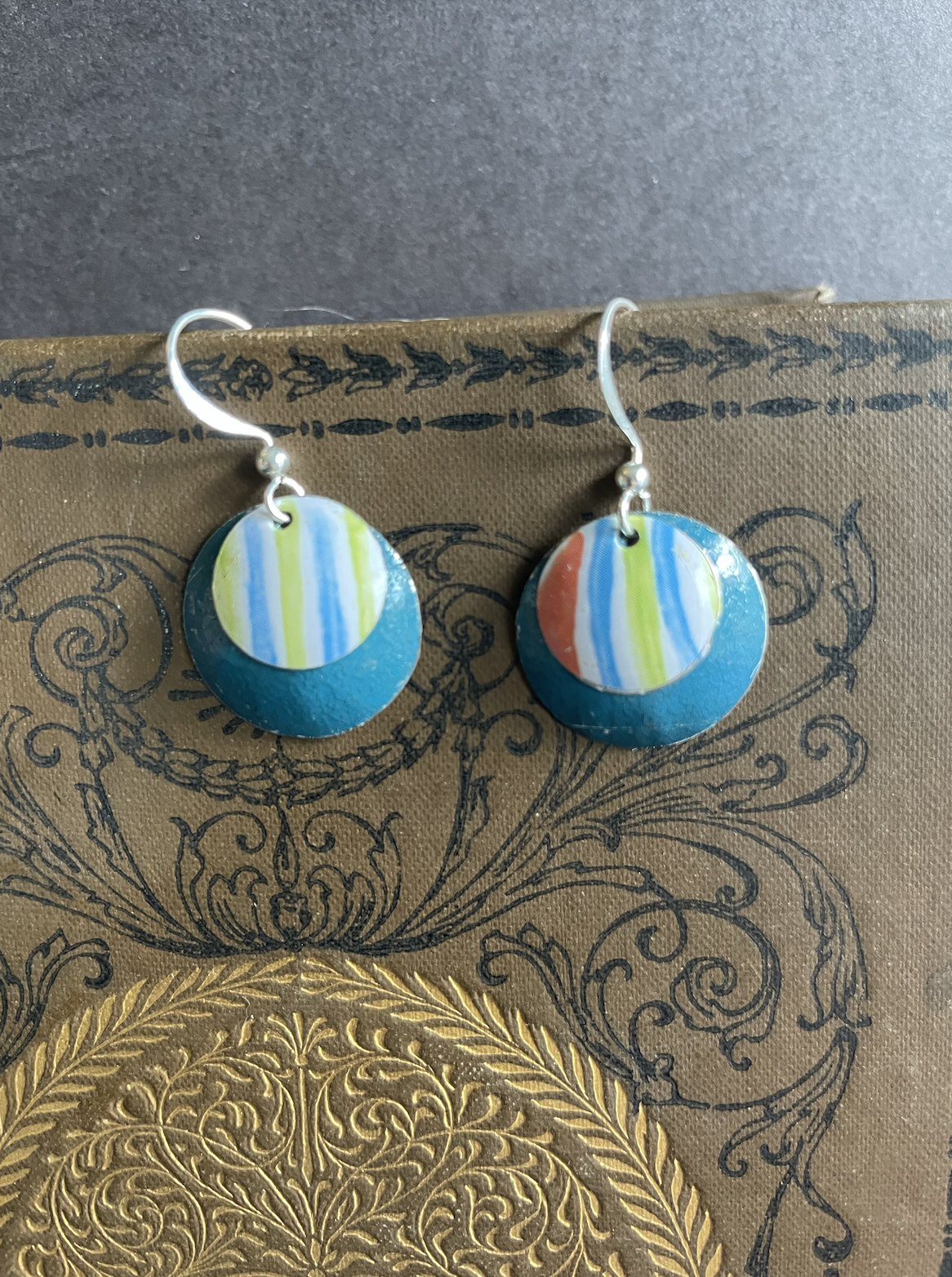 My original idea for making earrings out of tin was to do just this: nest several concave circles in one another. These specific nested earrings sport a colorful set of stripes on the center piece. These gold plated earrings come with a rubber stopper so they won't fall out of your ears.