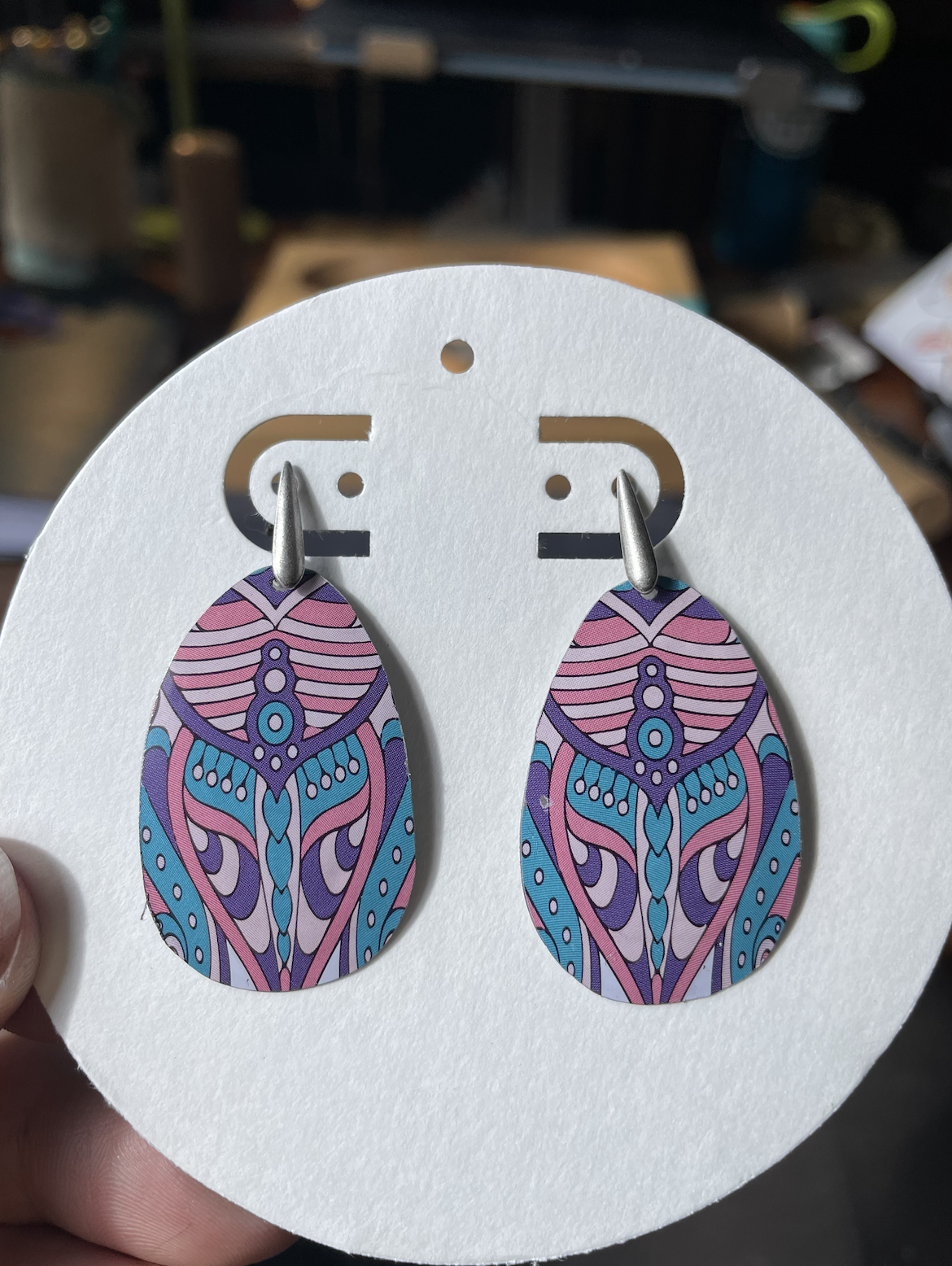 Tins are very light, making them ideal for earrings as they don't weigh down your ears as the day goes on. Did you know the proper term for working with tin is "tinkering"? That made me really happy. I literally tinker in my art studio. I use old cookie tins, tea tins, and the like, break them down, and hand cut them into shapes and hand-hammer them into the 3-D shape I want them to be, finish and polish them, before putting them together like any other jewelry.