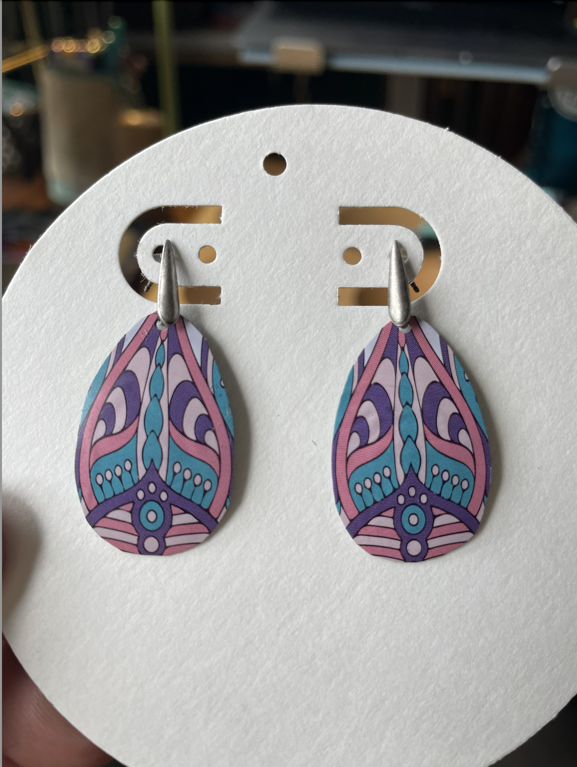 Tins are very light, making them ideal for earrings as they don't weigh down your ears as the day goes on. Did you know the proper term for working with tin is "tinkering"? That made me really happy. I literally tinker in my art studio. I use old cookie tins, tea tins, and the like, break them down, and hand cut them into shapes and hand-hammer them into the 3-D shape I want them to be, finish and polish them, before putting them together like any other jewelry.