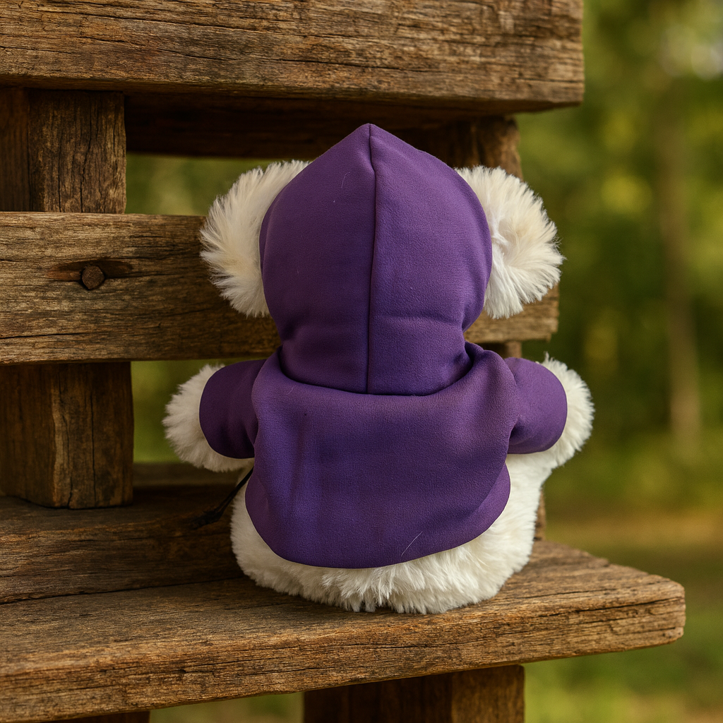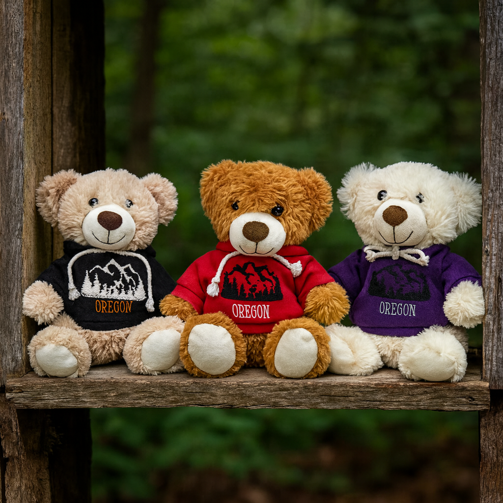 Dressed in a removable purple hoodie embroidered with “OREGON” and a charming mountain and forest scene, this bear would make a great gift for someone who misses our great state.