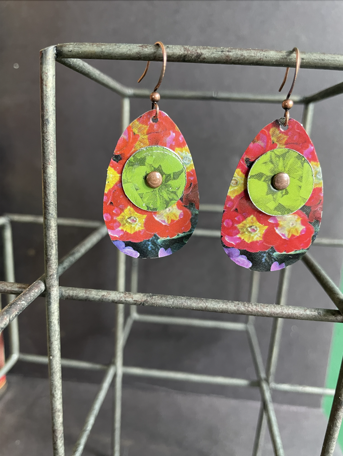 Tins are very light, making them ideal for earrings as they don't weigh down your ears as the day goes on. Did you know the proper term for working with tin is "tinkering"? That made me really happy. I literally tinker in my art studio. I use old cookie tins, tea tins, and the like, break them down, and hand cut them into shapes and hand-hammer them into the 3-D shape I want them to be, finish and polish them, before putting them together like any other jewelry.