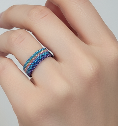 A little slice of sunset for your hand.This slim peyote-stitched beaded ring blends glowing purples, golden orange, and shimmery blues in a neat striped layout that feels like a slow summer sunset. It’s light, flexible, and made to wear every day — whether you're chasing warm weather or just want to bring the vibe with you.