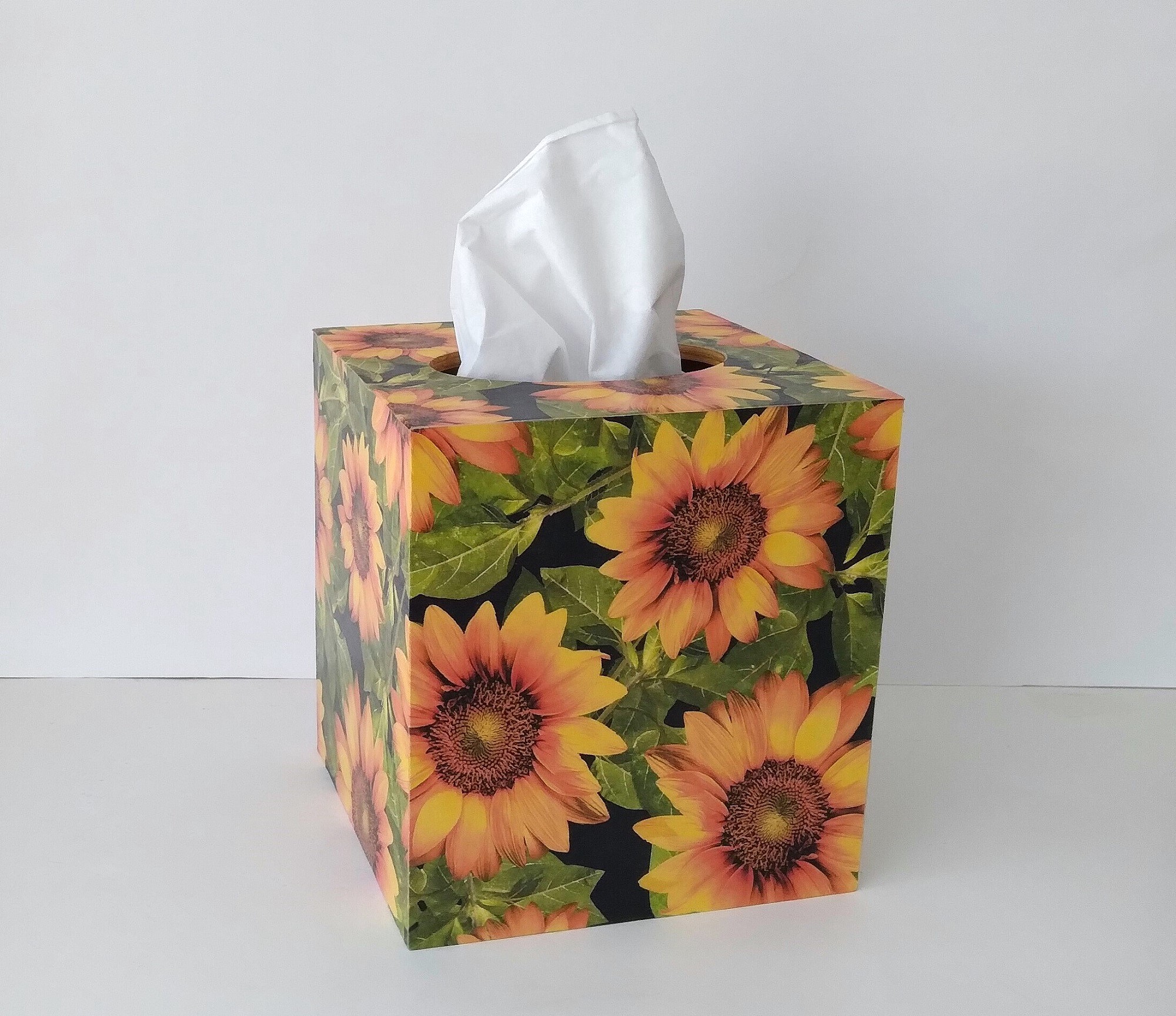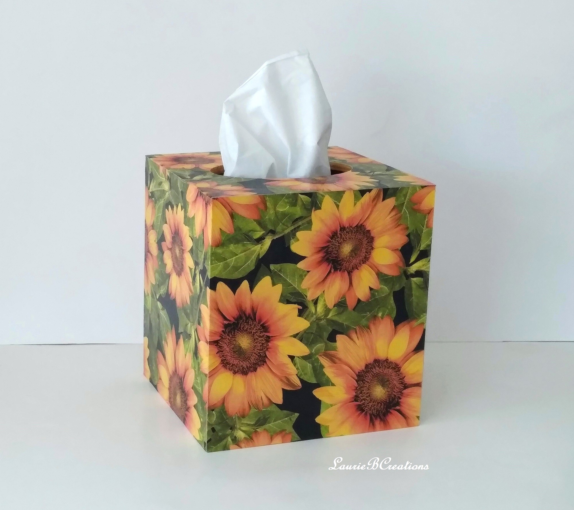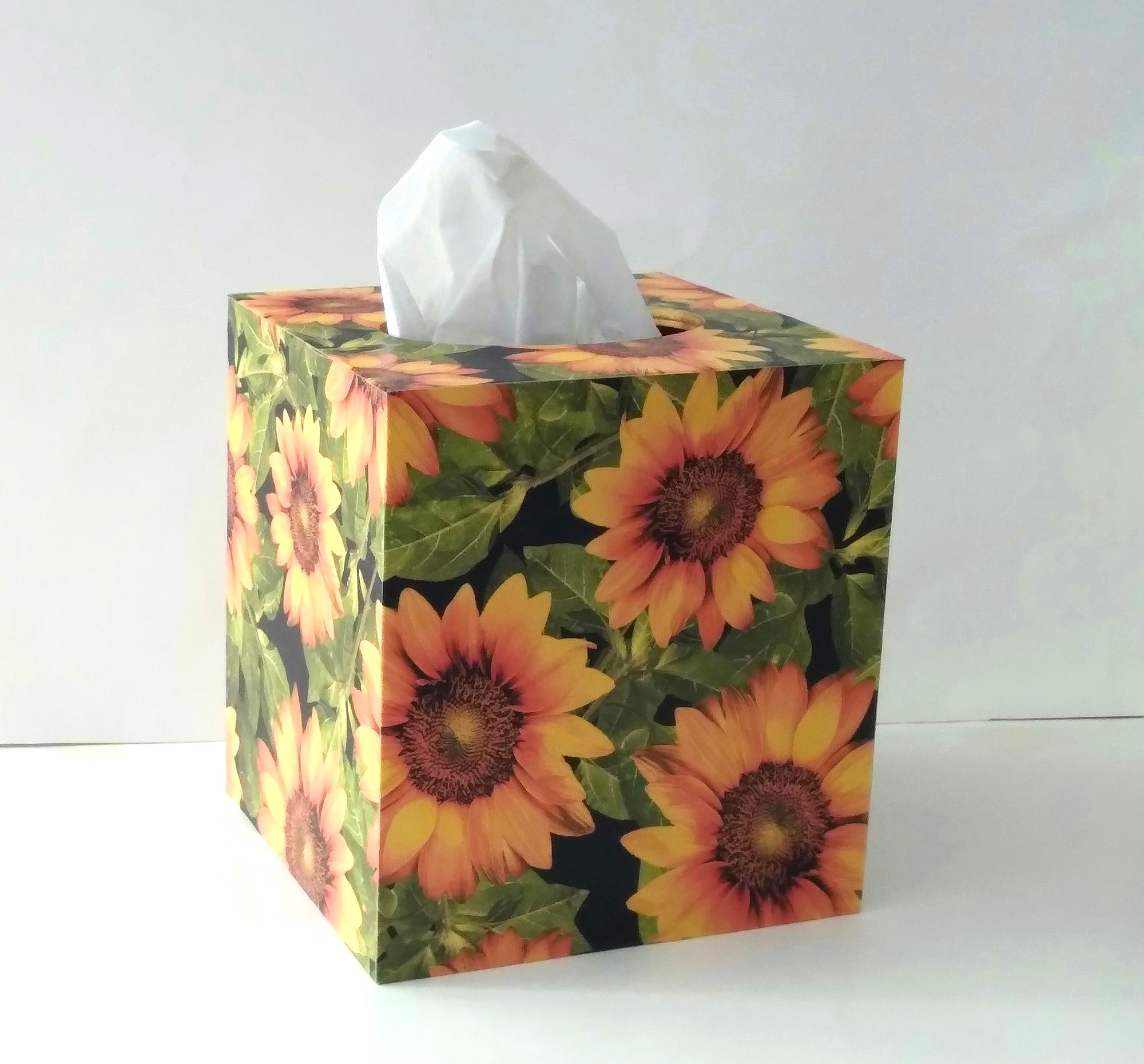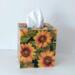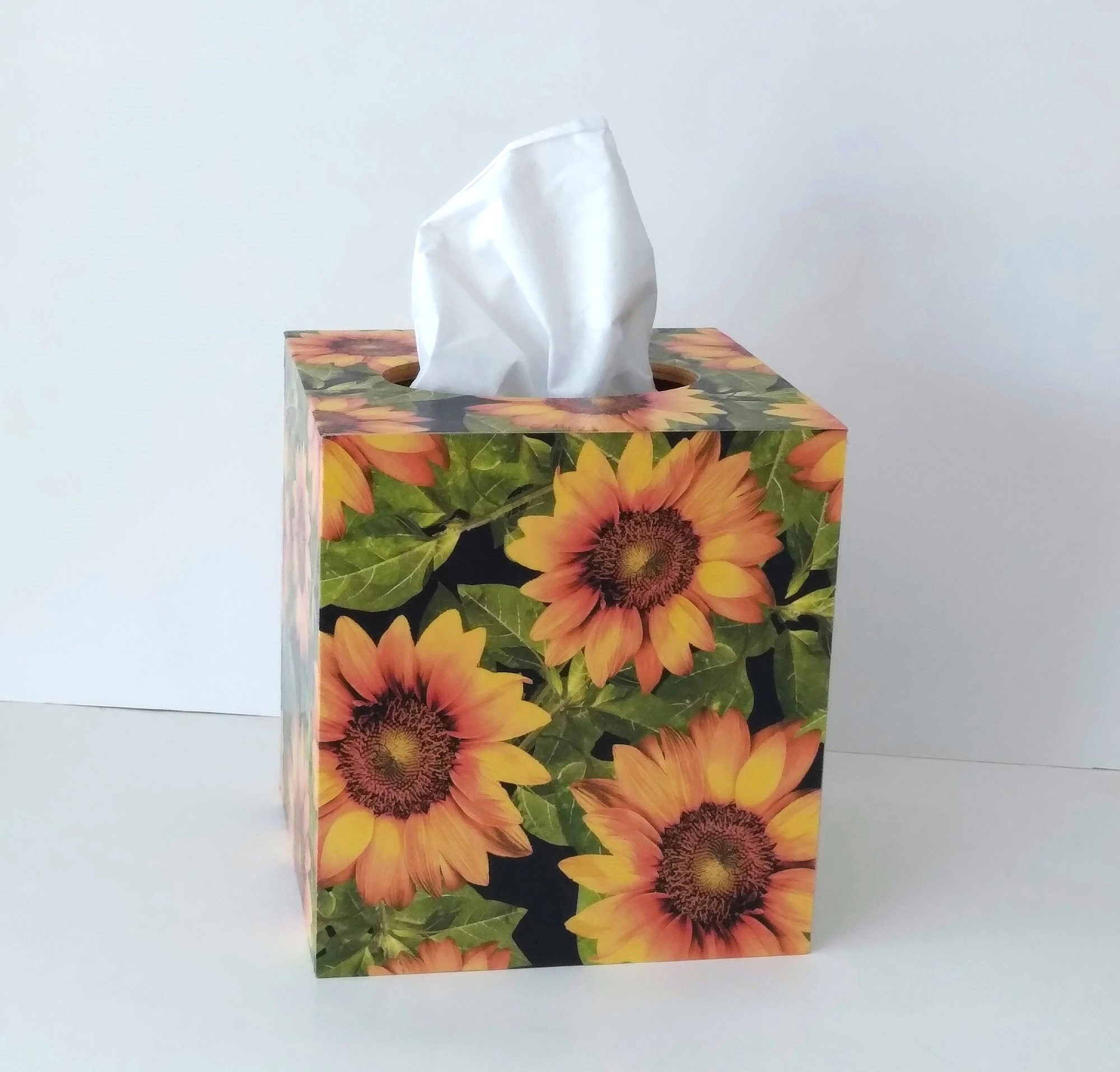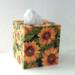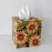 Cover your tissue box with the natural and inspirational touch of beautiful sunflowers! This decorative tissue box cover brightens any room with it's golden yellow sunflowers and green leaves on a black background. The design is applied to all sides. It is made with a decoupage technique that has a subtle gloss finish. The inside is handpainted with a golden non toxic acrylic paint. The base is made out of pine wood. It measures 5" x 5" x 5.8". It has an open bottom to fit right over any standard square tissue box. If you like sunflowers or floral decor, you will love this uplifting tissue box cover! Perfect with Fall or Summer decor. Handmade to order, please allow 5-7 business days to make and ship.