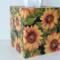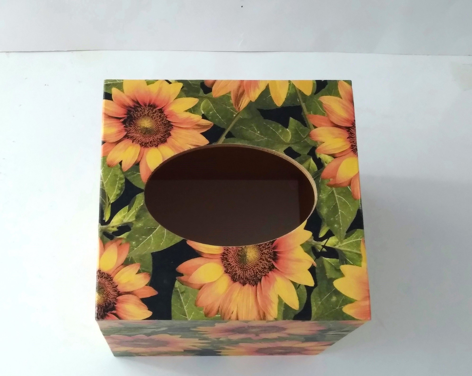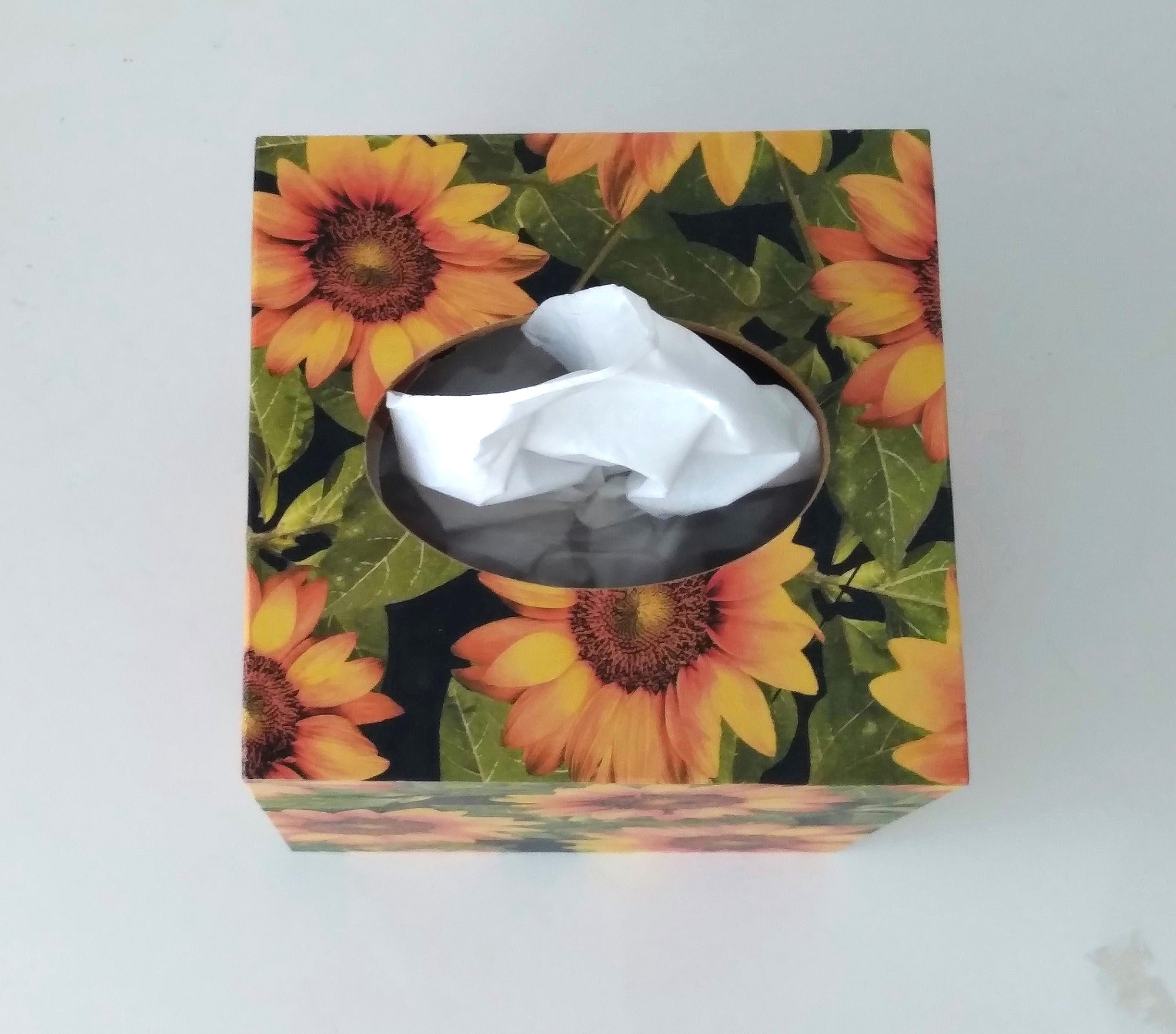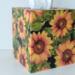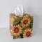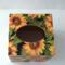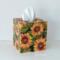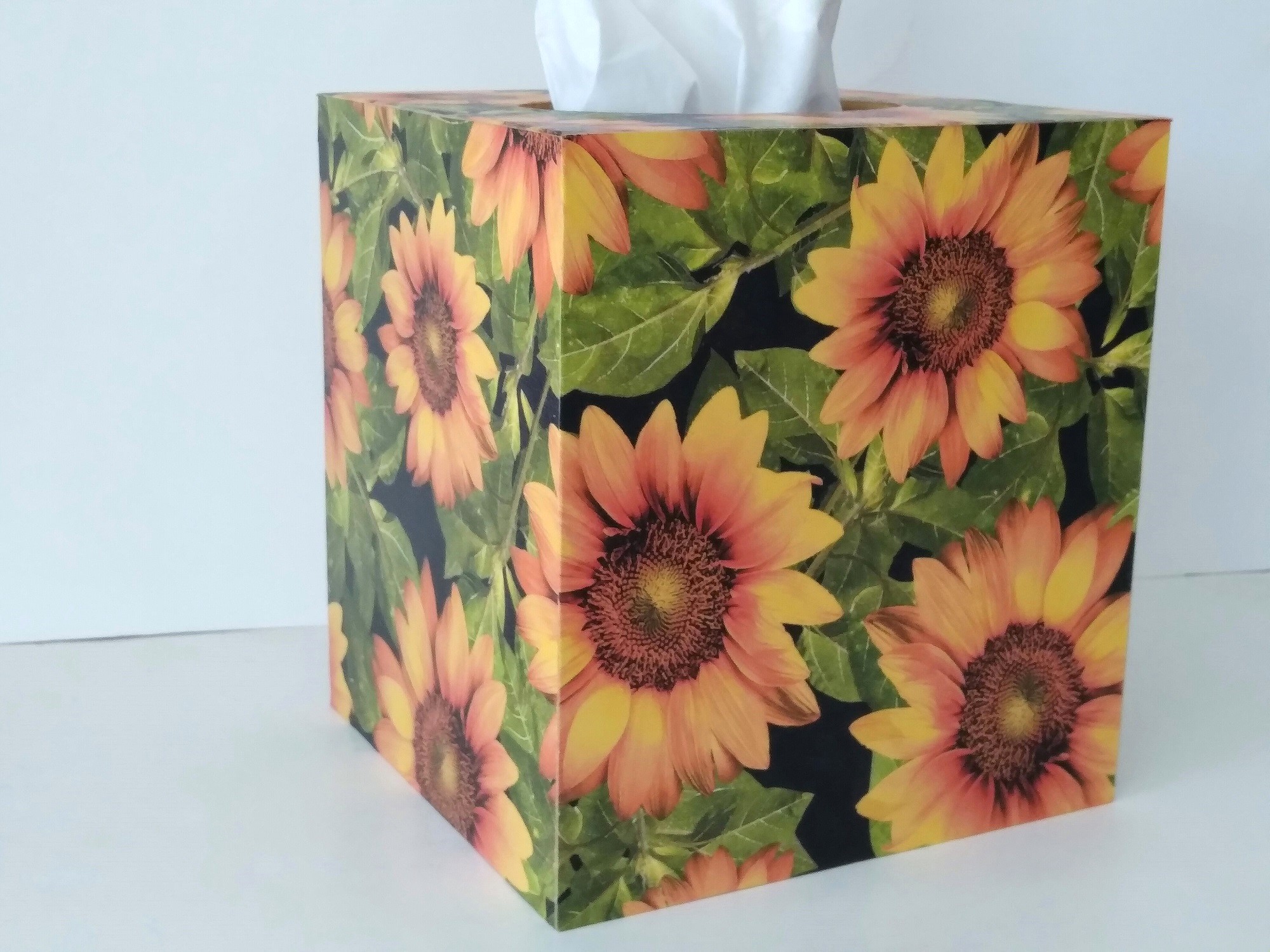 Cover your tissue box with the natural and inspirational touch of beautiful sunflowers! This decorative tissue box cover brightens any room with it's golden yellow sunflowers and green leaves on a black background. The design is applied to all sides. It is made with a decoupage technique that has a subtle gloss finish. The inside is handpainted with a golden non toxic acrylic paint. The base is made out of pine wood. It measures 5" x 5" x 5.8". It has an open bottom to fit right over any standard square tissue box. If you like sunflowers or floral decor, you will love this uplifting tissue box cover! Perfect with Fall or Summer decor. Handmade to order, please allow 5-7 business days to make and ship.