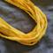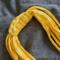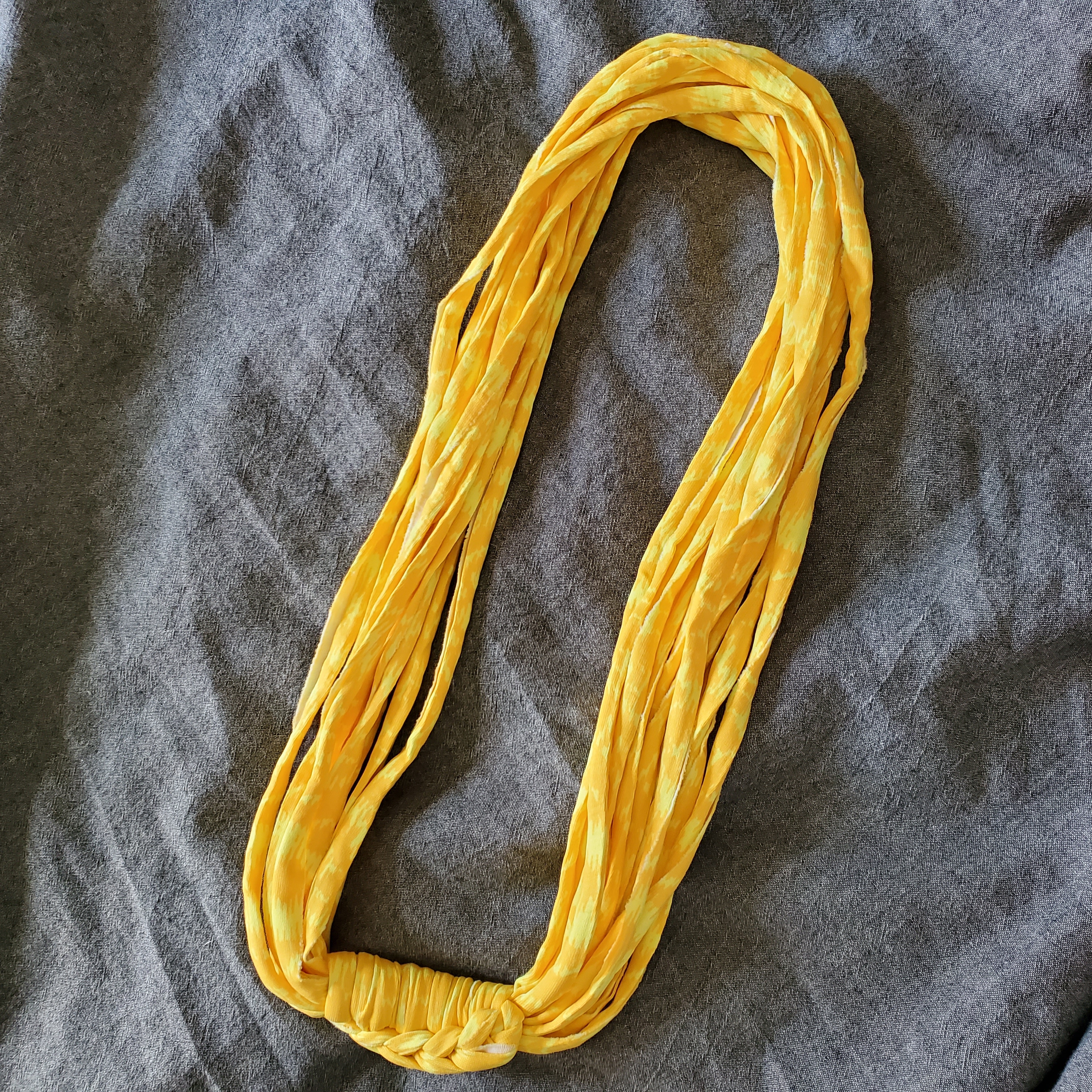 This listing is for a recycled t-shirt necklace in a sunshine yellow print. This fabric necklace is made from upcycled tshirt yarn (tarn). The fabric is salvaged from the end of the run at clothing factories, cut into strips, and turned into yarn. This necklace is great for people with a metal allergy, since it is metal-free.