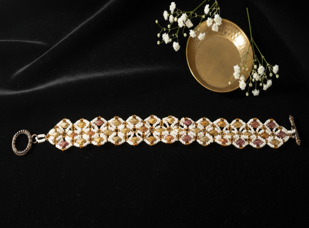 This luminous, handwoven bracelet radiates warmth and rustic elegance. Inspired by sunlit canyons and desert sand, this piece features a repeating diamond pattern in amber, rose, and butterscotch. The soft cream seed bead background adds a subtle glow, while bronze and copper accents give it earthy richness. Finished with a beautifully patterned antiqued copper toggle clasp, this bracelet measures about 8.5 inches from end to end and brings a touch of light and artisan craftsmanship to your wrist — perfect for both casual wear and elegant layering.