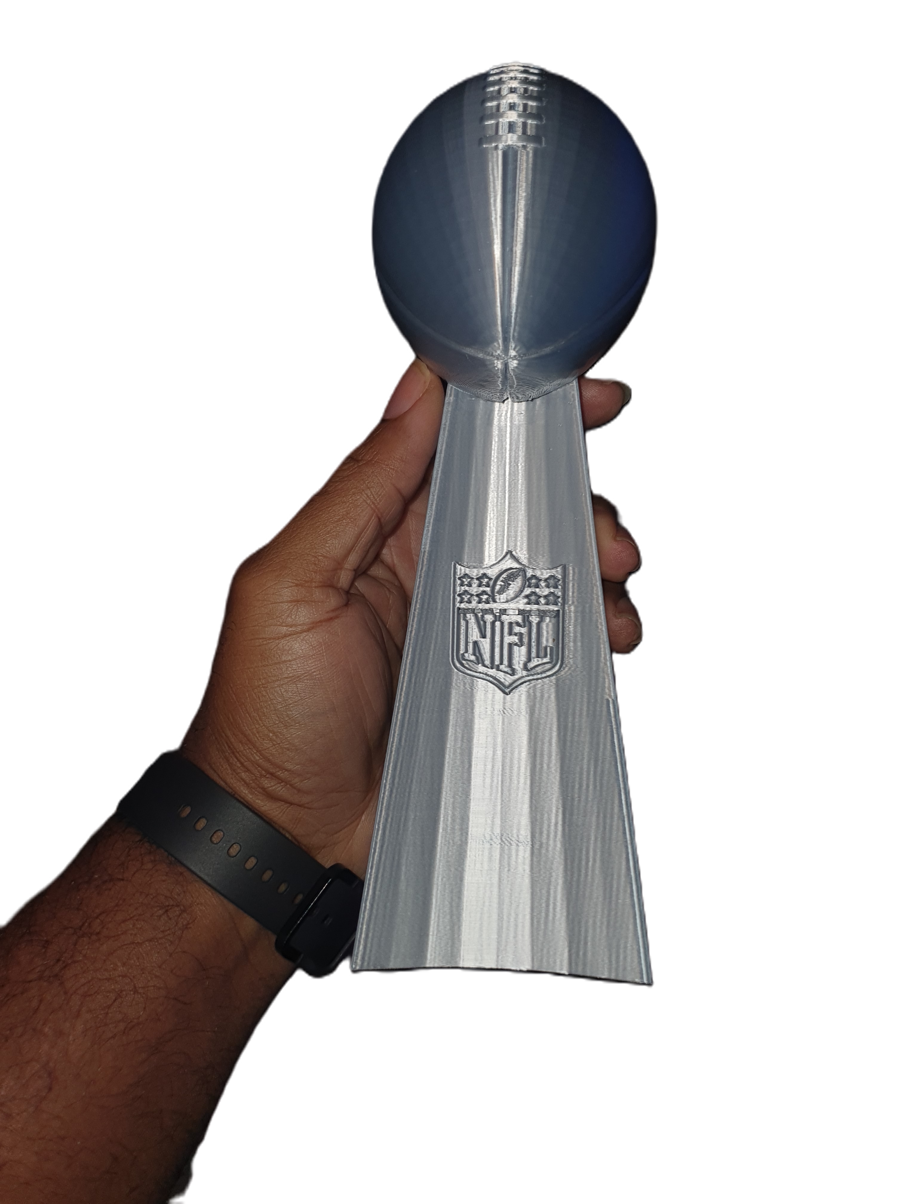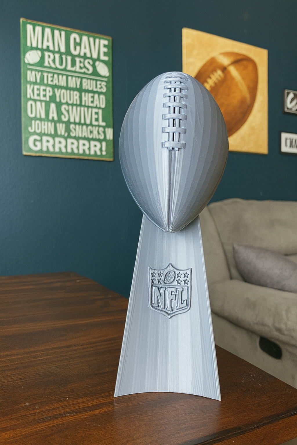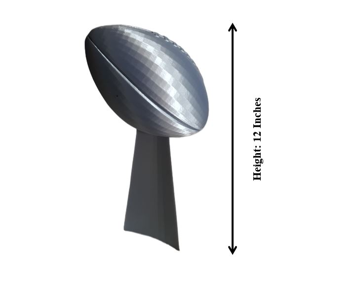 Description: Super Bowl Football Trophy has a sleek, shiny finish. This eye-catching piece is perfect for fantasy leagues, game-room décor, or rewarding the champion of your season. Standing a full 12 inches tall, it captures the look and presence of the iconic Super Bowl trophy while keeping things lightweight and durable with high-quality 3D-printed construction.