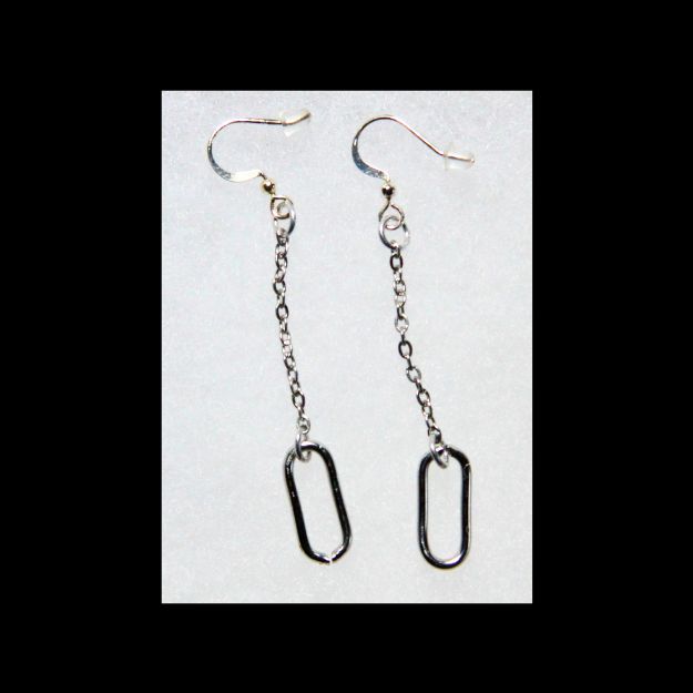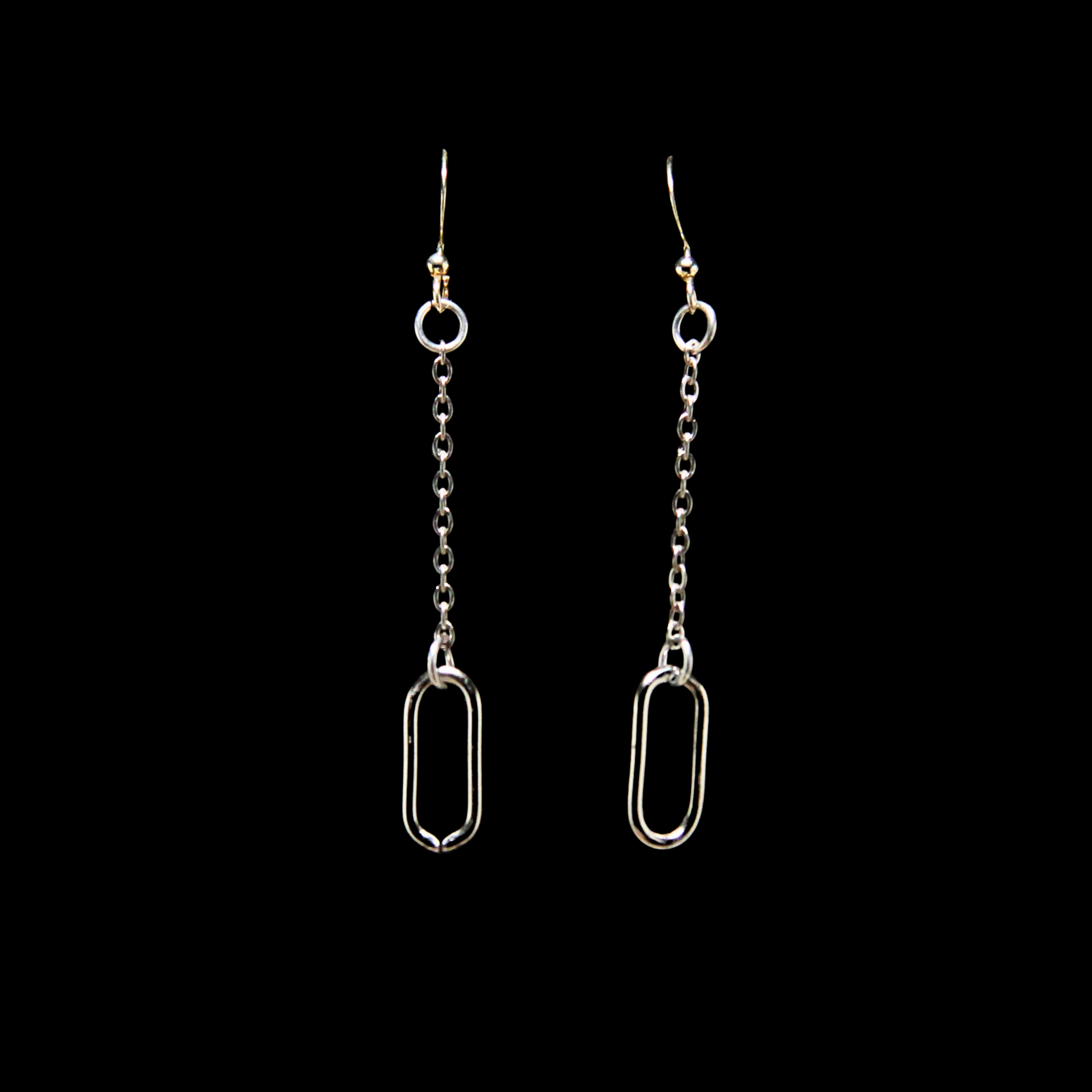 I select two surgical stainless steel paper clip chain links, then cut two equal lengths of surgical stainless steel flat oval cable chain and attach each with surgical stainless steel jump ring connectors. I finish the earrings by attaching solid 925 sterling silver ear wires (which are stamped for authenticity). They make a cute pair of boho earrings!