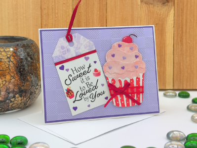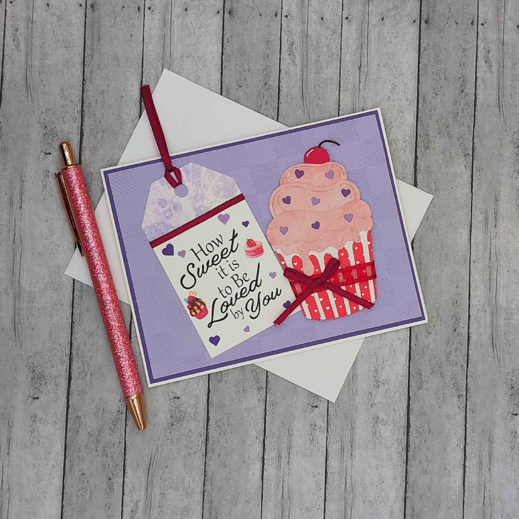 Celebrate the sweetness of love with this handmade greeting card featuring a cupcake topped with pink frosting, purple heart sprinkles, and a cherry on top. The tag reads “How sweet it is to be loved by you,” surrounded by candy and heart accents. A purple checkered background and red ribbon details add playful charm. Blank inside for your personal message. Perfect for Valentine’s Day, anniversaries, or just-because moments. A whimsical keepsake for anyone who loves romance, cupcakes, and heartfelt gestures.