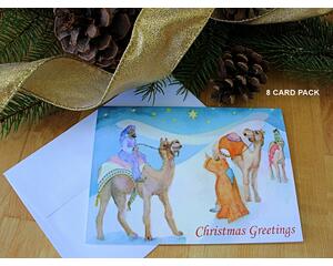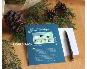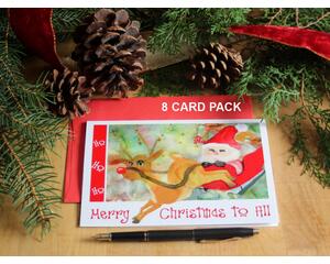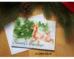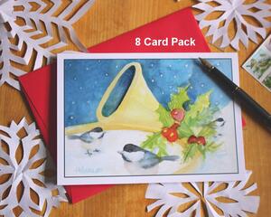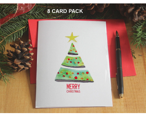 Merry Christmas card adorned with 4 quirky watercolor pine cones sitting in a row.  The one on the left is decorated like a Christmas tree.