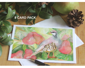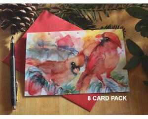 Loosely painted watercolor print of 2 cardinals on the branches of a blue spruce tree. Its loaded with color. Horizontal format. Bird lover