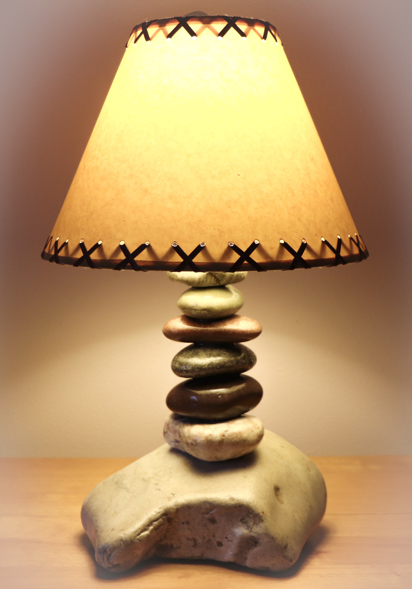Each stone of this lamp is first drilled through with a 3/8" bit and then the stones are joined together with a 3/8" steel rod and glued together with a high strength epoxy glue. The durable construction of this piece makes The Clearwater Tall Stone Lamp truly an heirloom quality creation.