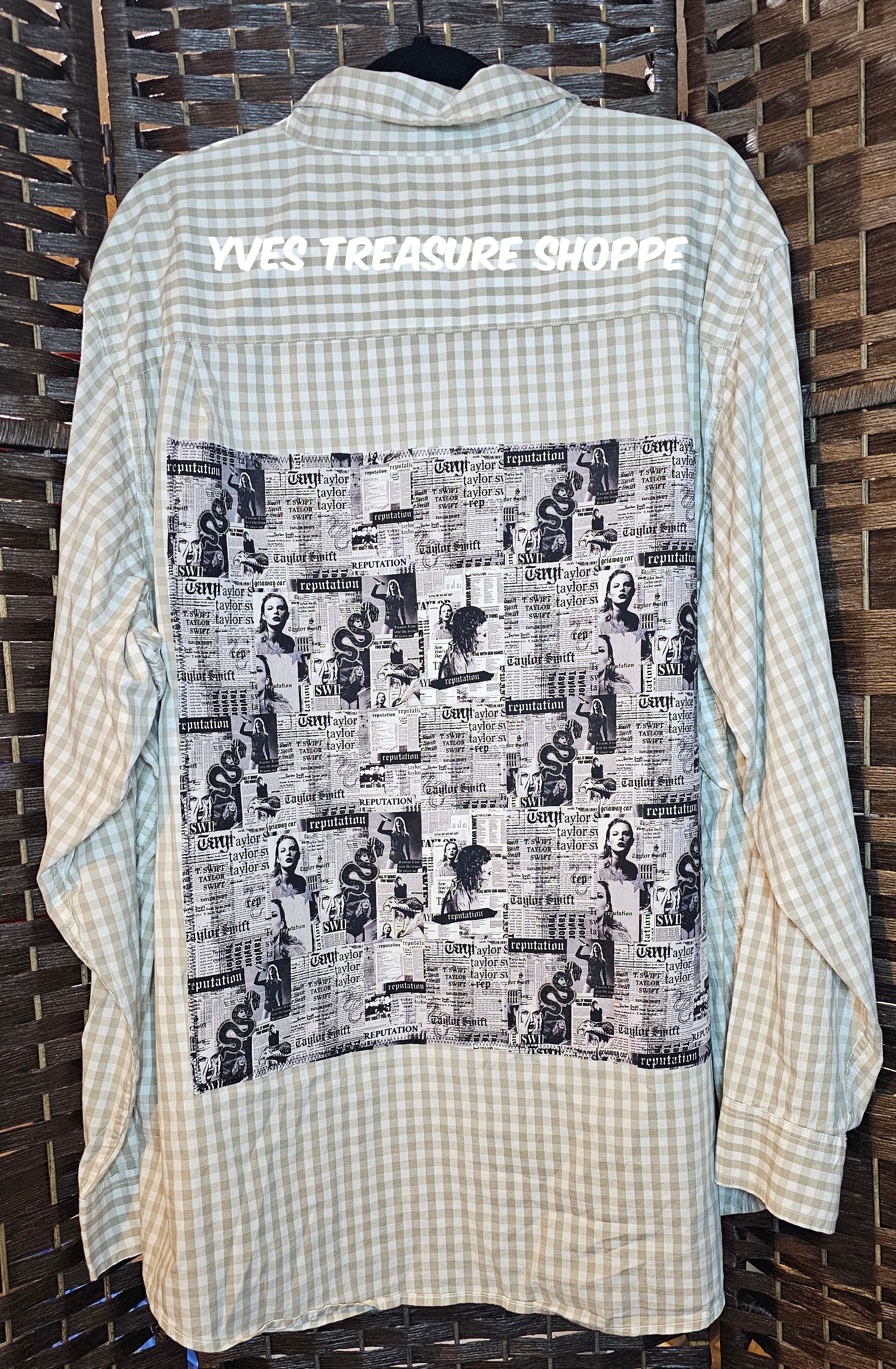 This is a New Refashioned George 3XL Shirt. 30.5 inches across pit to pit. 33 inches long from top of shoulder to bottom of shirt. Embellished on back with a fabric Panel.