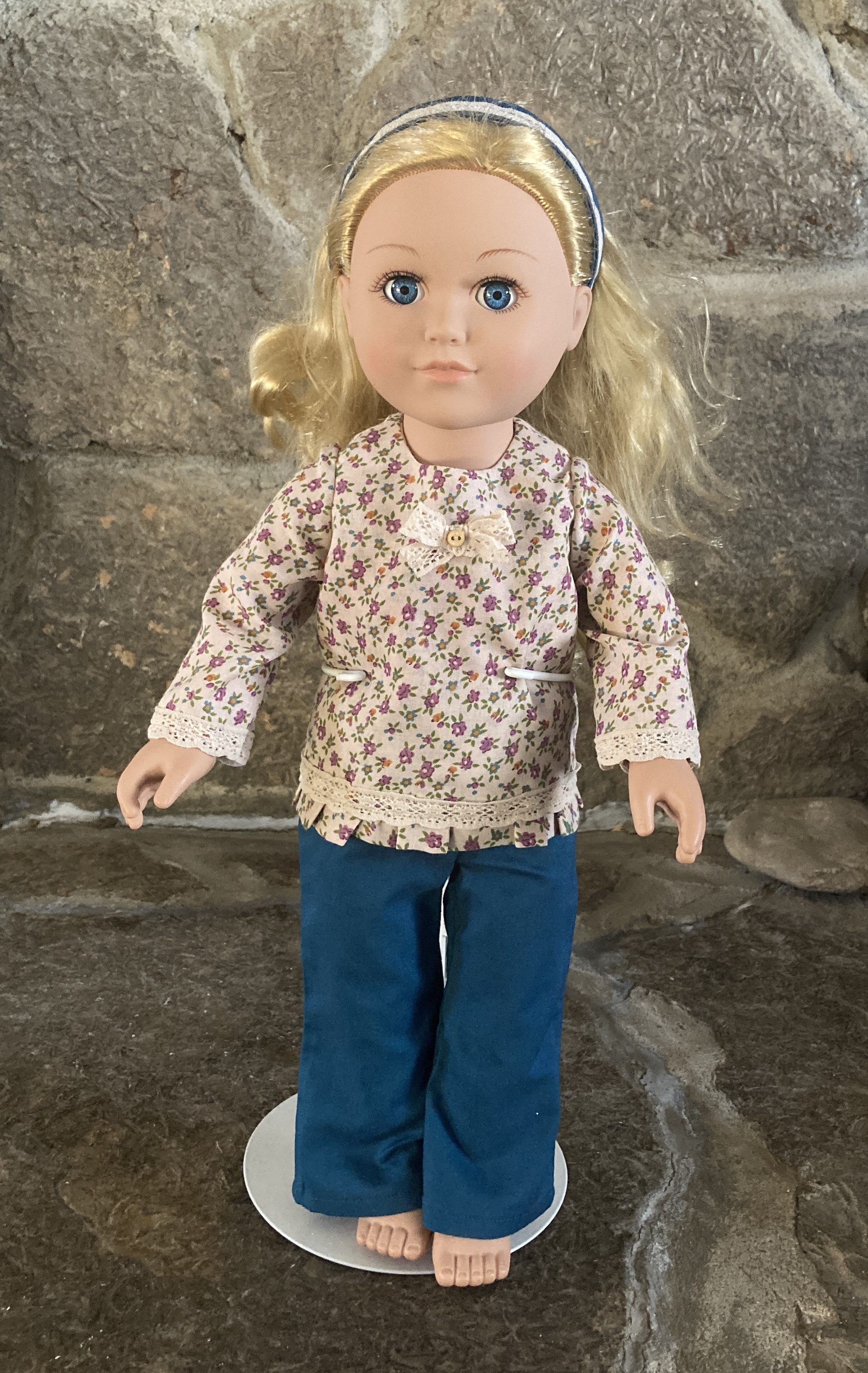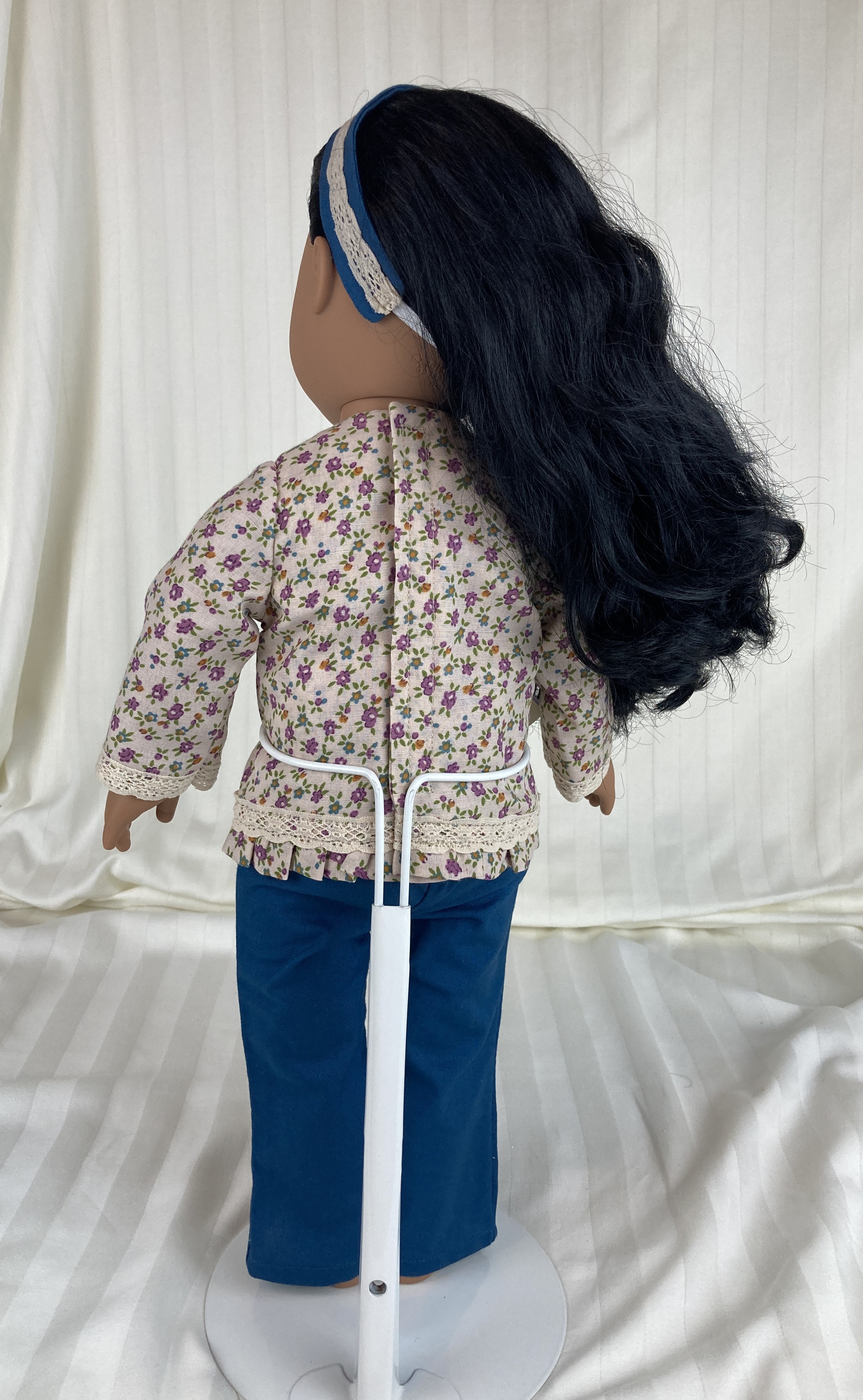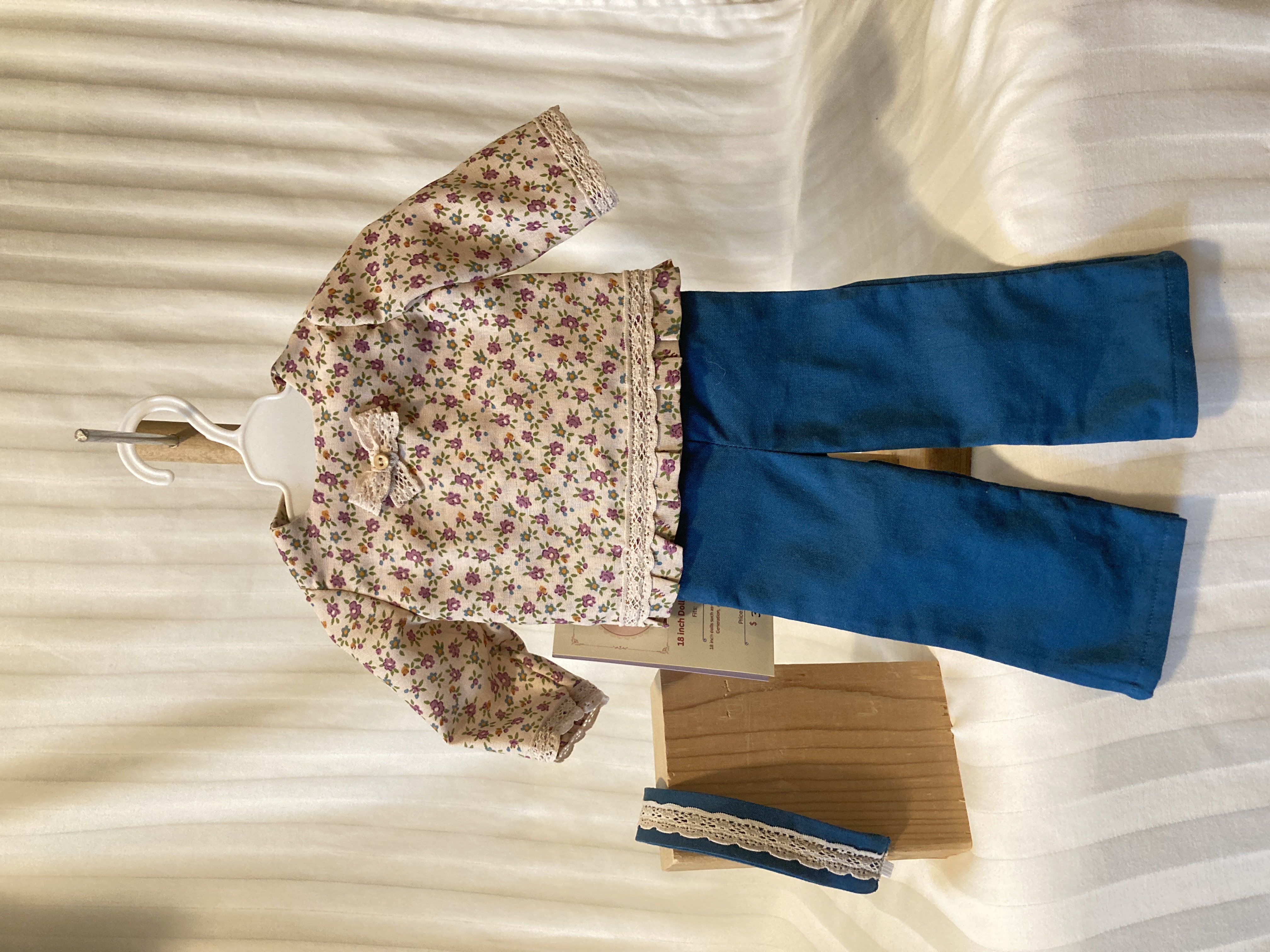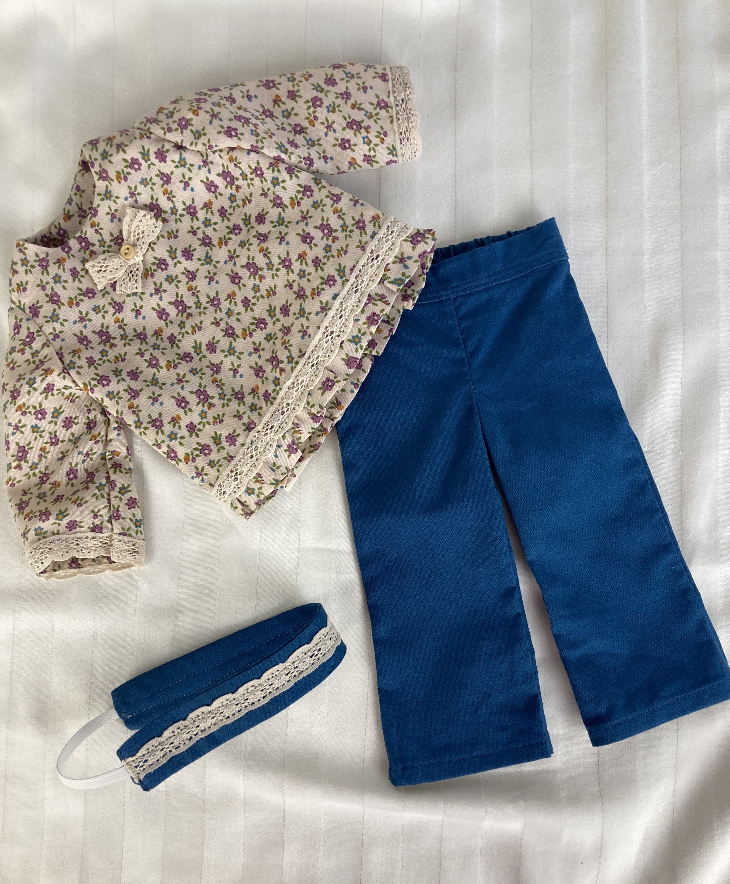 This three piece doll outfit has a pair of pants, a top, and a headband. The top is made from a polyester blend tan floral fabric. It has long sleeves, edged in tan lace, a round neckline, a lace bow and button detail at the neckline and a small ruffle along the shirt's hemline topped with more of the tan lace. The back closure is hook and loop. The pants are made from a cotton teal fabric and have an elastic waist. The matching headband is made from the teal fabric and has a tan lace detail on top.