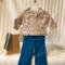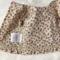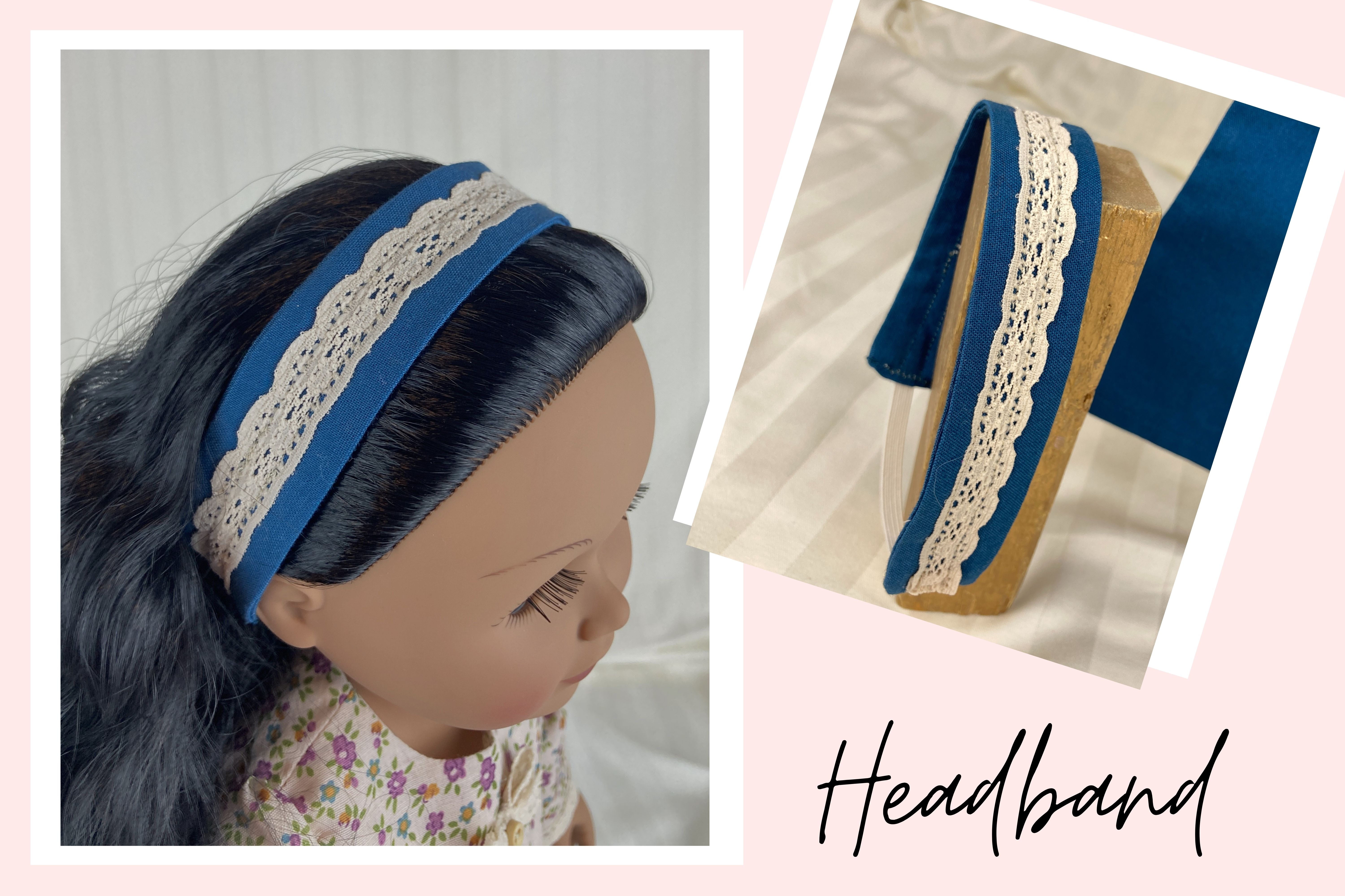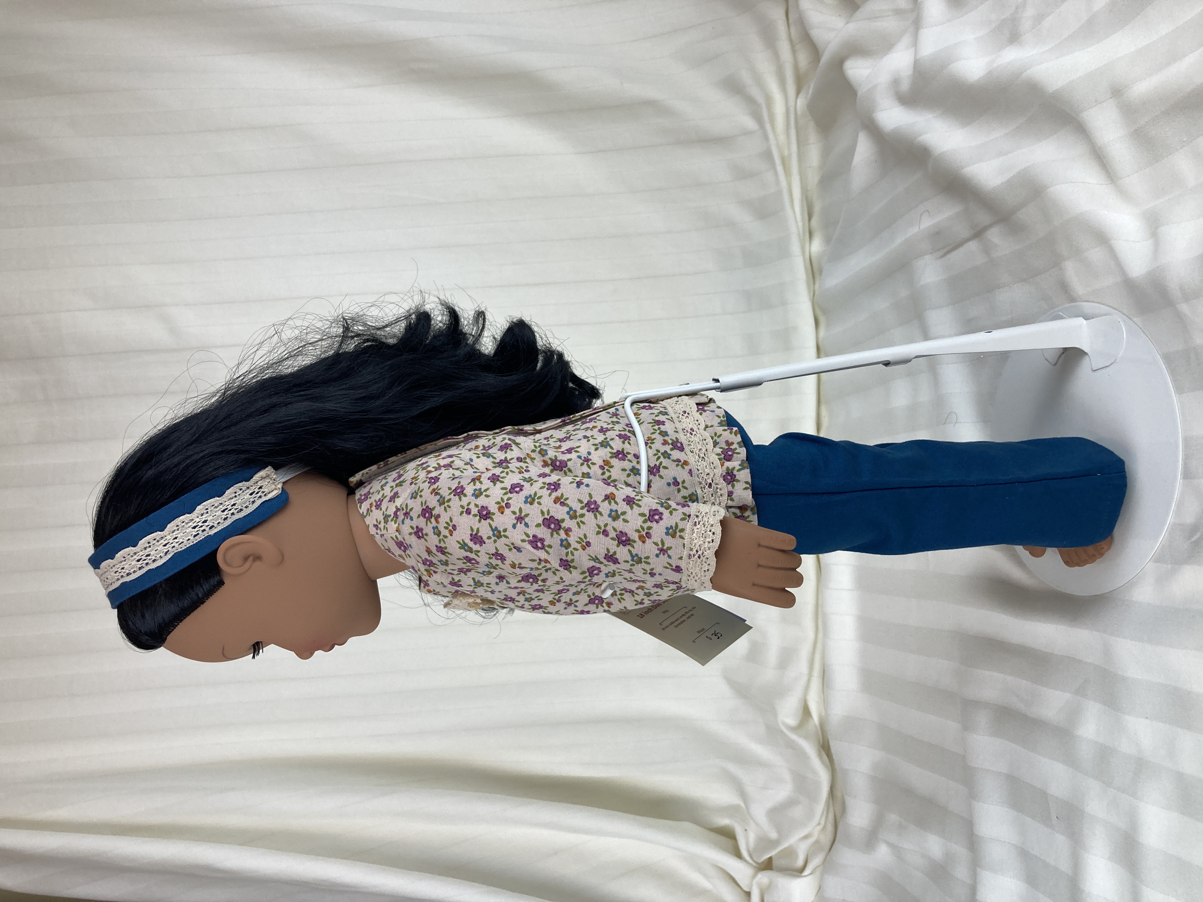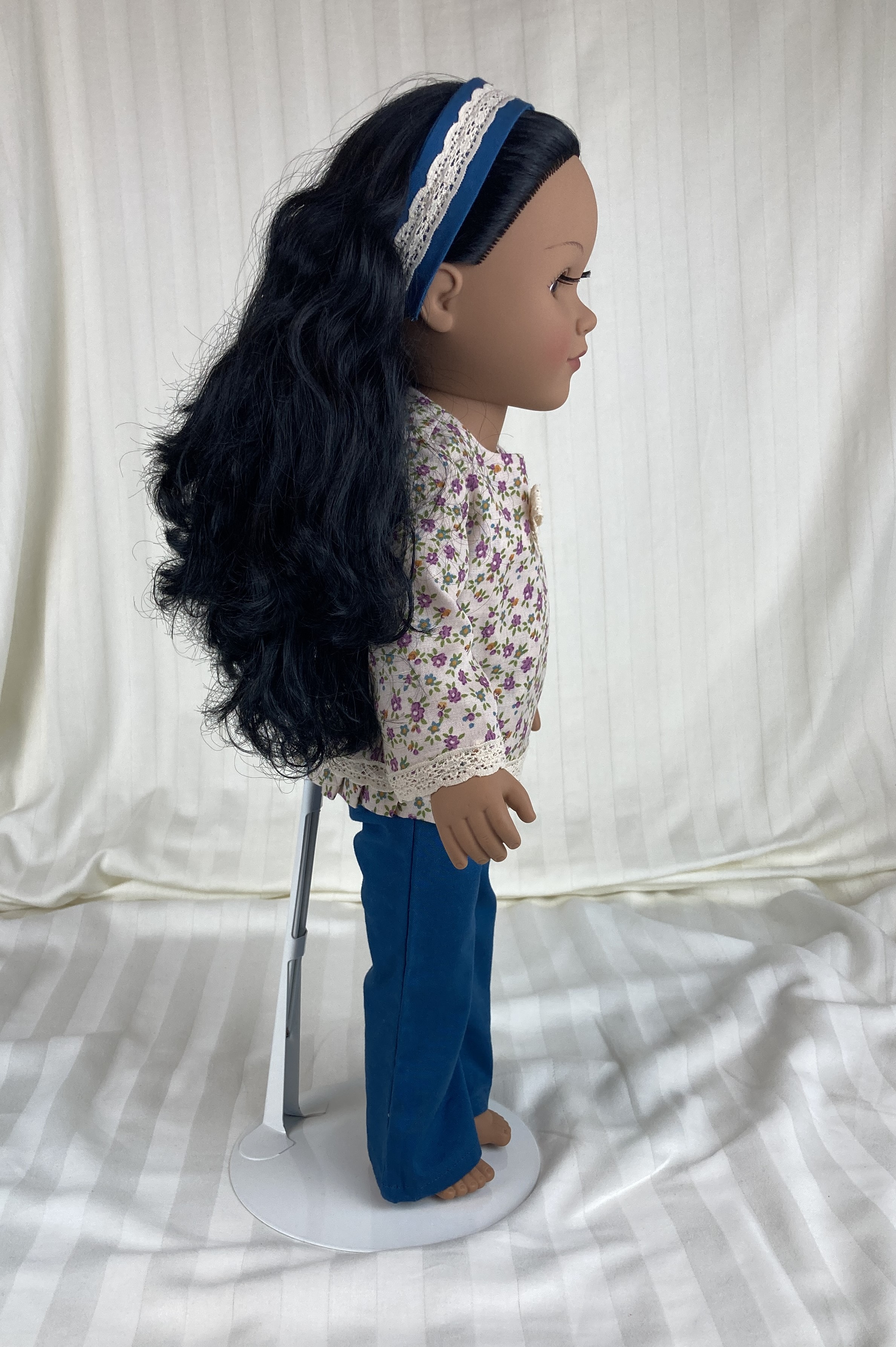 This three piece doll outfit has a pair of pants, a top, and a headband. The top is made from a polyester blend tan floral fabric. It has long sleeves, edged in tan lace, a round neckline, a lace bow and button detail at the neckline and a small ruffle along the shirt's hemline topped with more of the tan lace. The back closure is hook and loop. The pants are made from a cotton teal fabric and have an elastic waist. The matching headband is made from the teal fabric and has a tan lace detail on top.