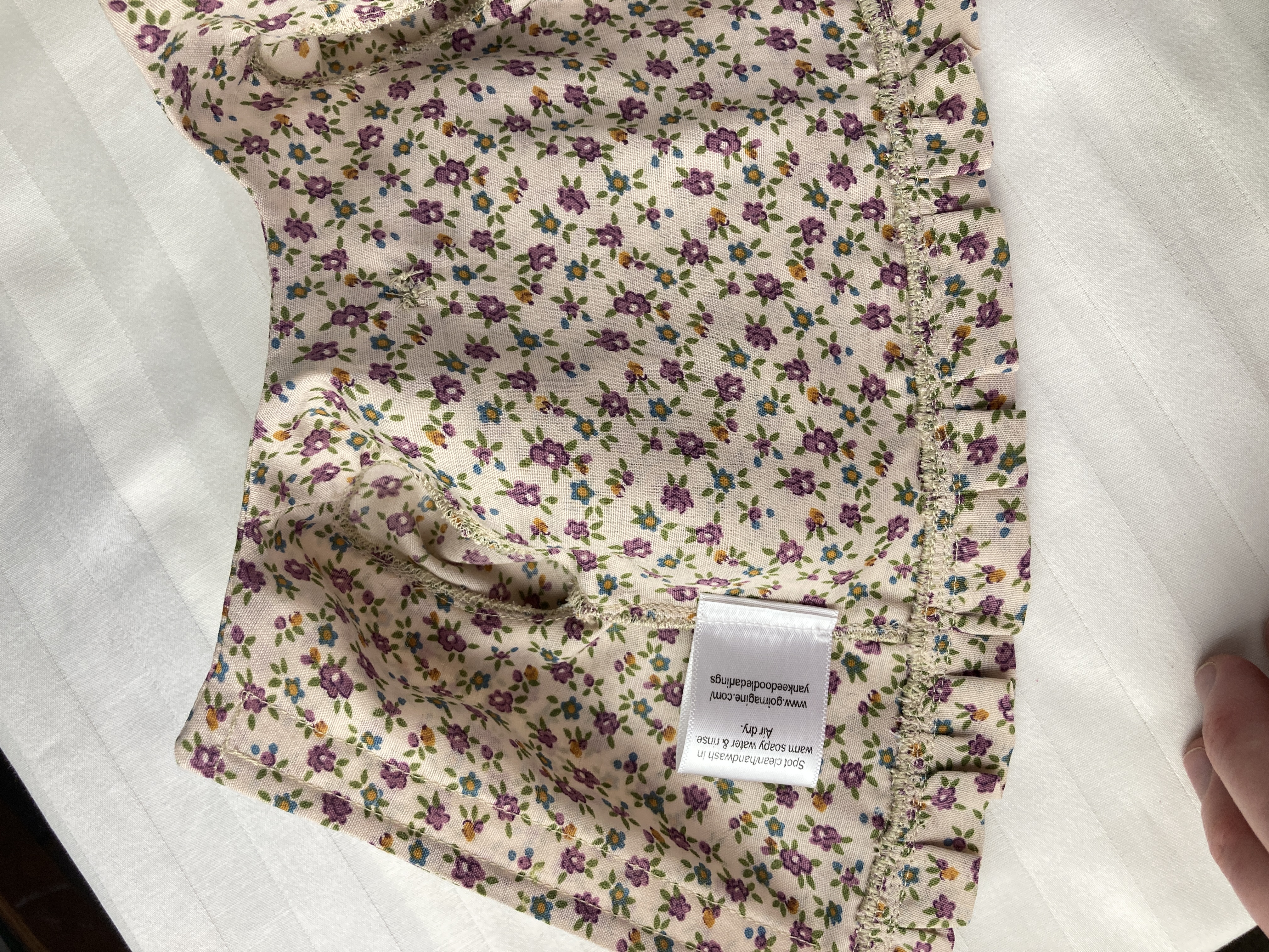 Care Instructions: For small dirt spots use a clean wash cloth or rag and rub the spot out with lukewarm soapy water. For heavy duty cleaning, gently swish/lightly scrub dress together in warm soapy water. Empty water and rinse in a tub of clean water. Pat dry with a towel and let air dry. Iron on low setting if desired, watching out for lace and trims that might melt. If dress has red fabric or super pigmented fuchsia or coral fabric, DO NOT do heavy duty cleaning. Spot clean dirty area with a lukewarm soapy wash cloth or rag. Otherwise fabric may bleed onto other fabric colors.
