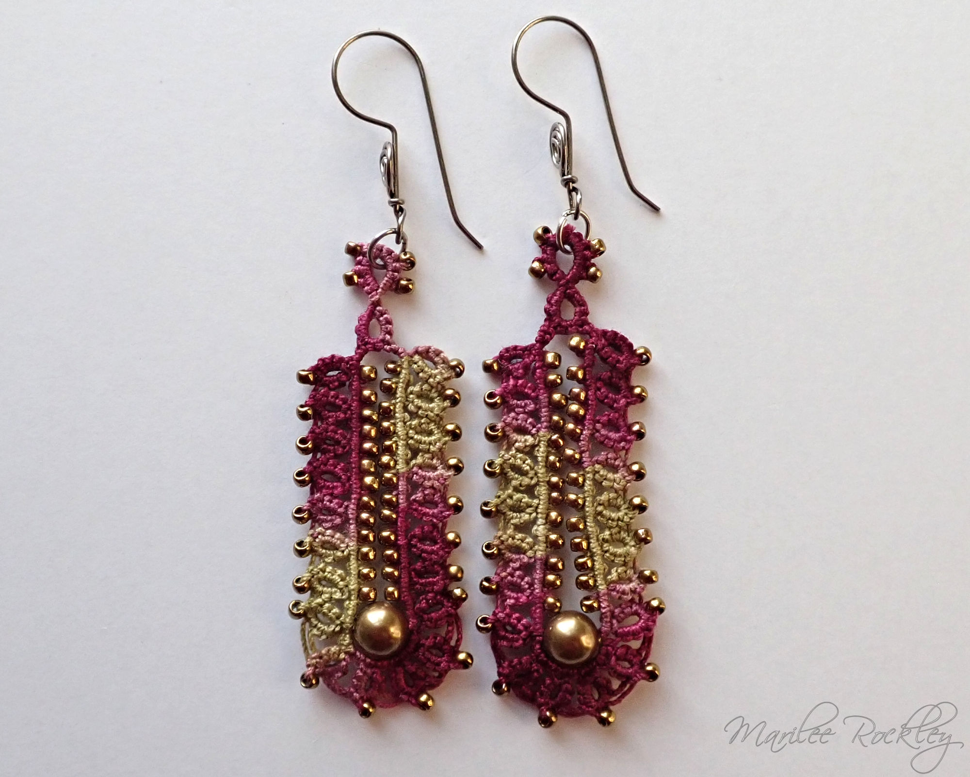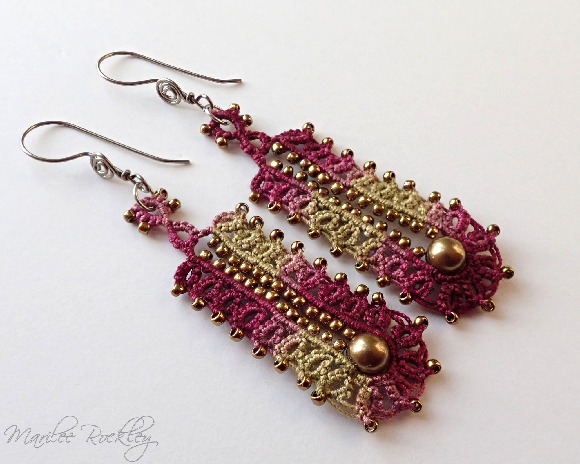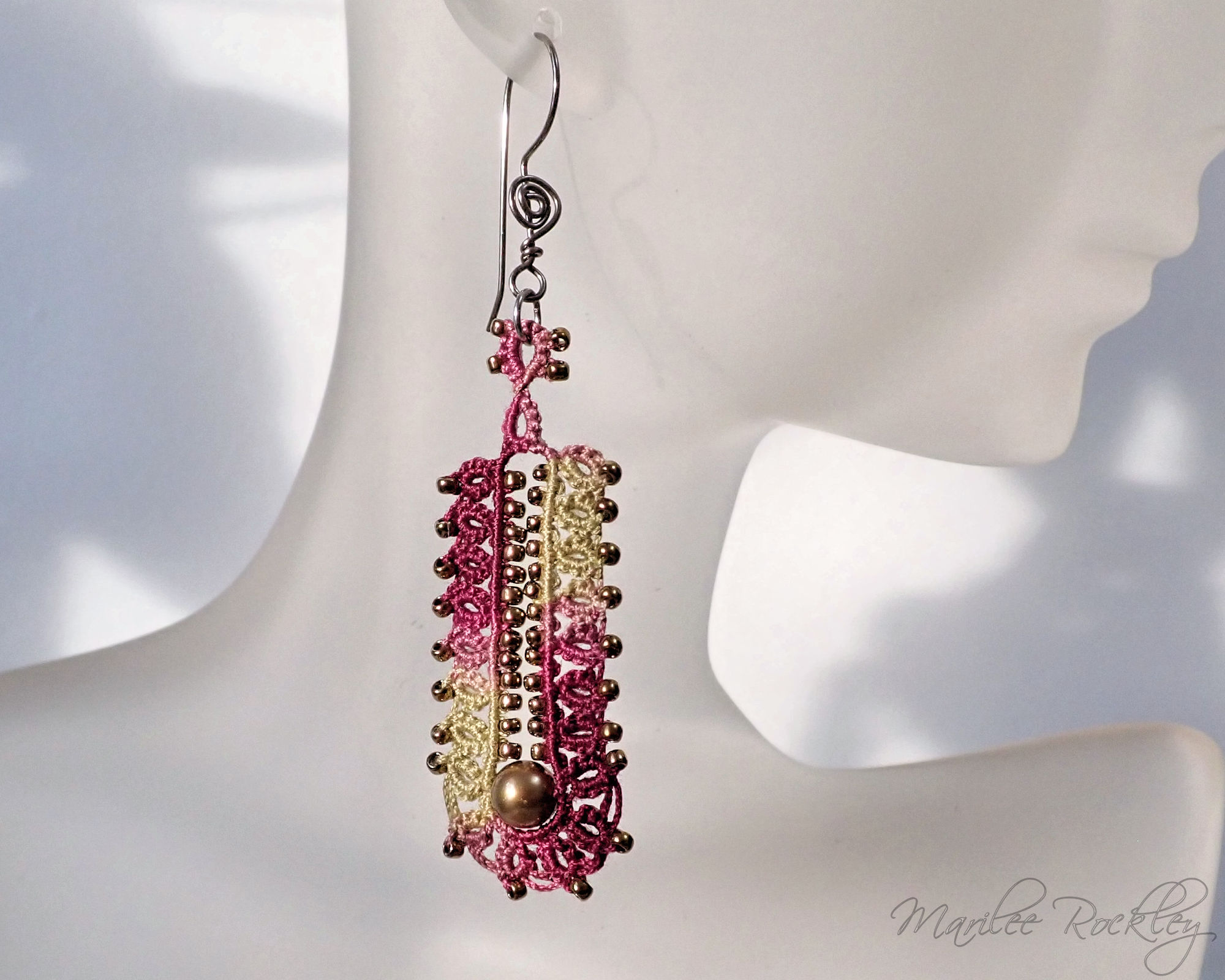 Tatted lace earrings handmade in hand dyed thread from my own design with hand formed earwires of niobium. The pattern is called "Cocoon" and is available in the book "Marilee's Beaded Tatting Finery" which is another listing in my shop as an instant download.