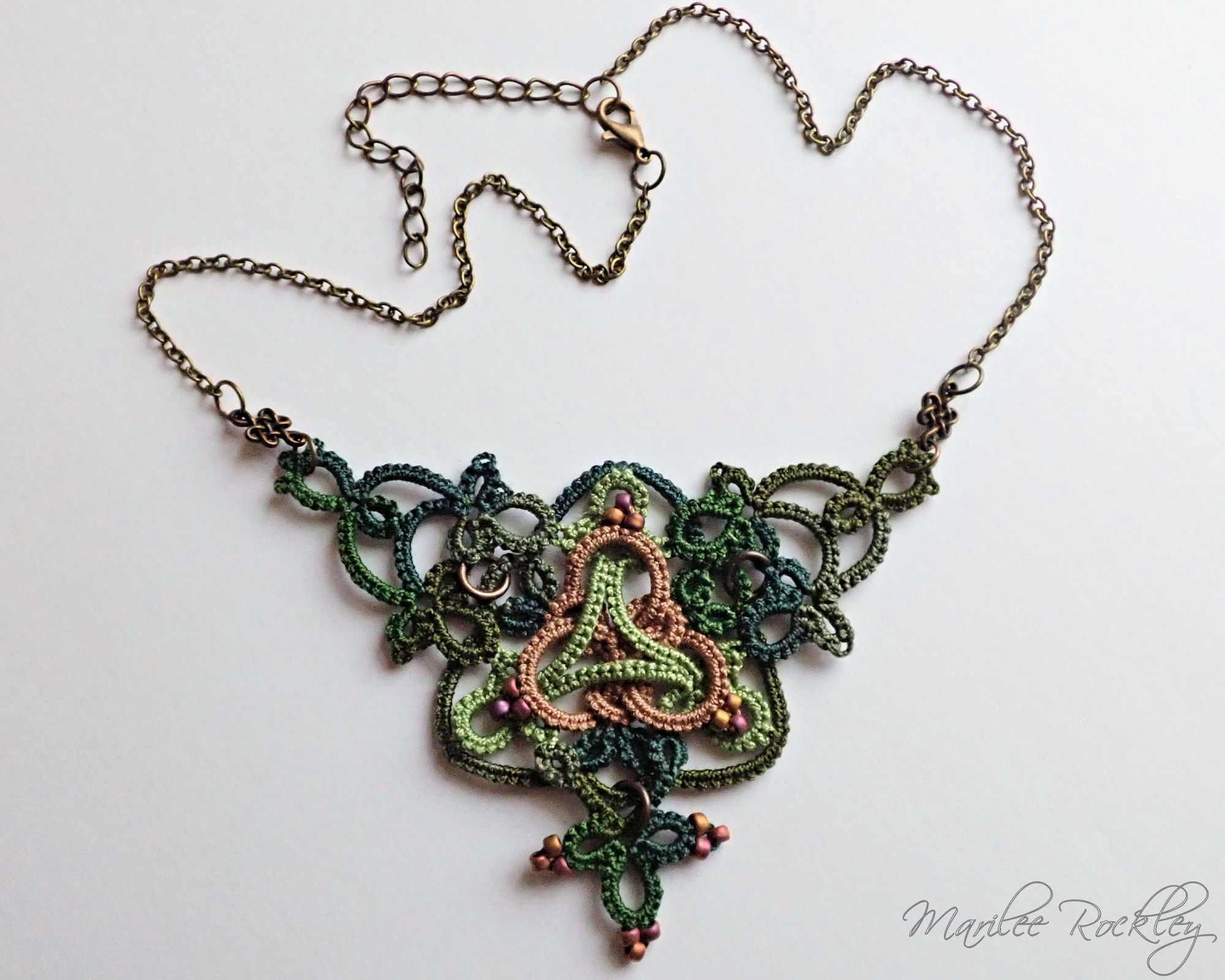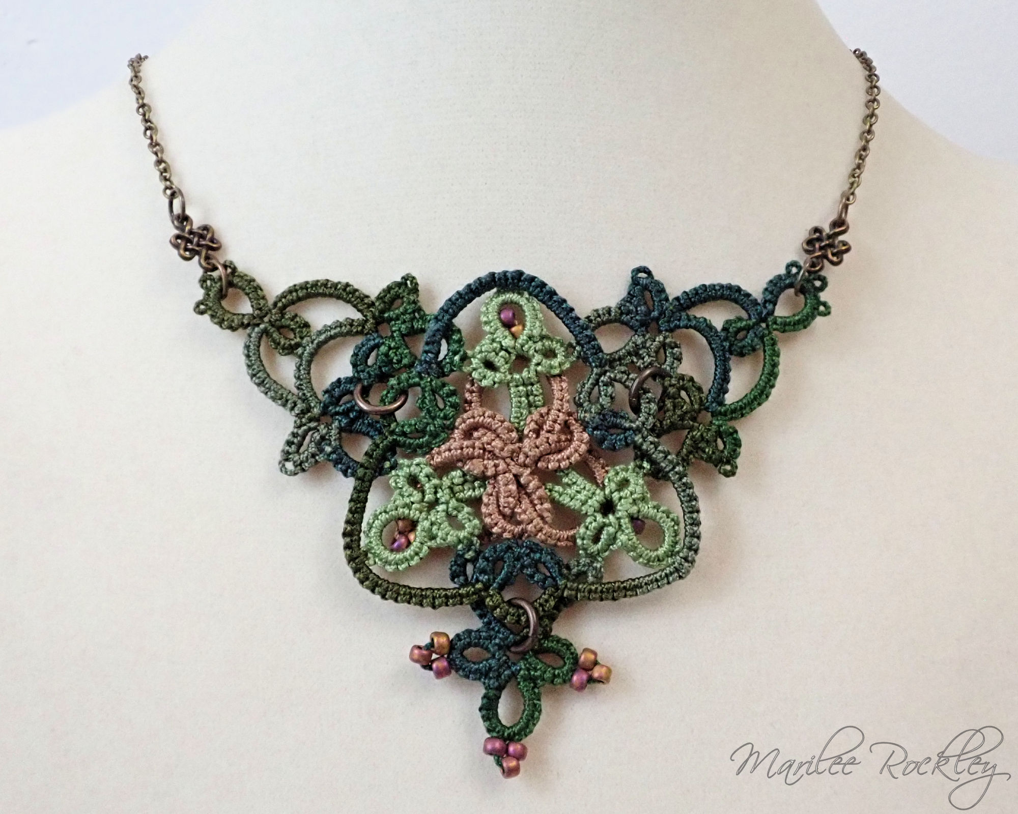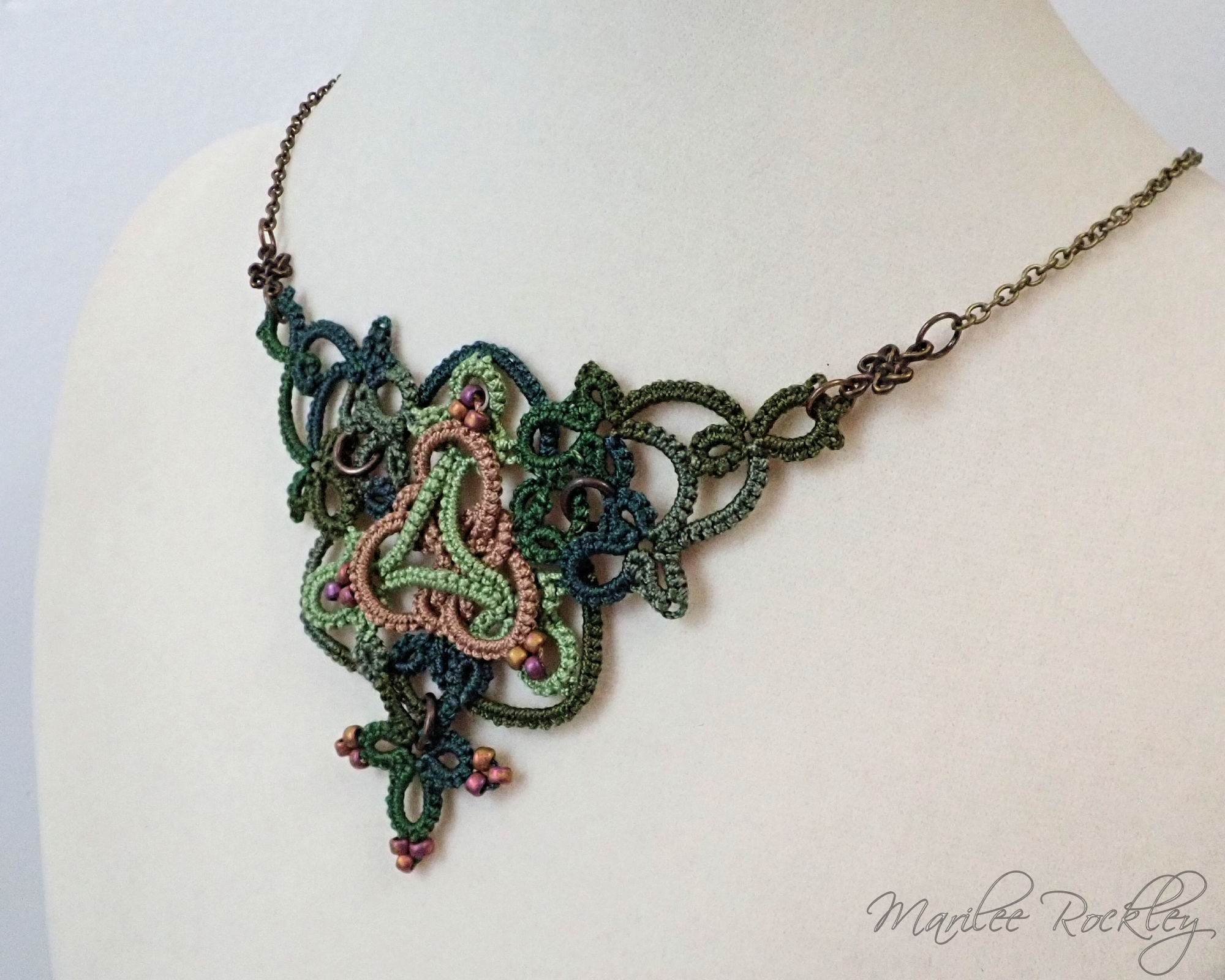 I tatted the lace using high quality Lizbeth cotton cordonnet thread. The necklace is finished with an antiqued brass plated chain adjustable from 16 inches to 19 inches. The lace design is both different and attractive on either side.