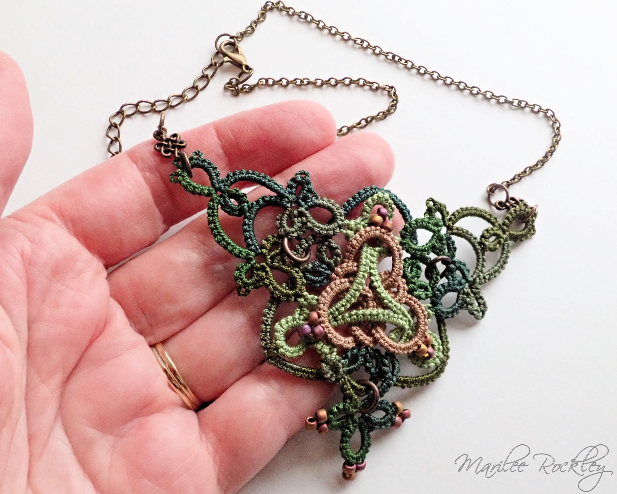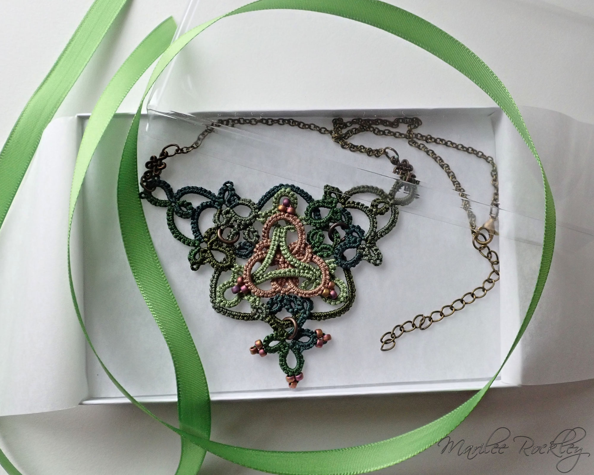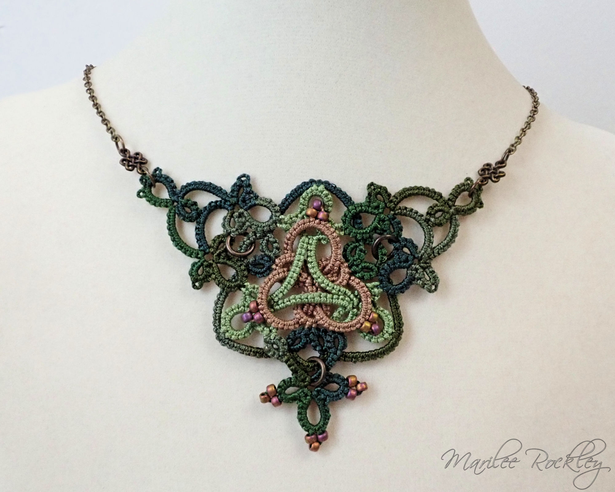 Tatted lace Celtic Triangle necklace which I made from my own design "Celtic Triangle Necklace". (The pattern is available in another listing in my shop as an instant download.)