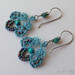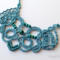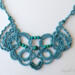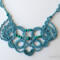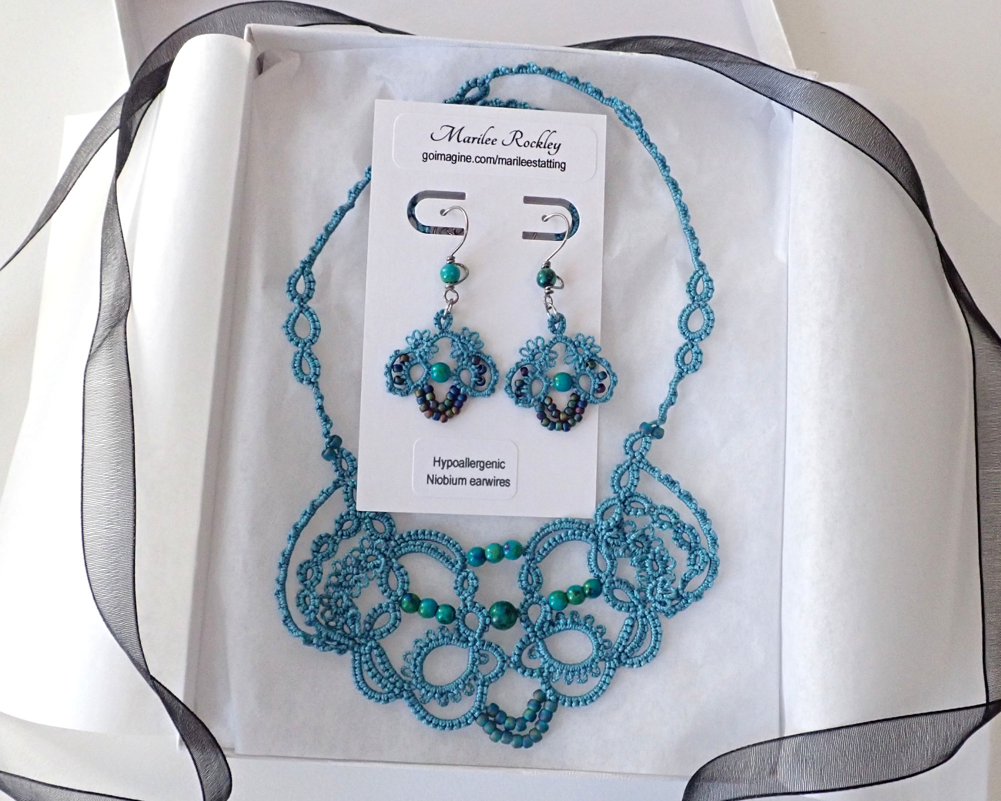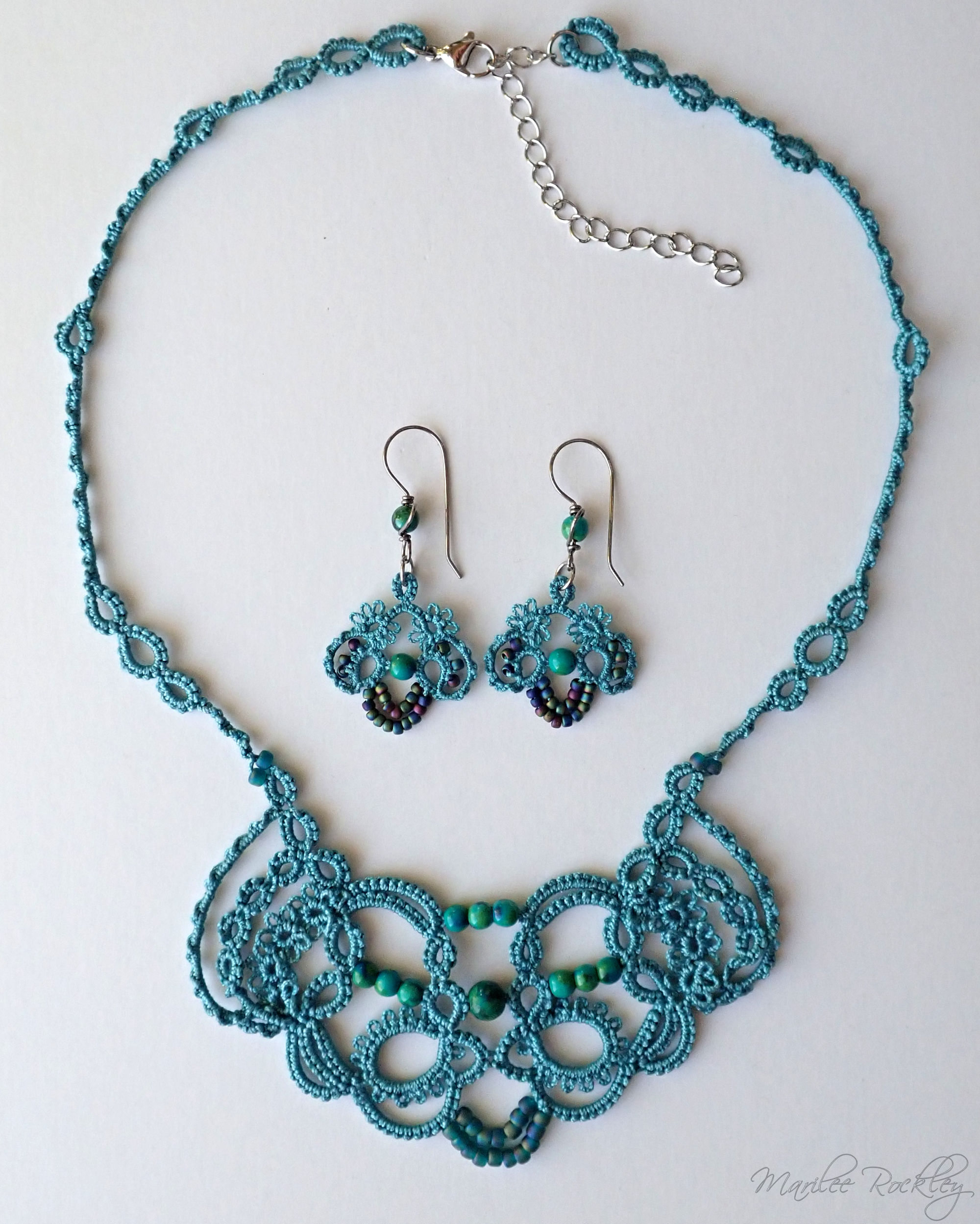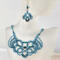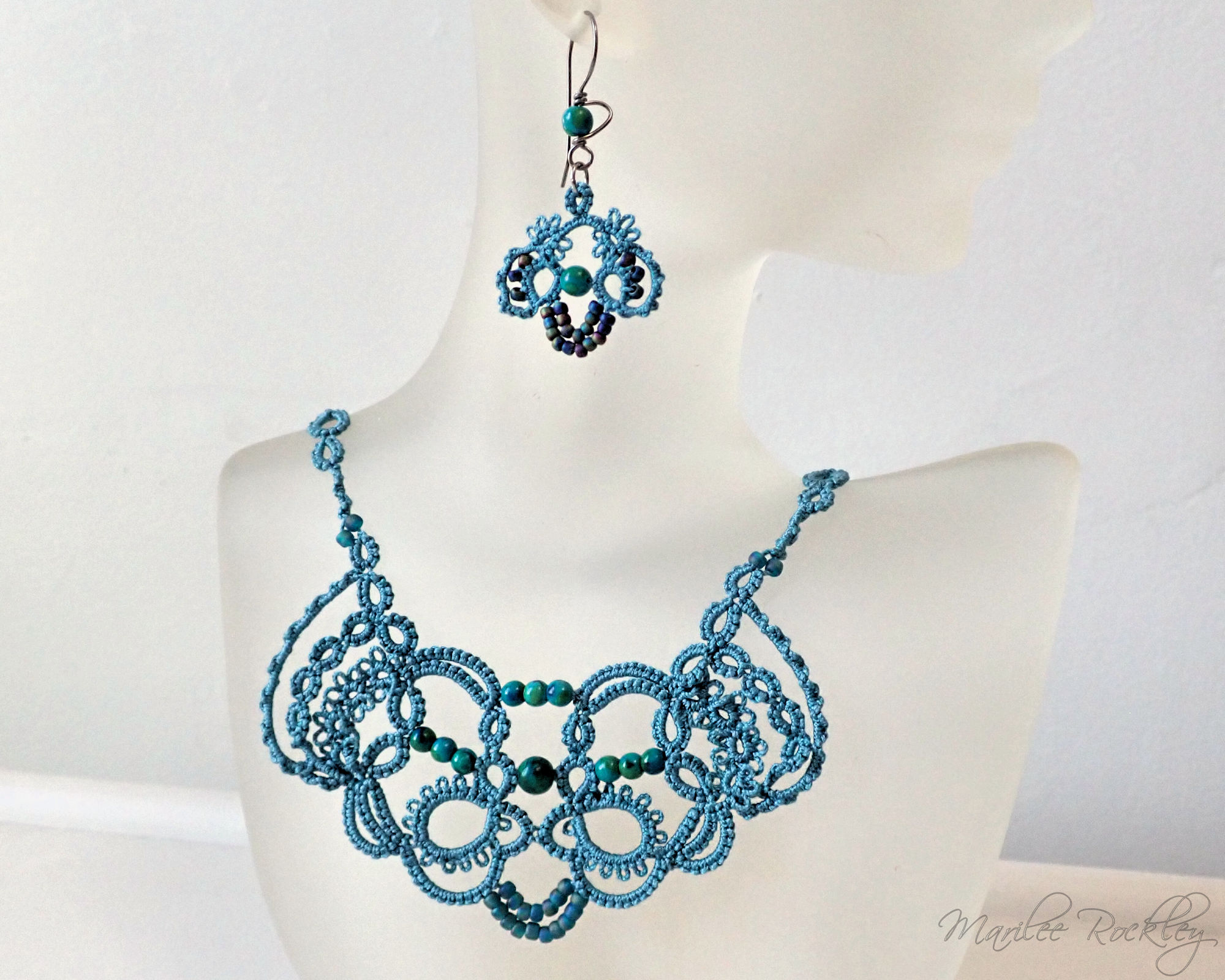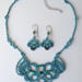 Handmade tatted lace necklace and earrings set with beads from my own design, in patina blue color with teal beads.