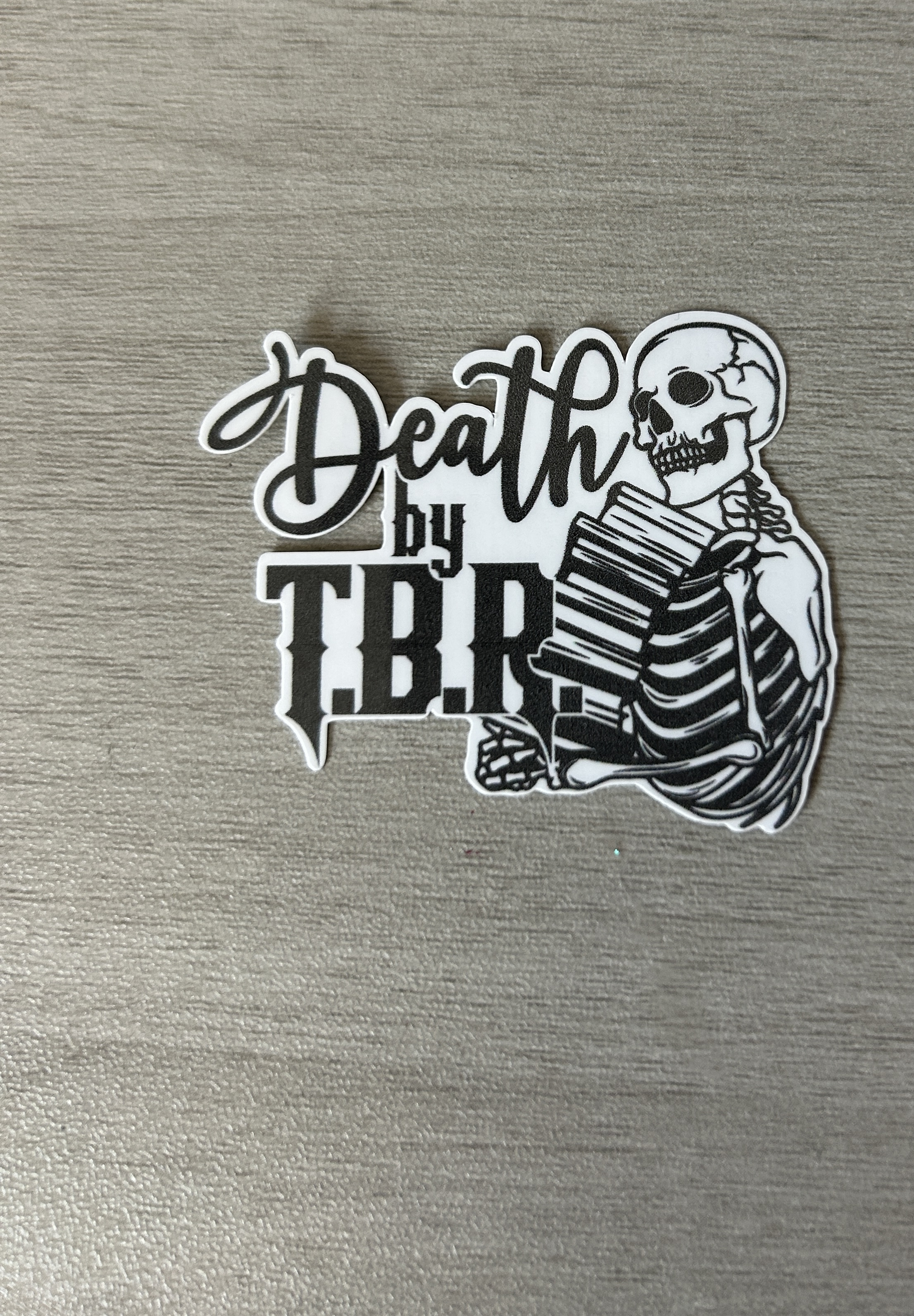 For the book lover buried under a mountain of unread novels—this one’s for you. Featuring a delightfully dramatic skeleton clutching a towering stack of books, this monochrome sticker captures the eternal struggle of every reader: the never-ending To Be Read list. With elegant script and bold lettering, it’s the perfect mix of spooky and relatable. Stick it on your Kindle case, journal, or bookshelf and wear your literary doom with pride.